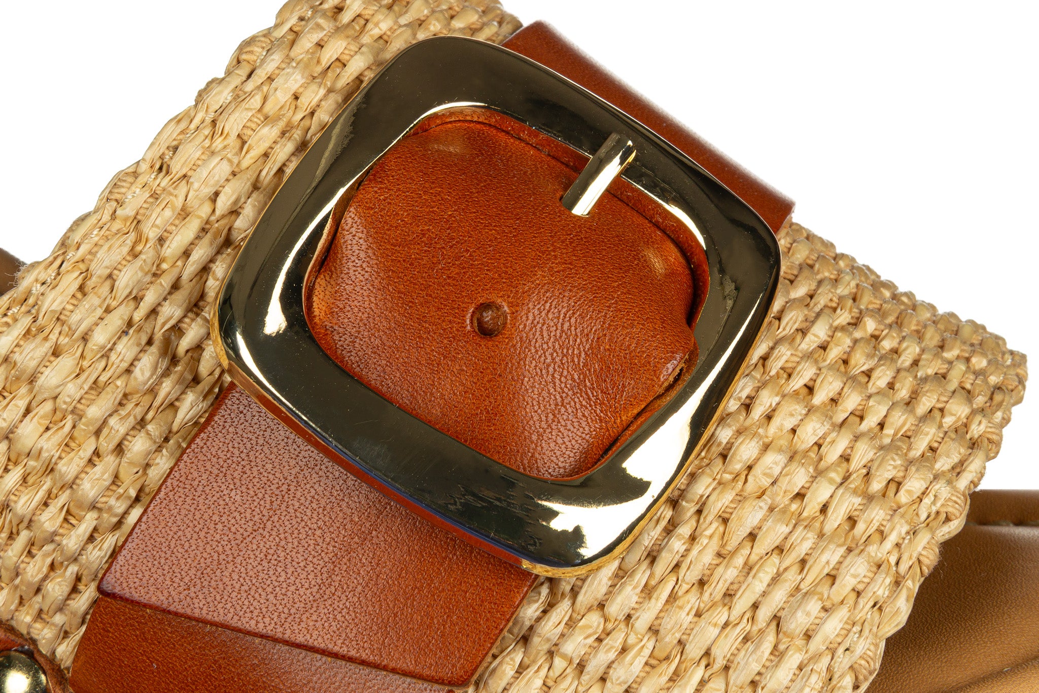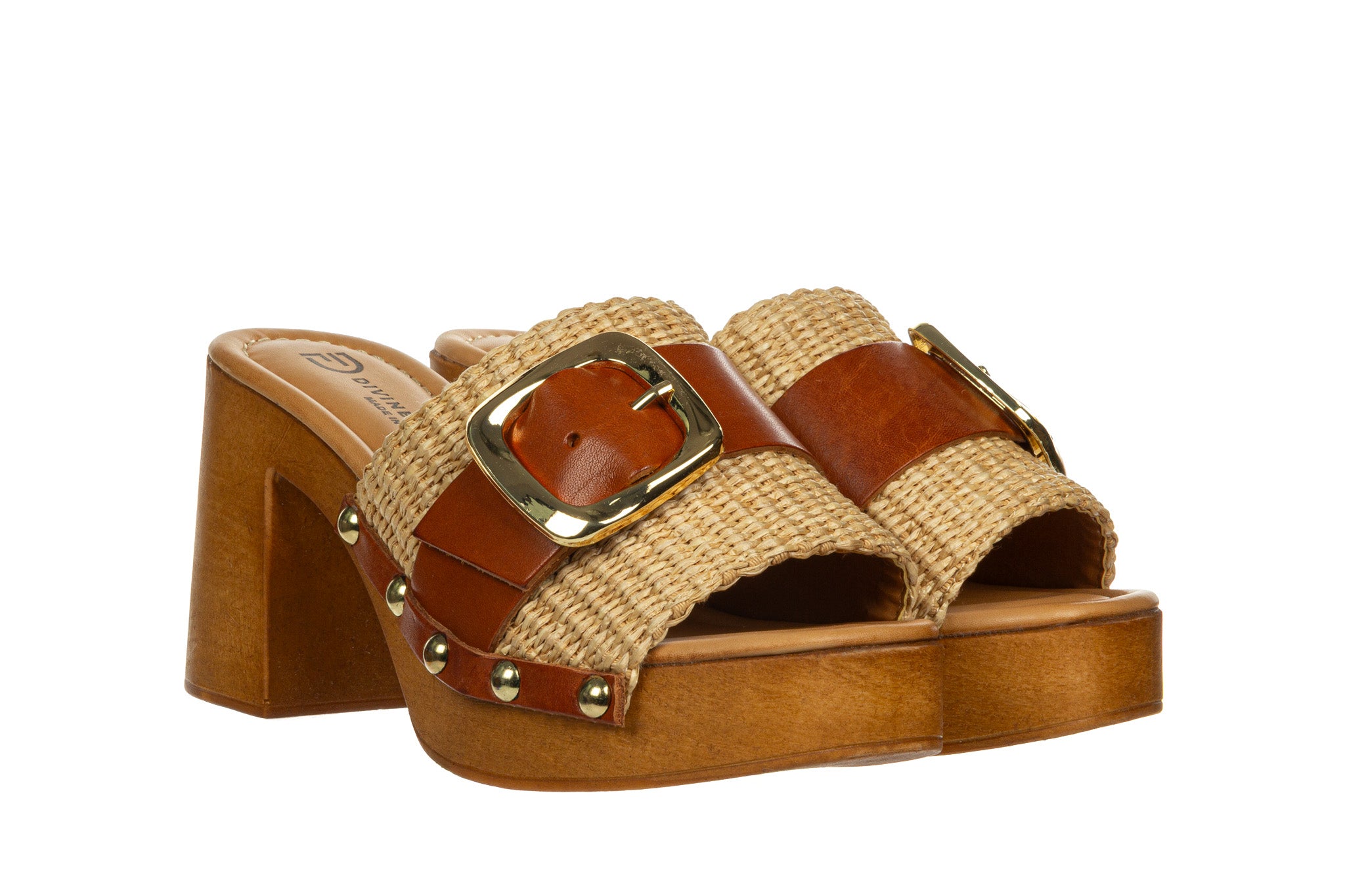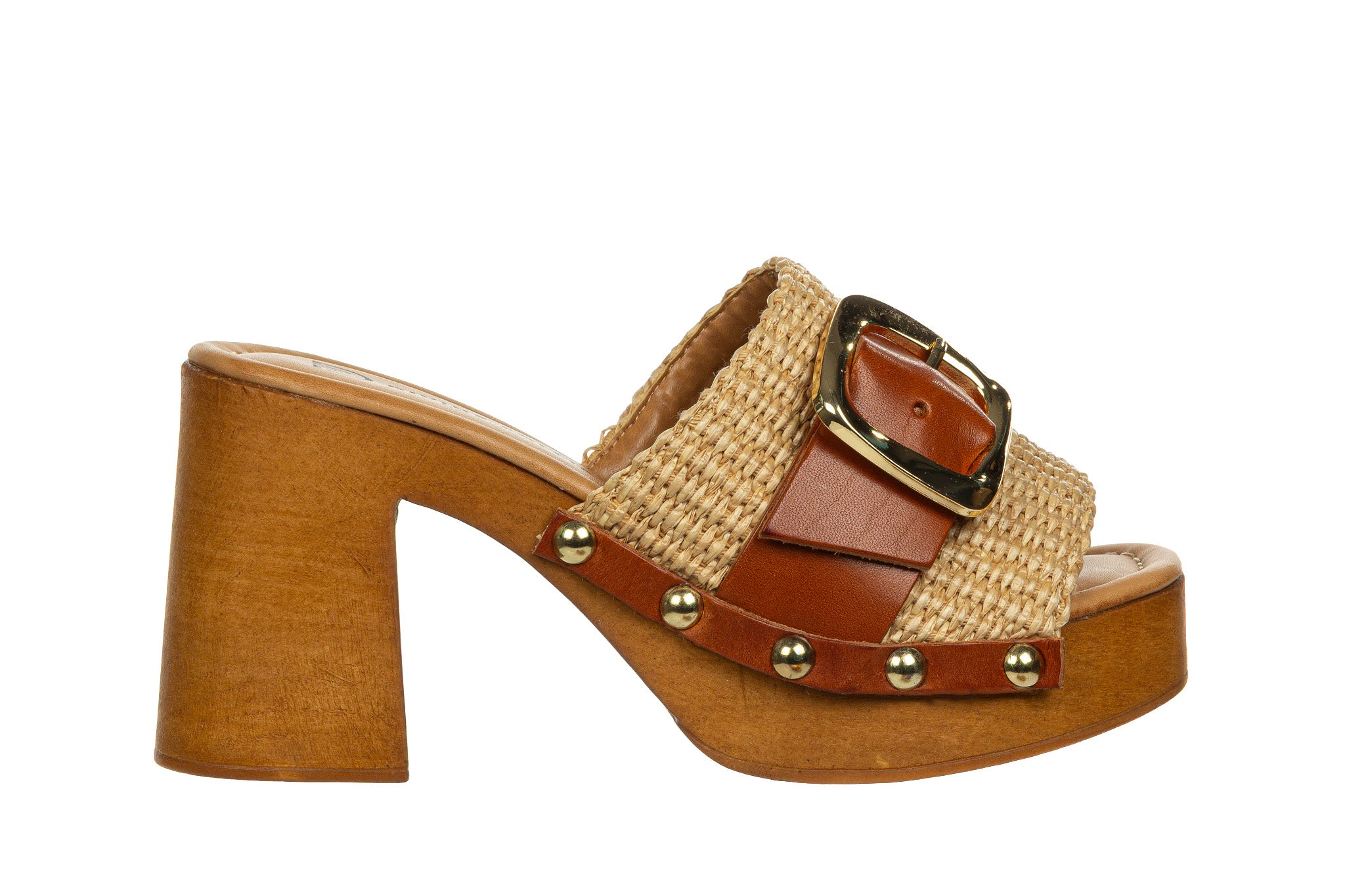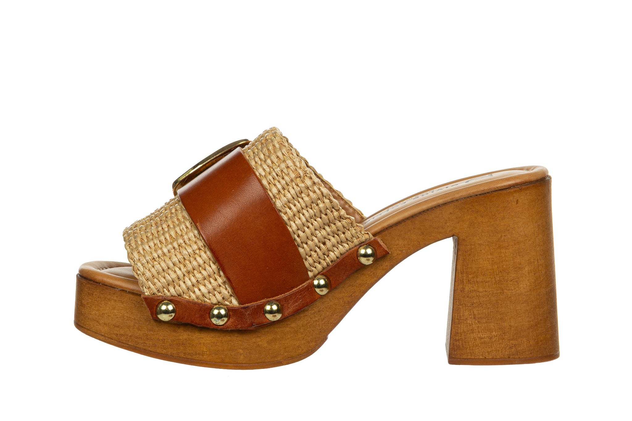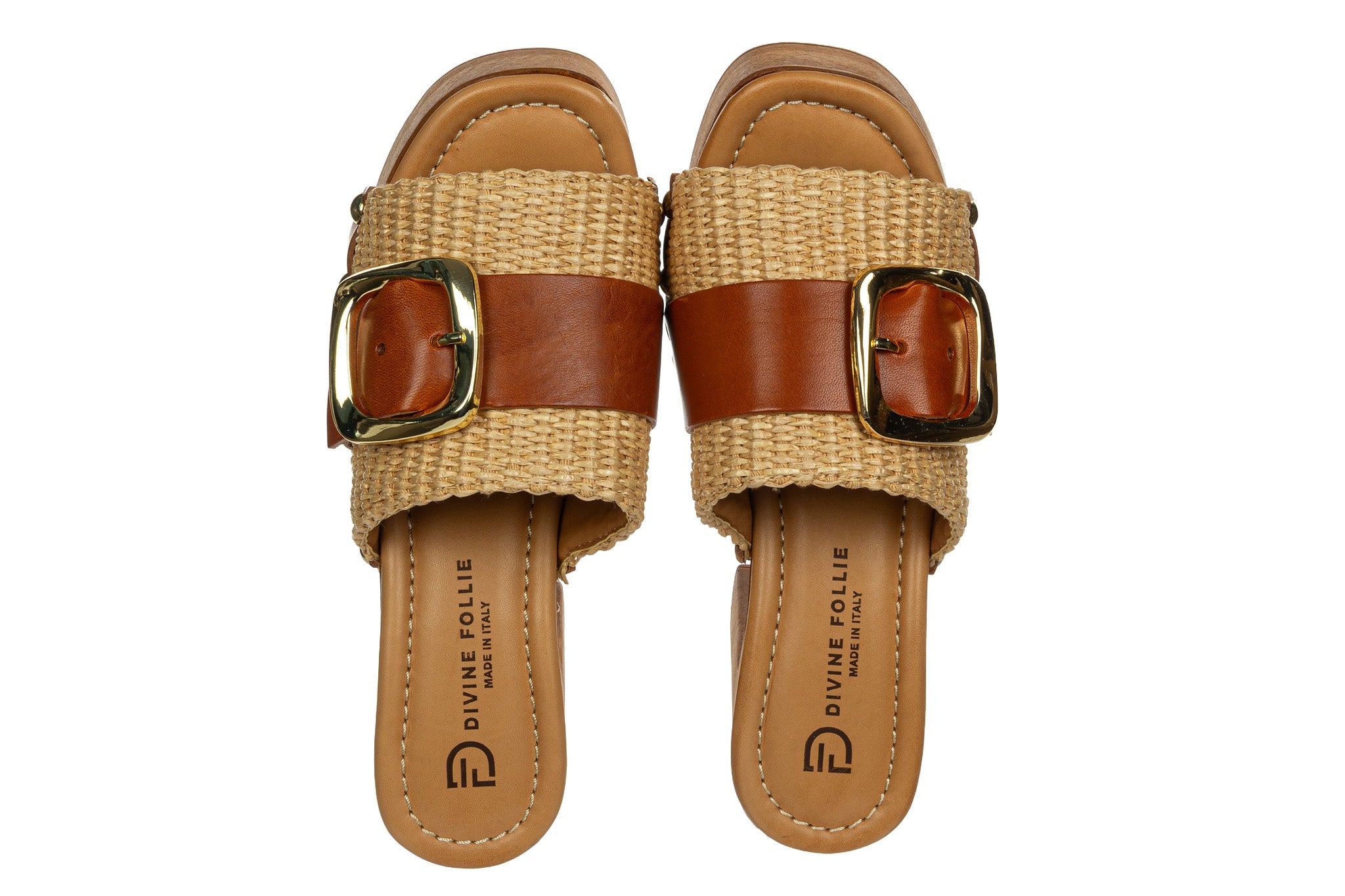 Stylowe klapki damskie w naturalnej, letniej kolorystyce Naturale. Cholewka wykonana z plecionego materiału została uzupełniona szerokim paskiem ze skóry w ciepłym, karmelowym odcieniu oraz dużą, złotą klamrą, która stanowi efektowny akcent.