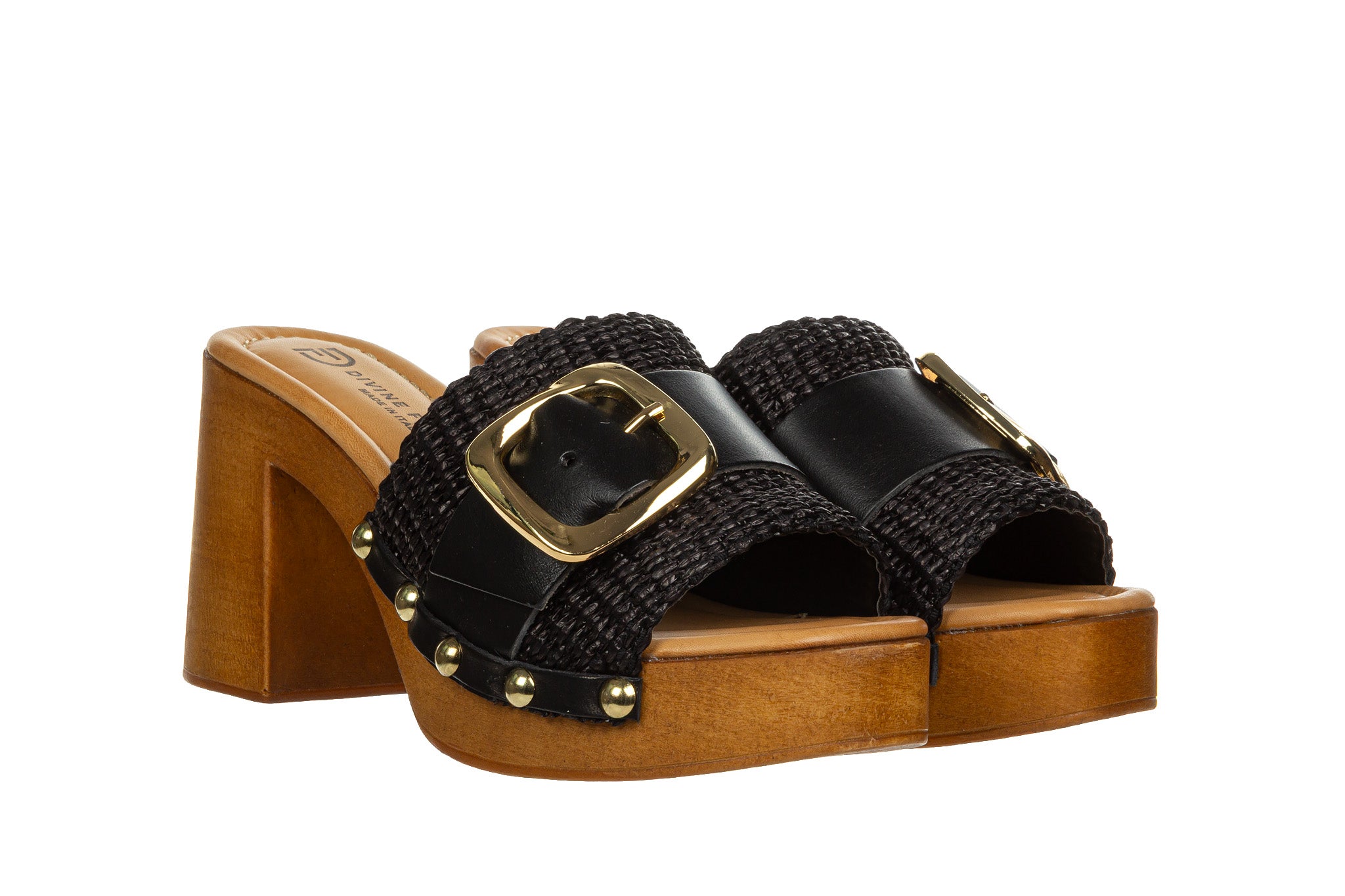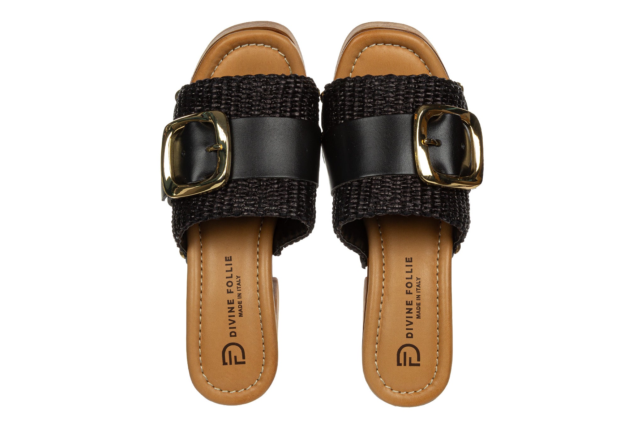 Stylowe klapki damskie w klasycznym czarnym kolorze. Cholewka wykonana z plecionego materiału w czarnym odcieniu została uzupełniona szerokim paskiem ze skóry oraz dużą, złotą klamrą, która stanowi charakterystyczny element dekoracyjny.
