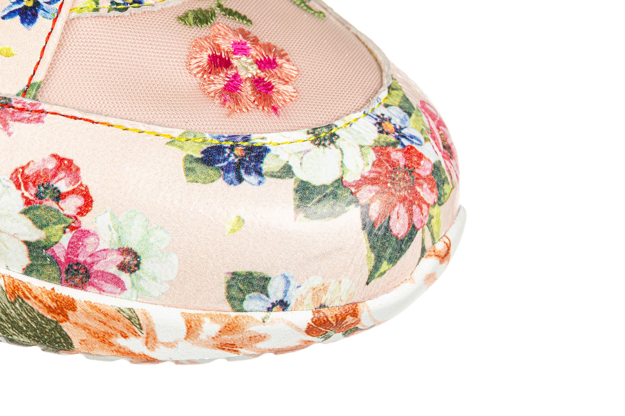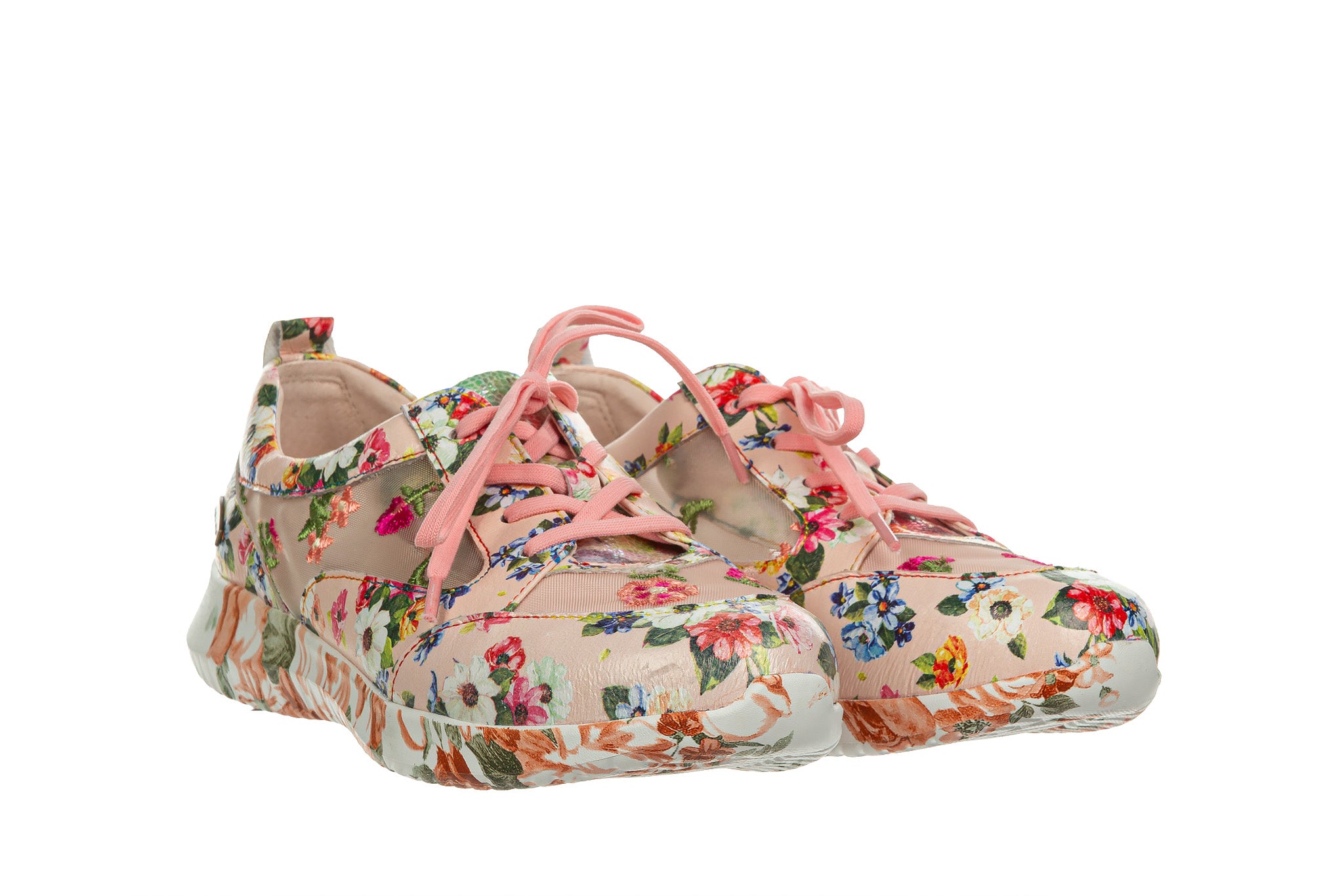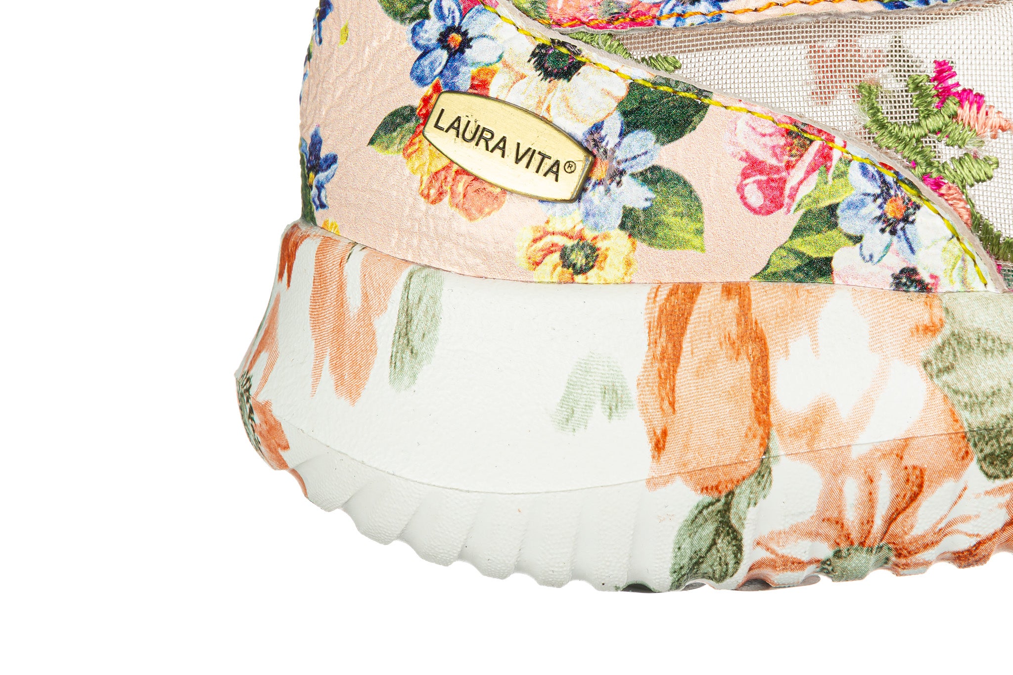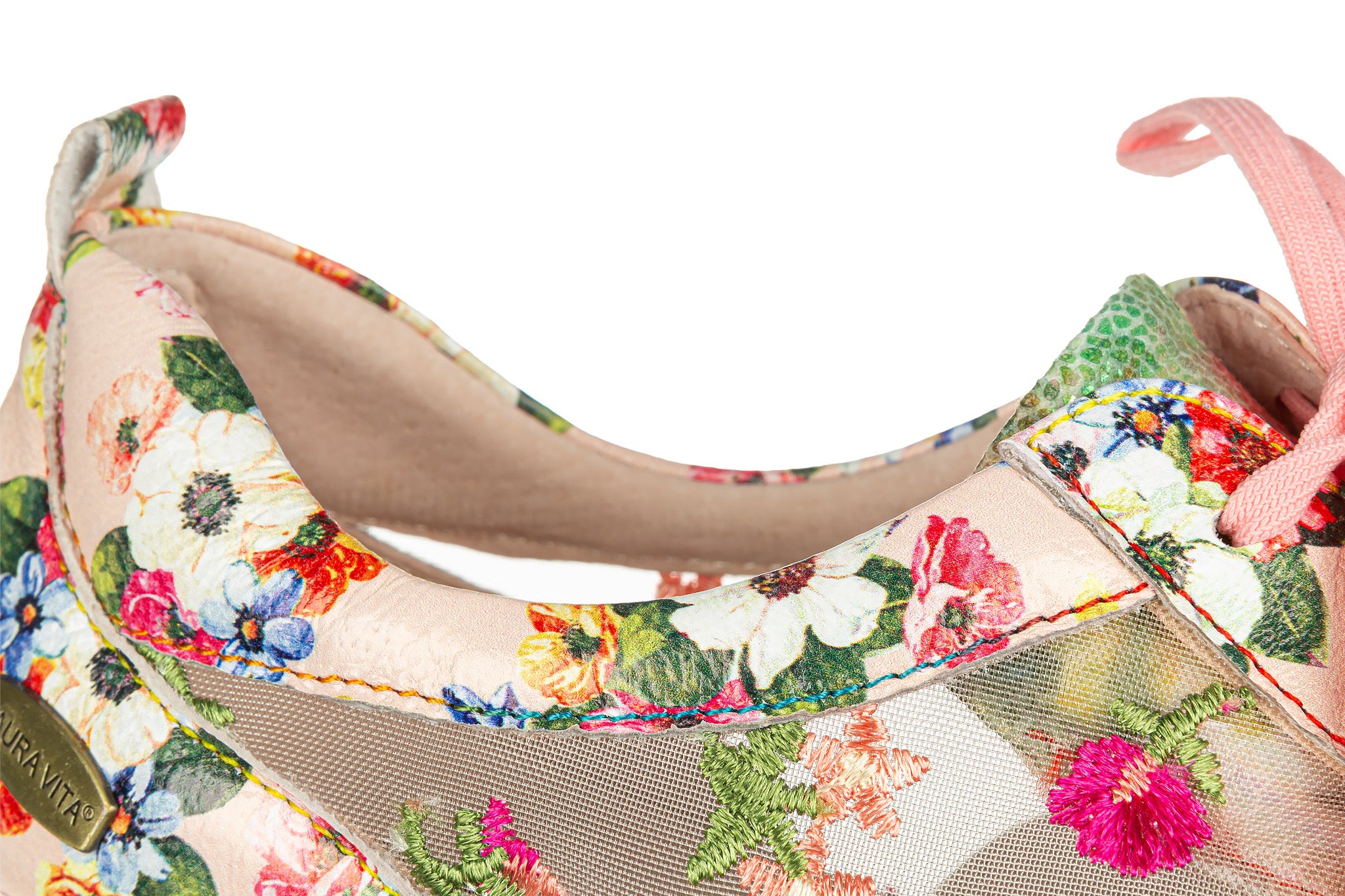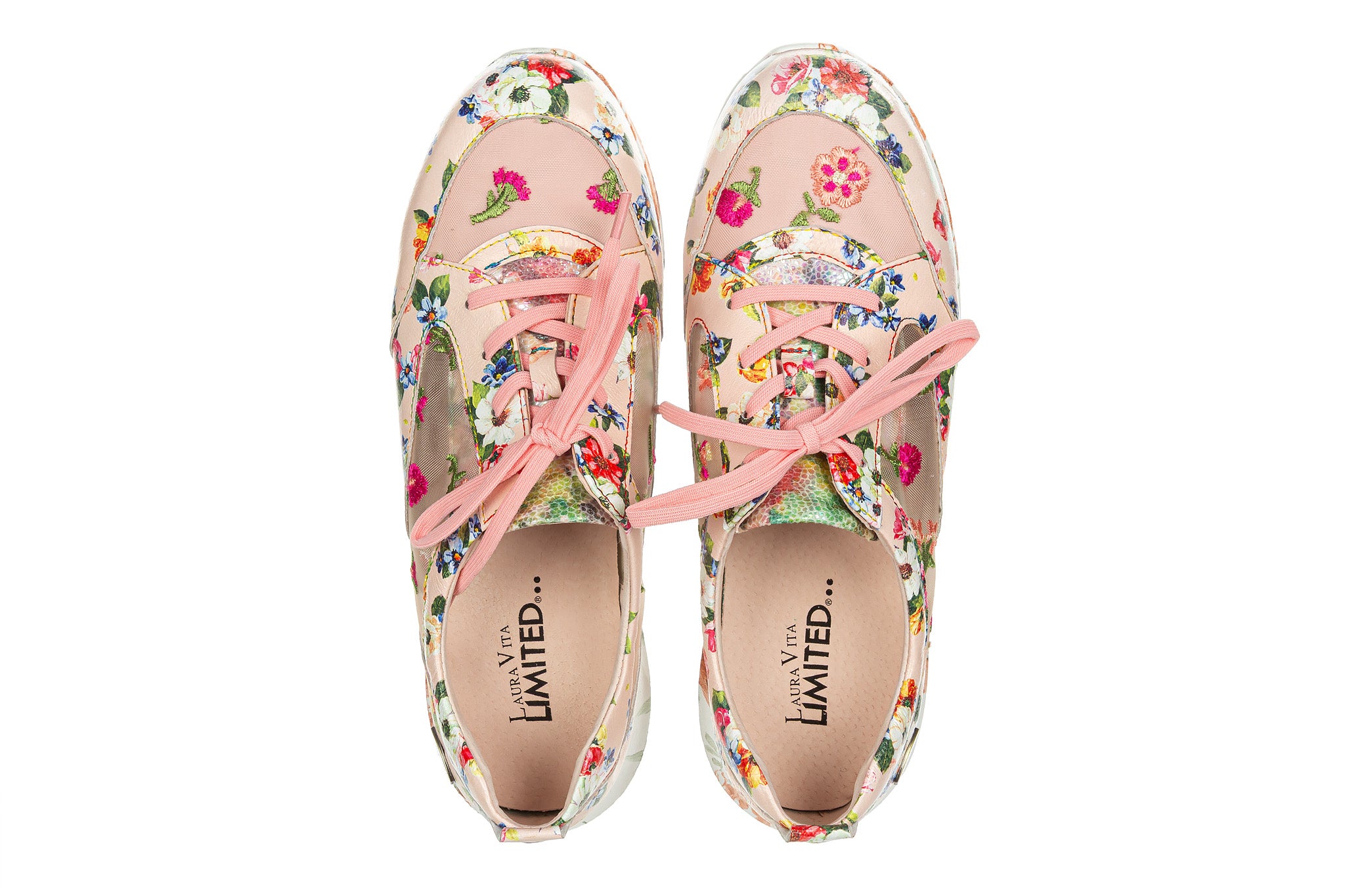 Sneakersy francuskiej marki Laura Vita wielokolorowe z dominującym pudrowym różem, ozdobione subtelnym kwiatowym printem.