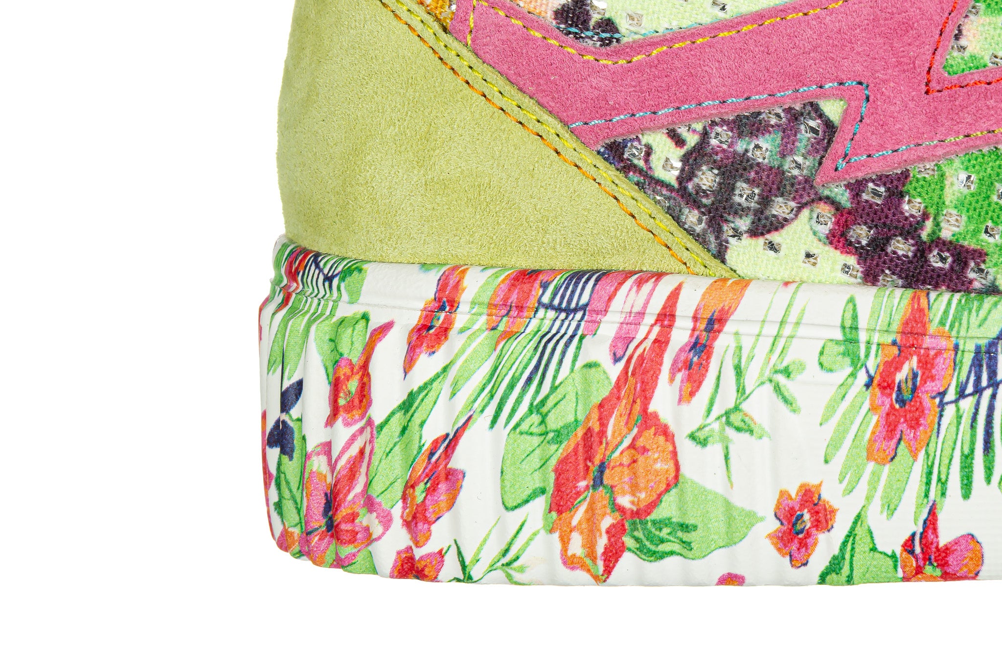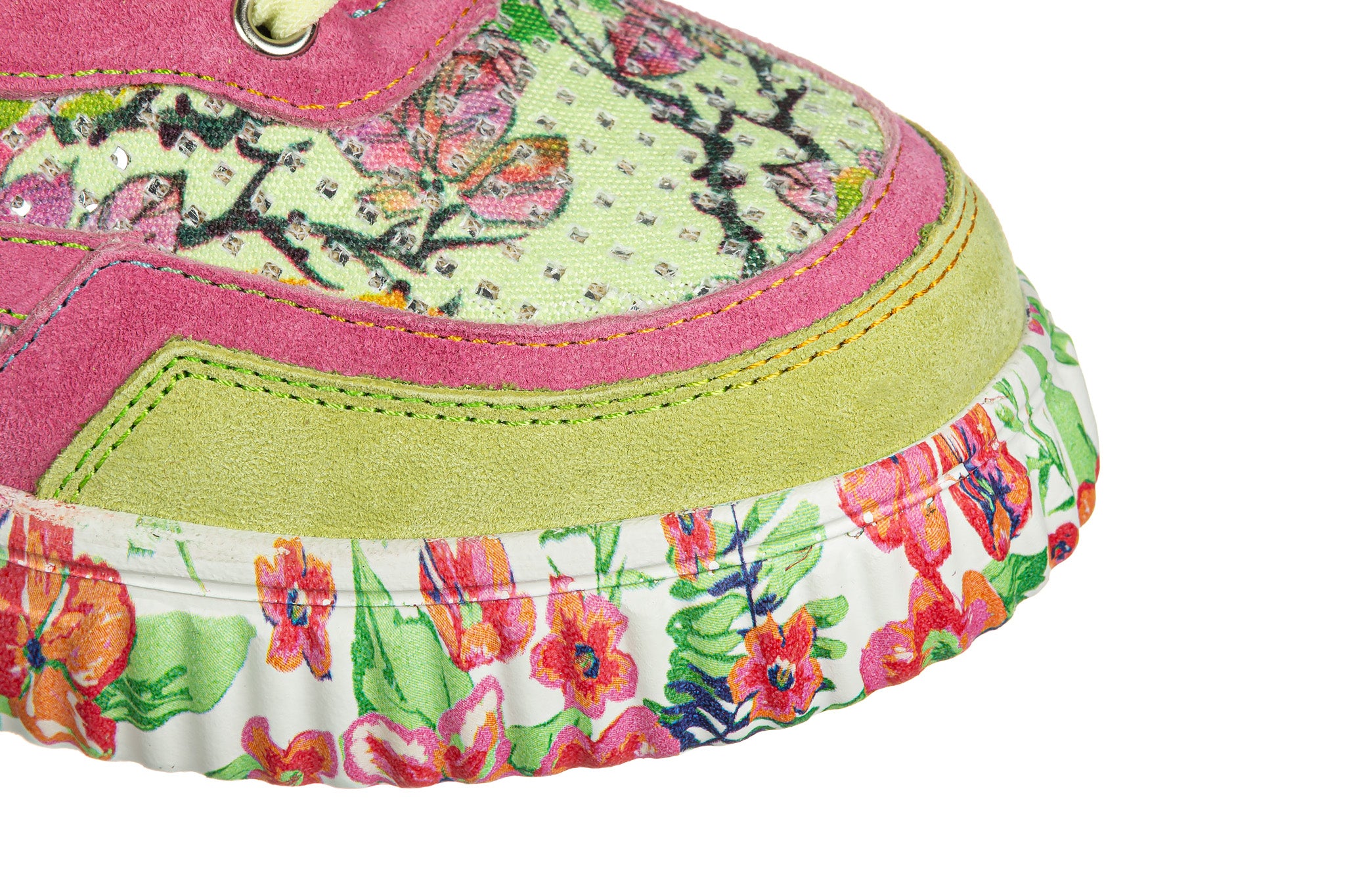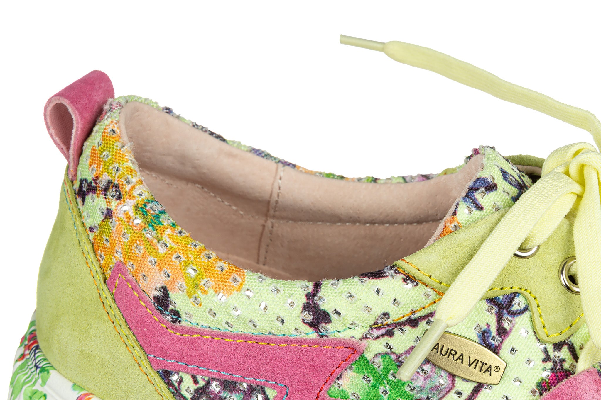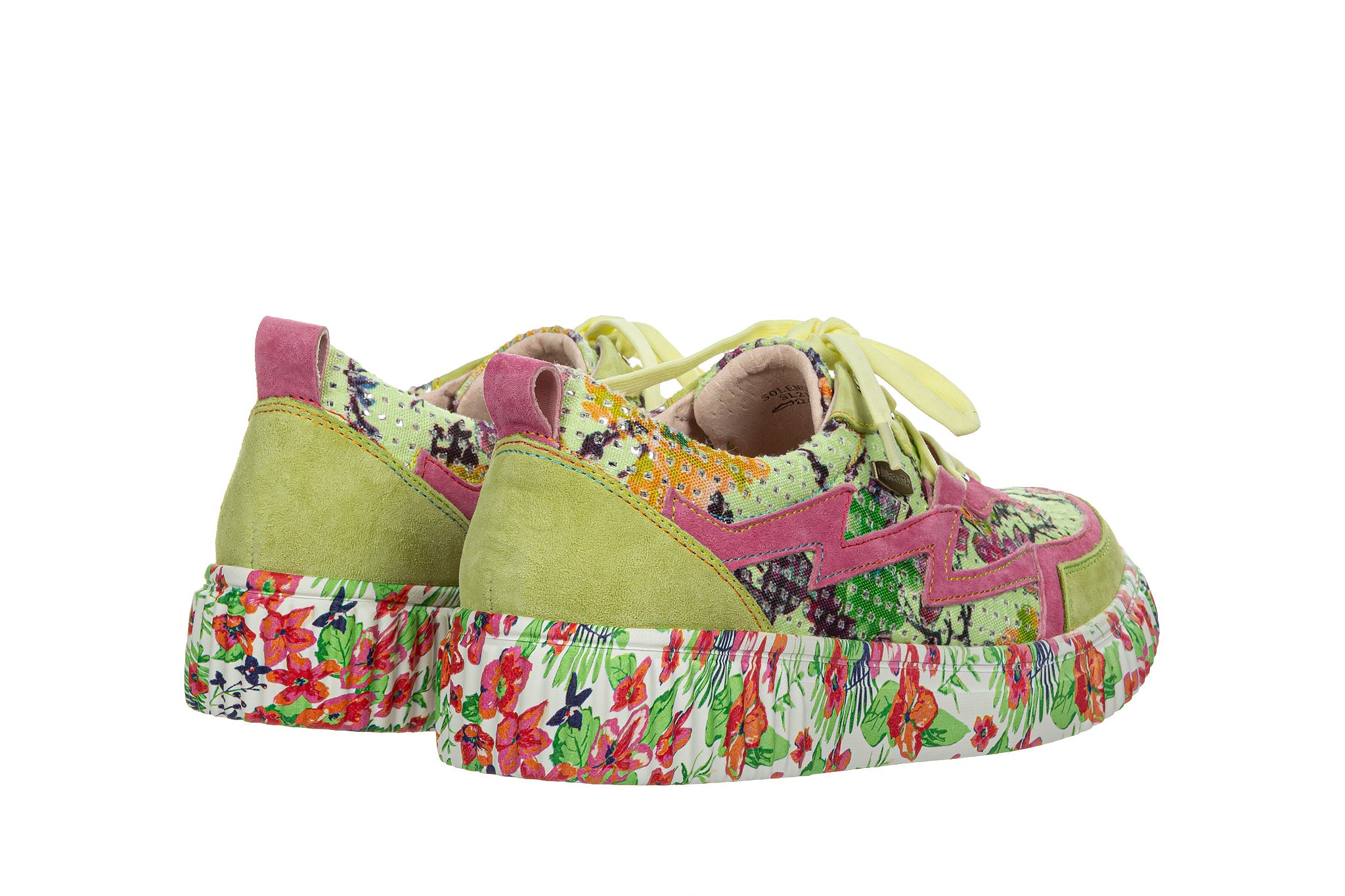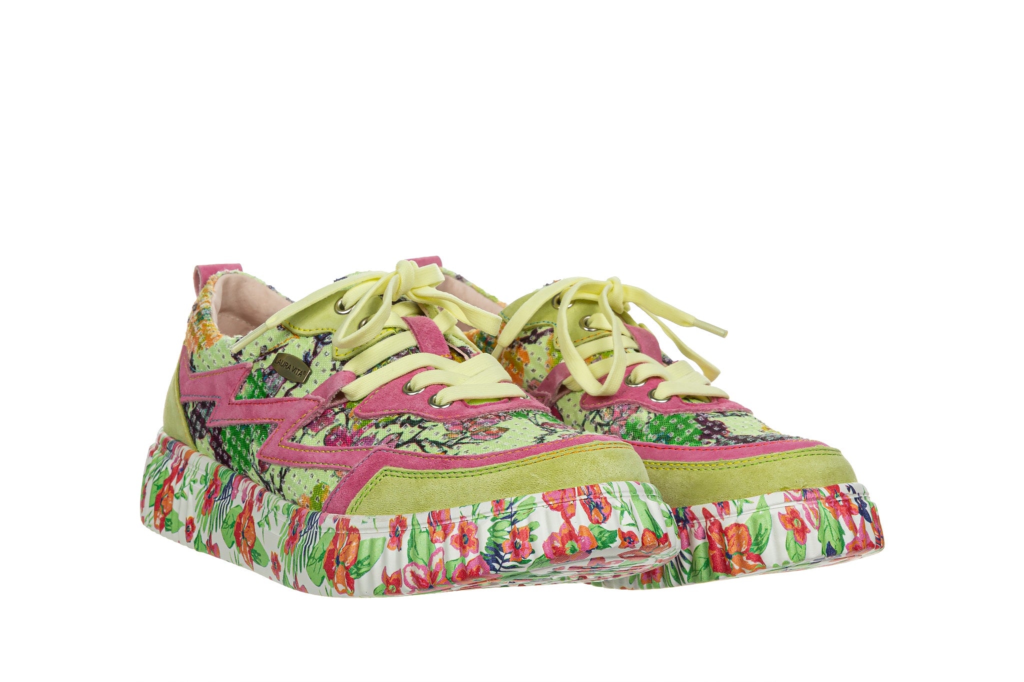 Sneakersy francuskiej marki Laura Vita wielokolorowe z dominującą limonkową zielenią i intensywnym różem oraz kwiatowym wzorem na białej podeszwie.