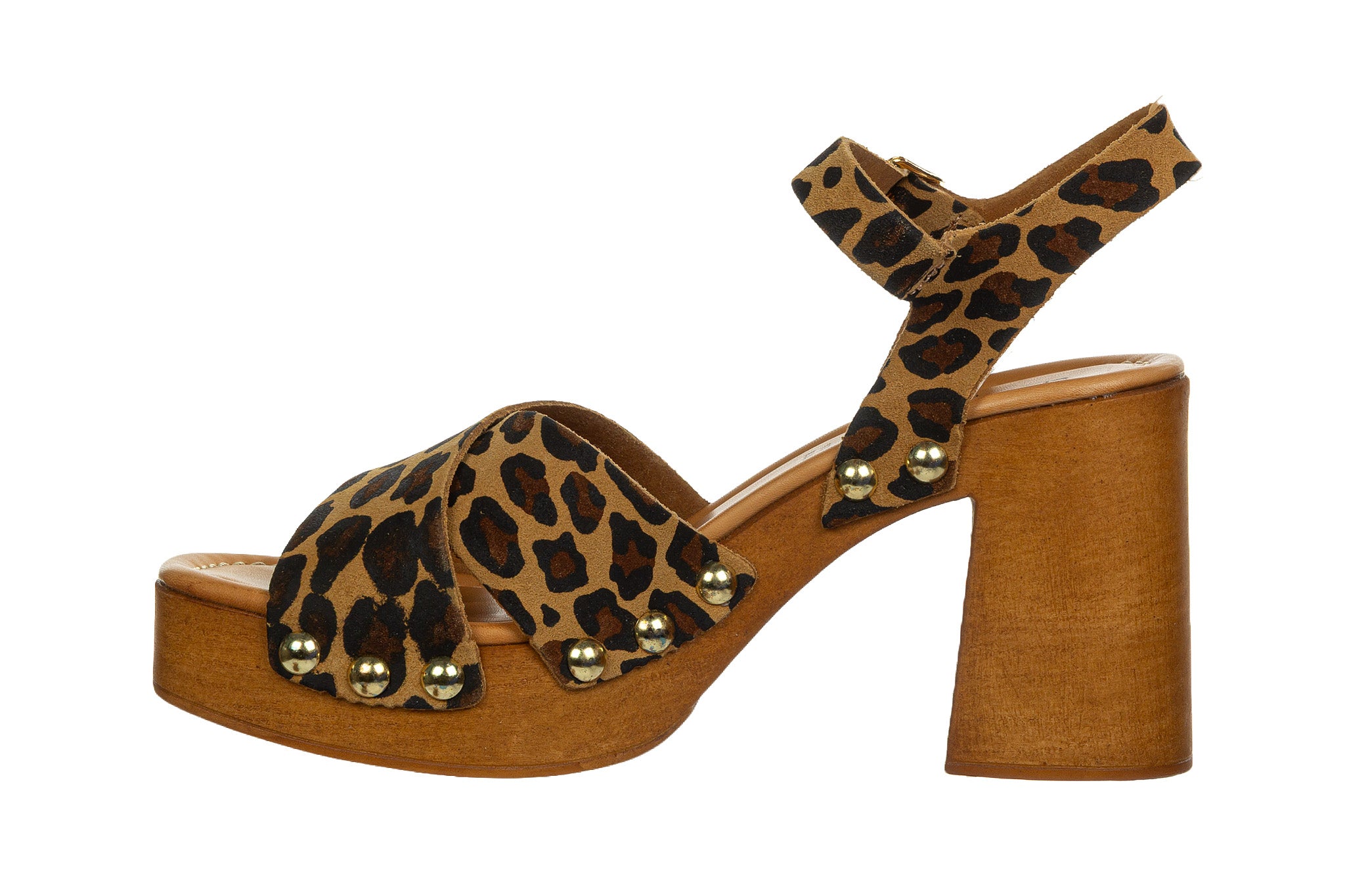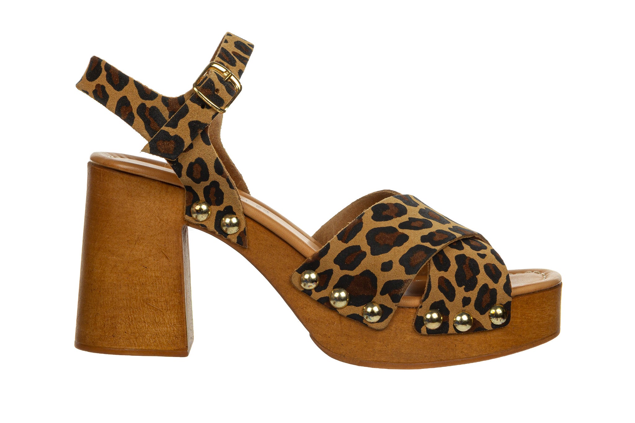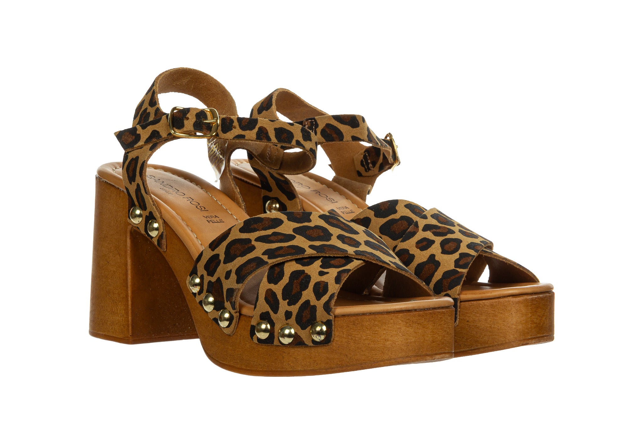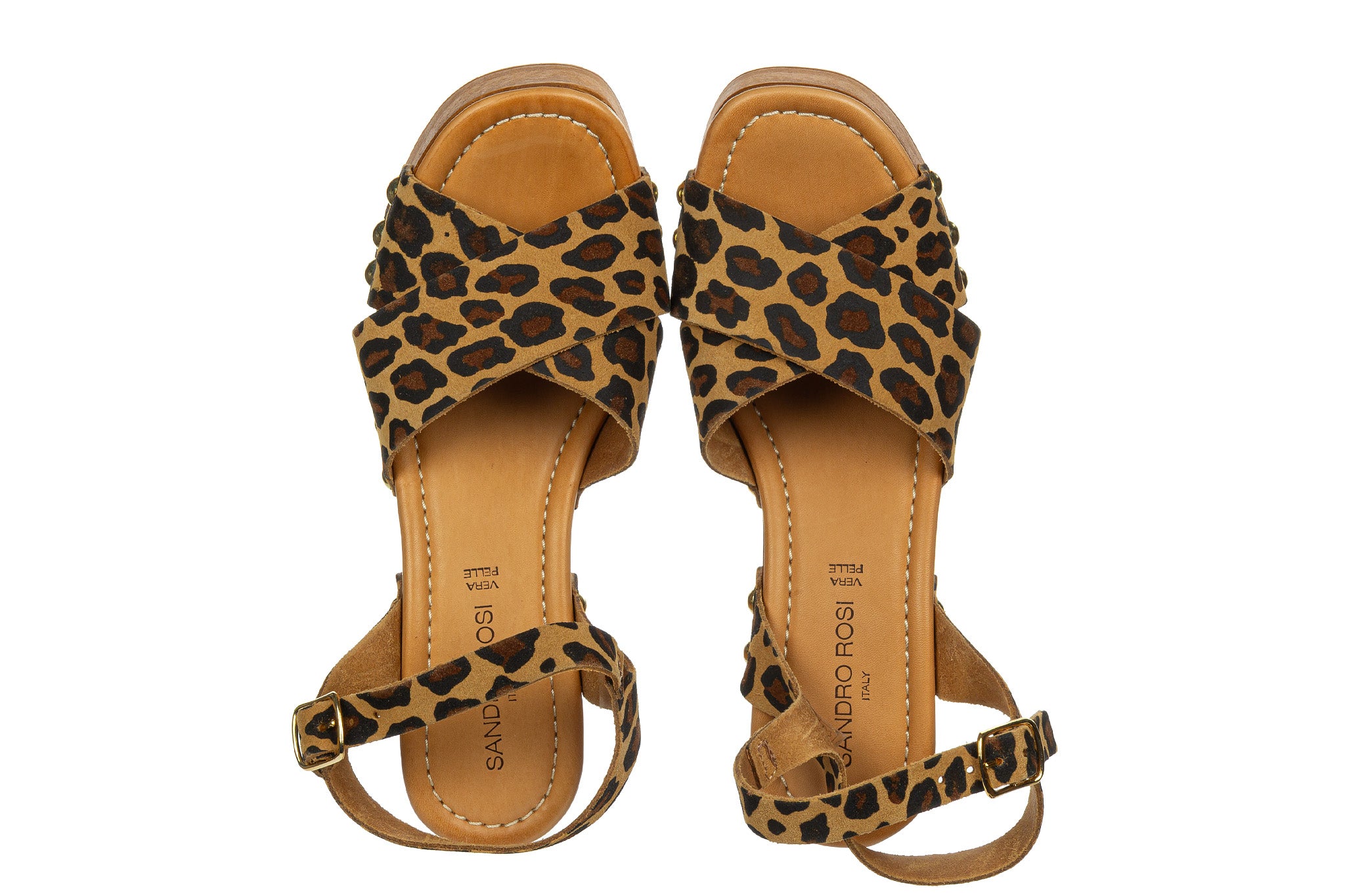 Sandały marki Bayla wykonane przez włoskiego producenta Sandro Rossi w kolorze brązowym ze wzorem w panterkę.