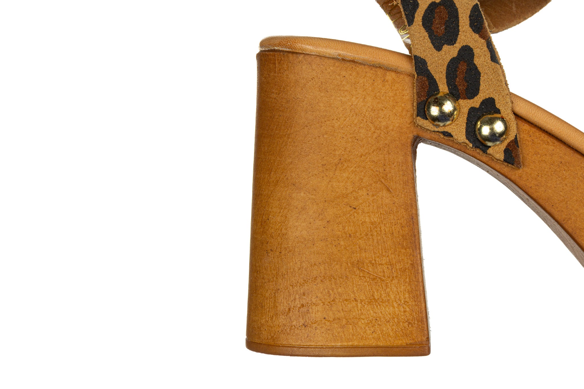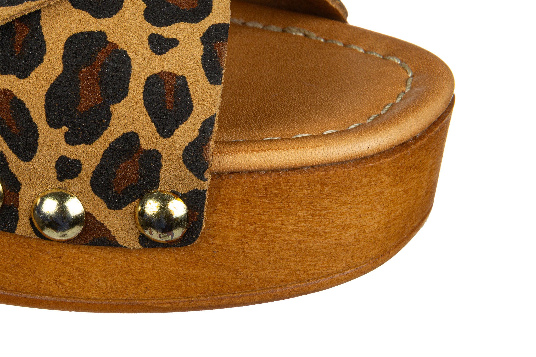Cholewka z naturalnej skóry z motywem animal print została zestawiona z masywną podeszwą w drewnianym stylu.