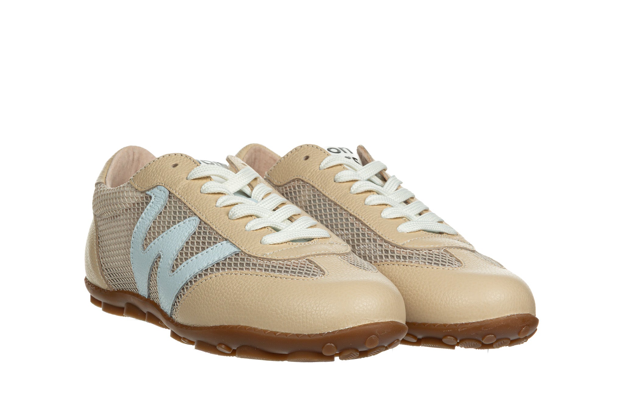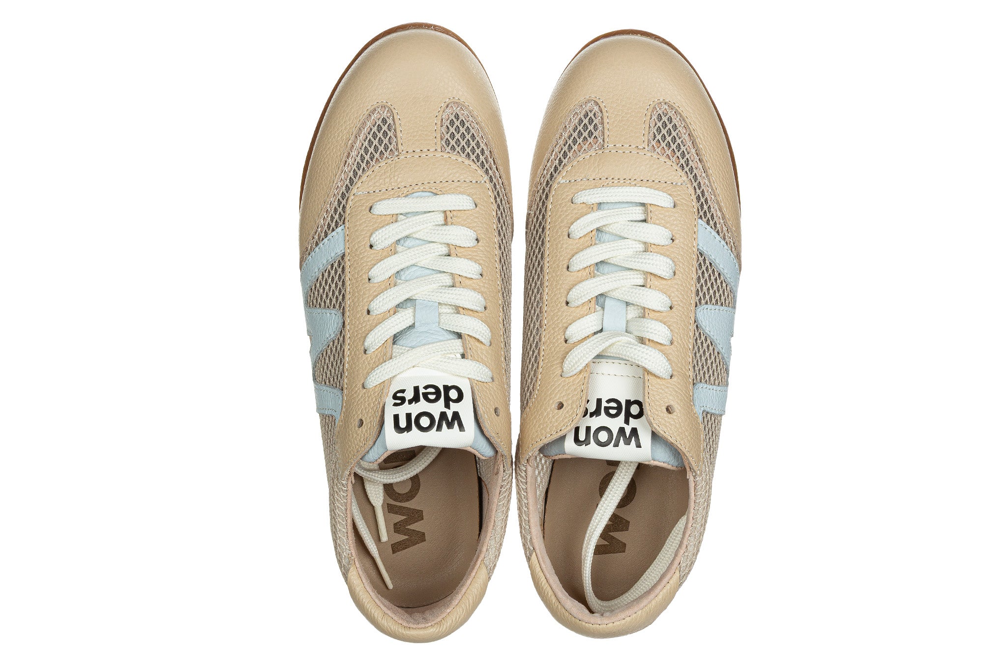 Sneakersy hiszpańskiej marki Wonders w kolorze beżowym z błękitnym elementem.