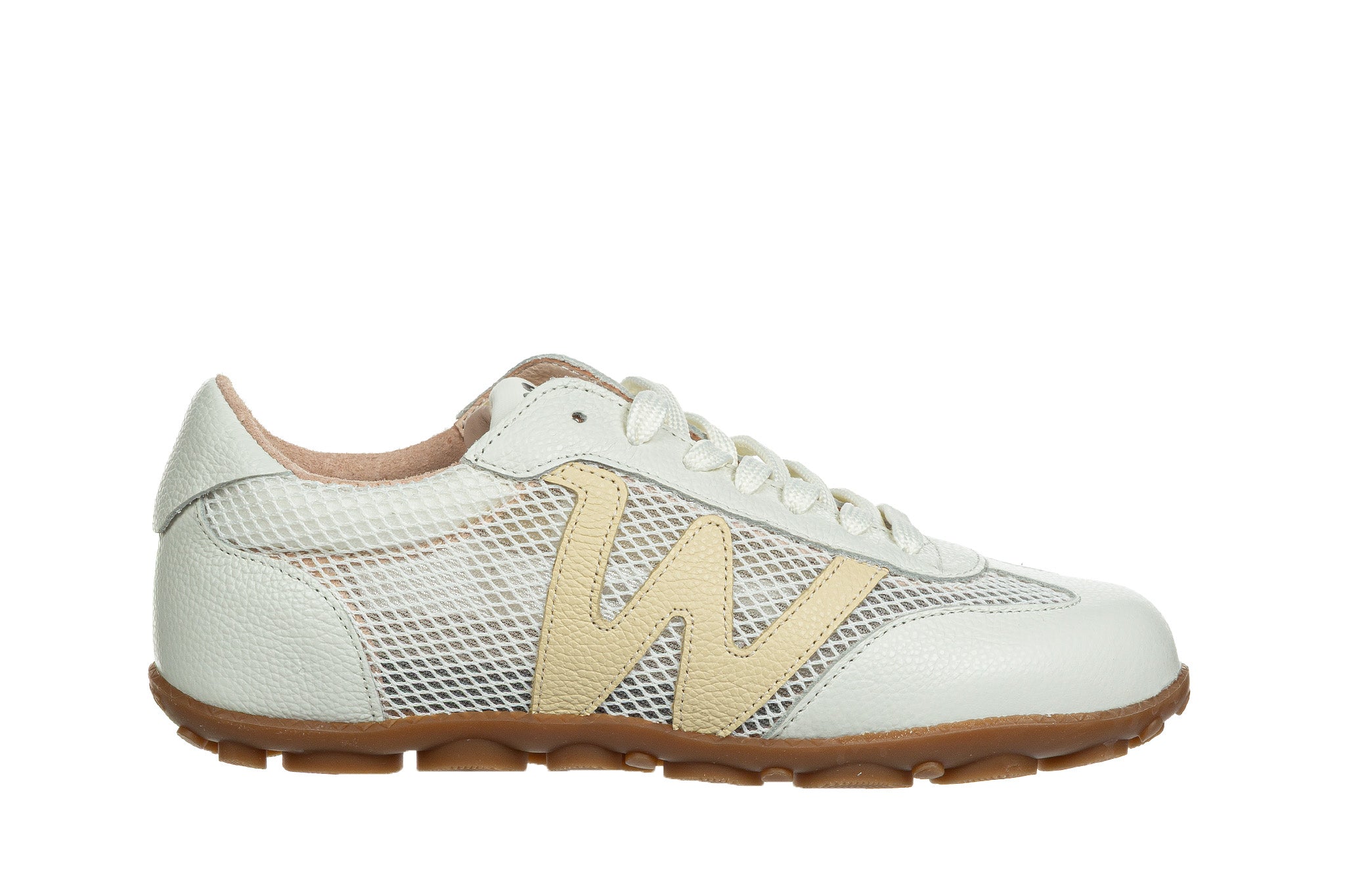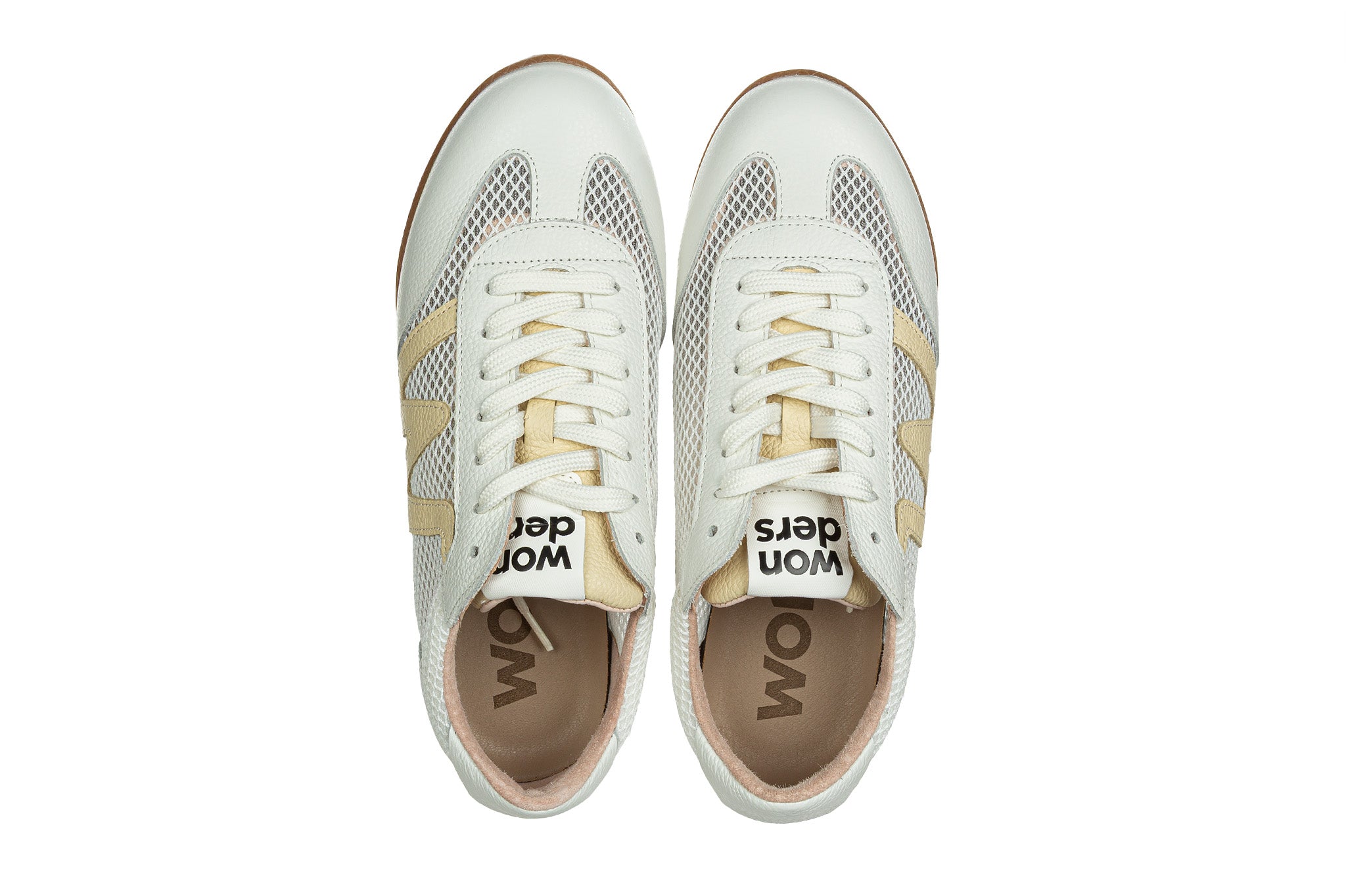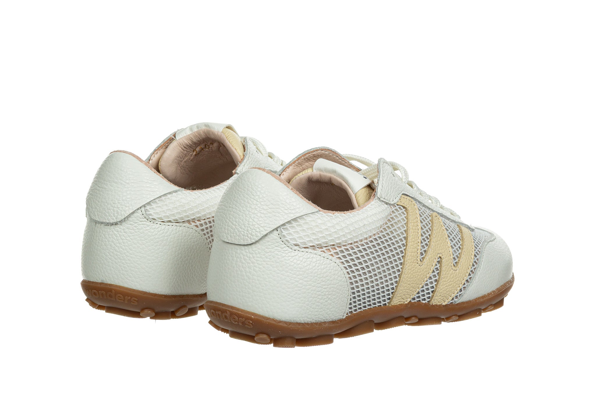 Sneakersy hiszpańskiej marki Wonders w kolorze białym z żółtym elementem.