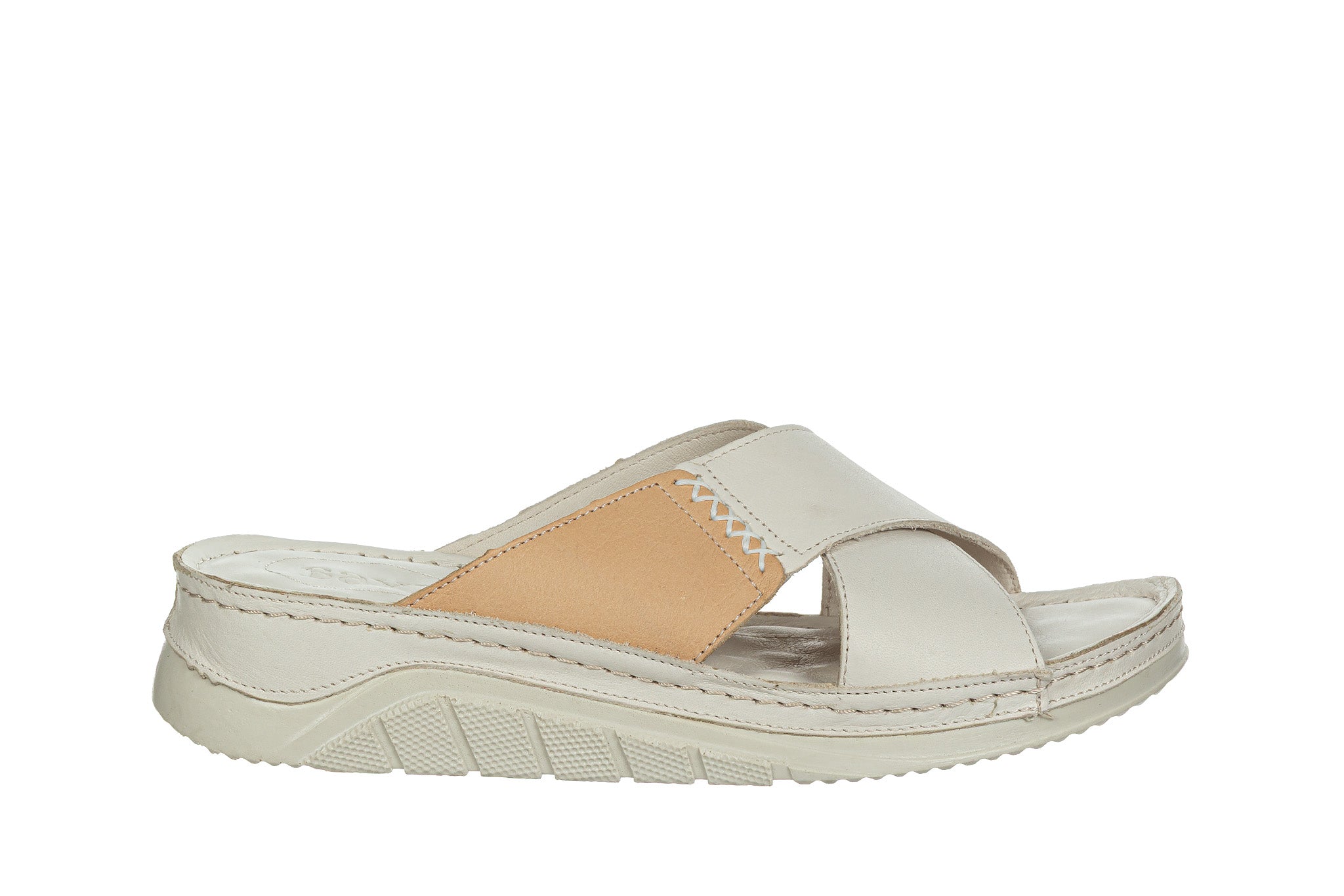 Szerokie, krzyżujące się paski. Miękka oddychająca wkładka. Elastyczna podeszwa.