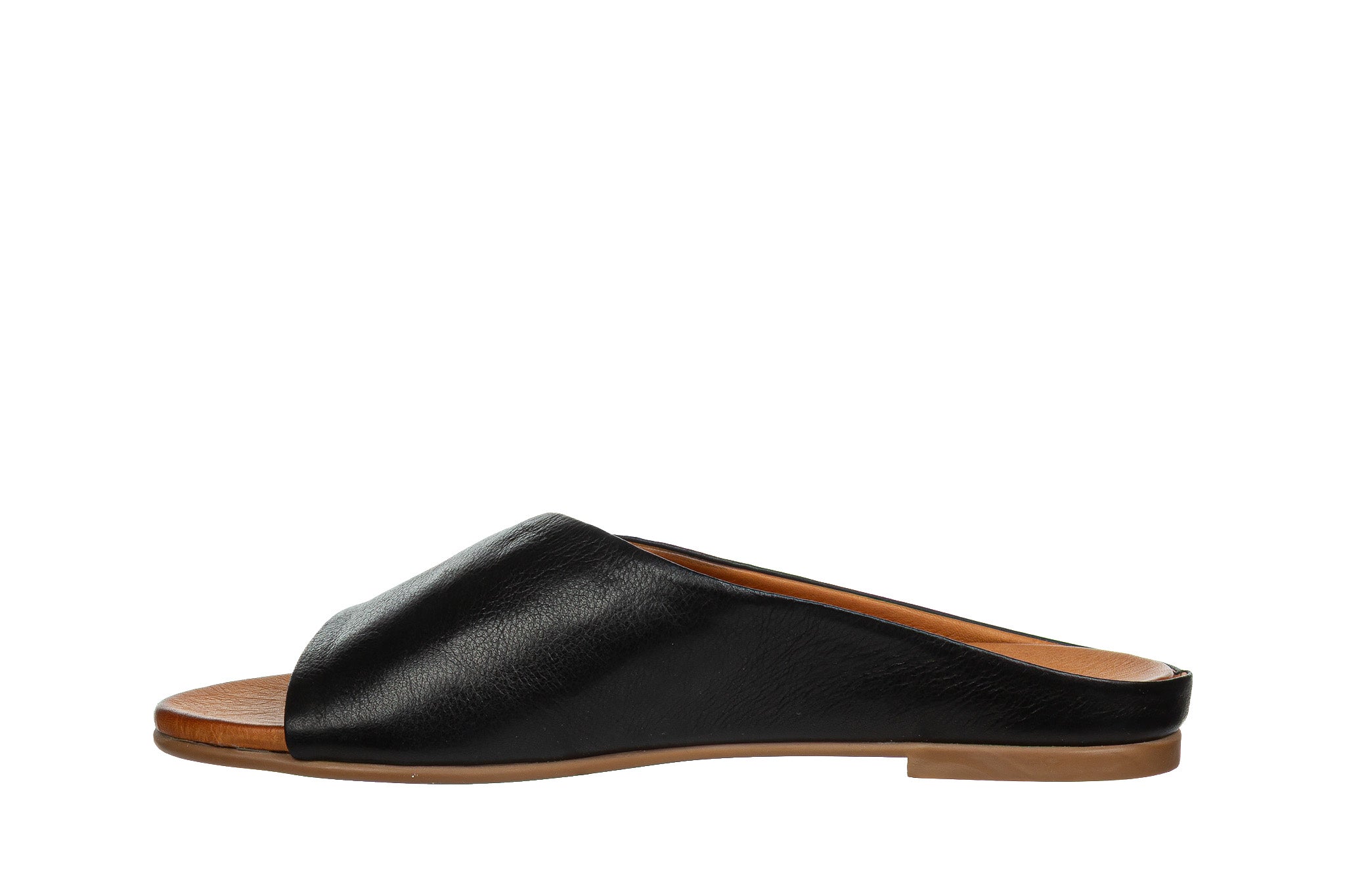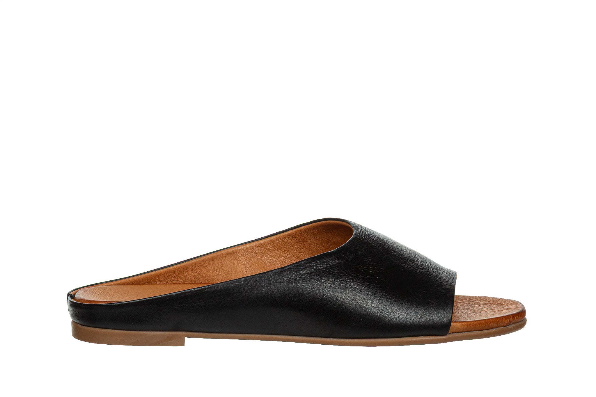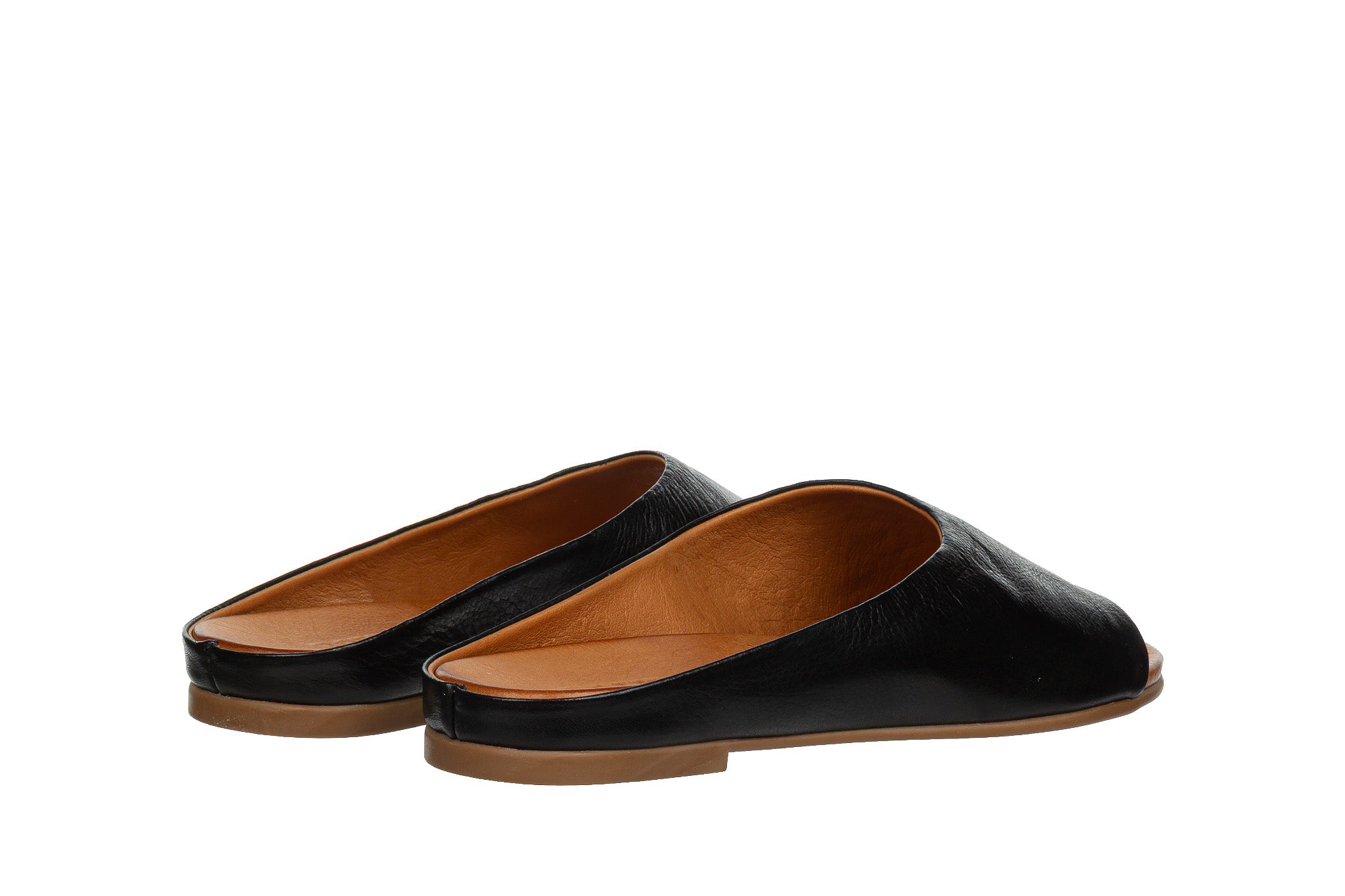 Klapki wykonane z miękkiej skóry naturalnej z delikatnie zabudowaną cholewką z opływowym wykończeniem.