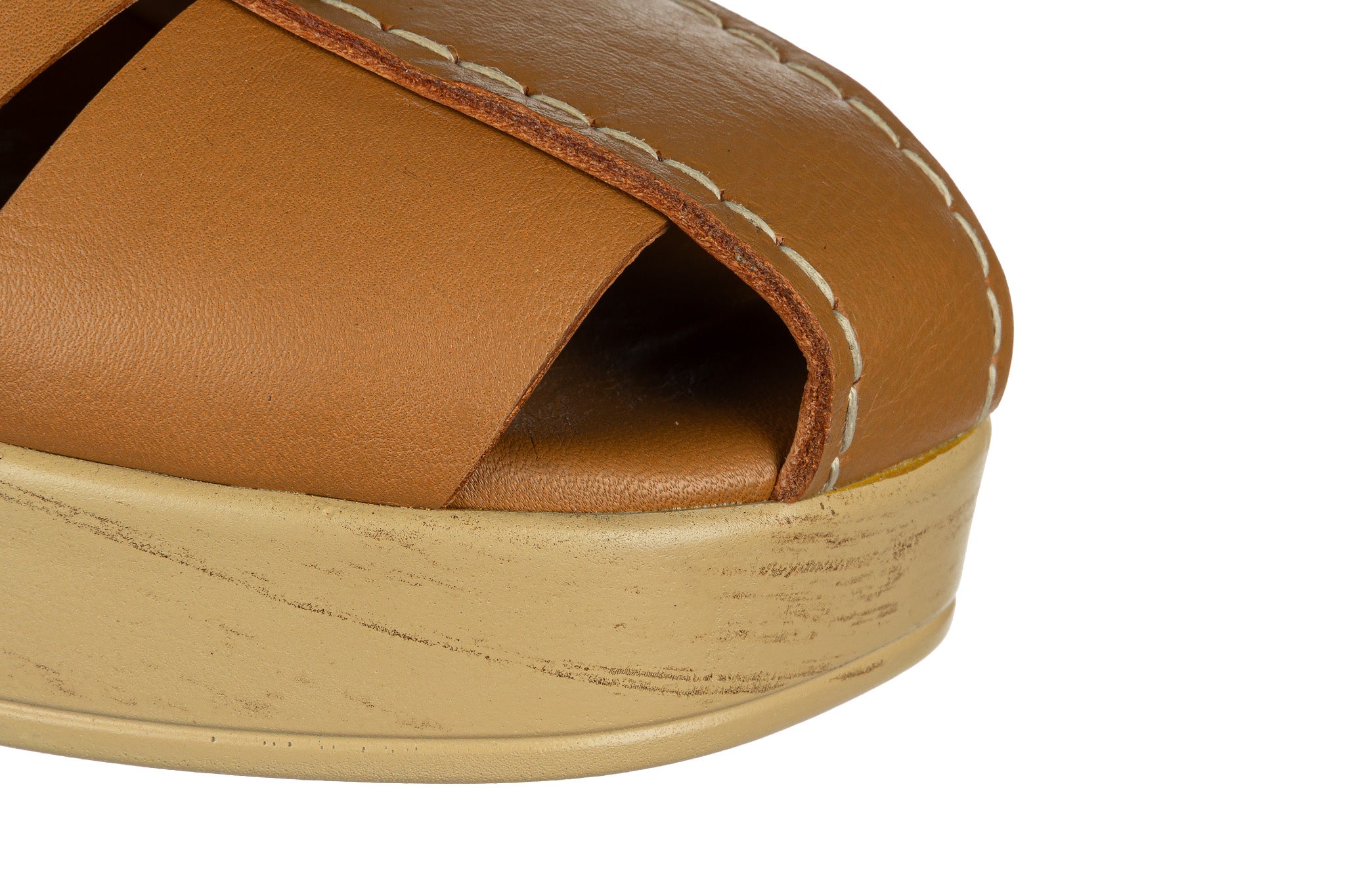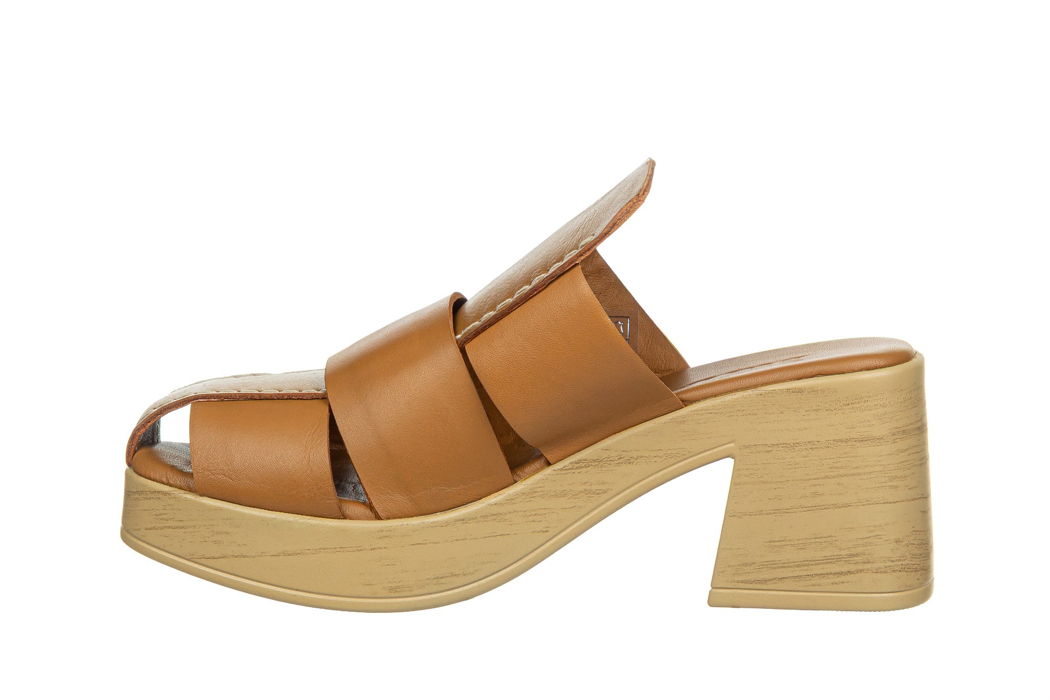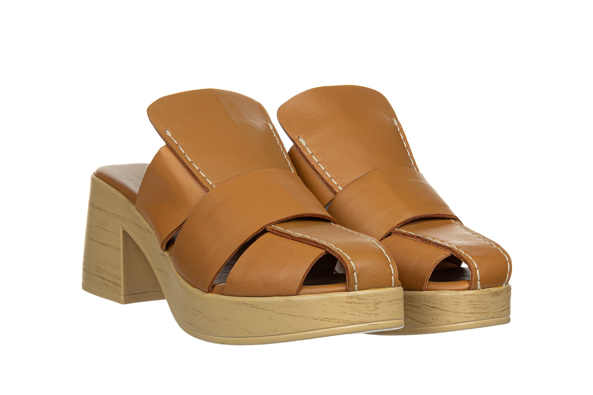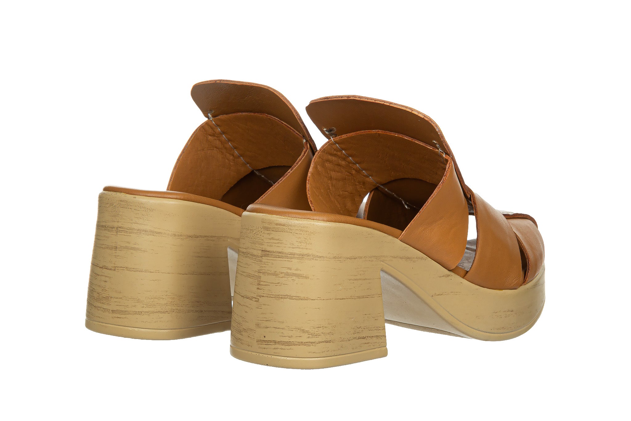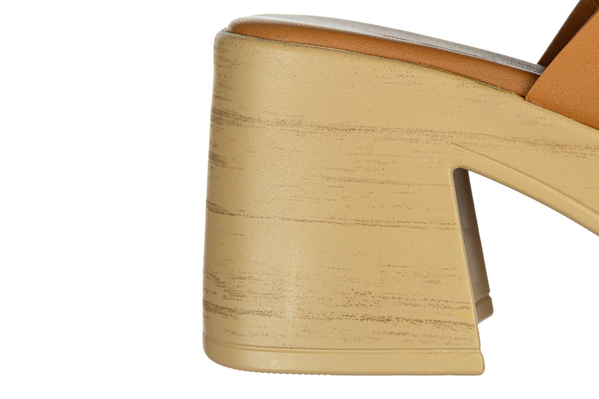 Model osadzony na stabilnym, wyższym obcasie typu platforma, który unosi sylwetkę i zapewnia równowagę. Podeszwa z delikatnym, wizualnym efektem przetarcia nadaje naturalnego charakteru.