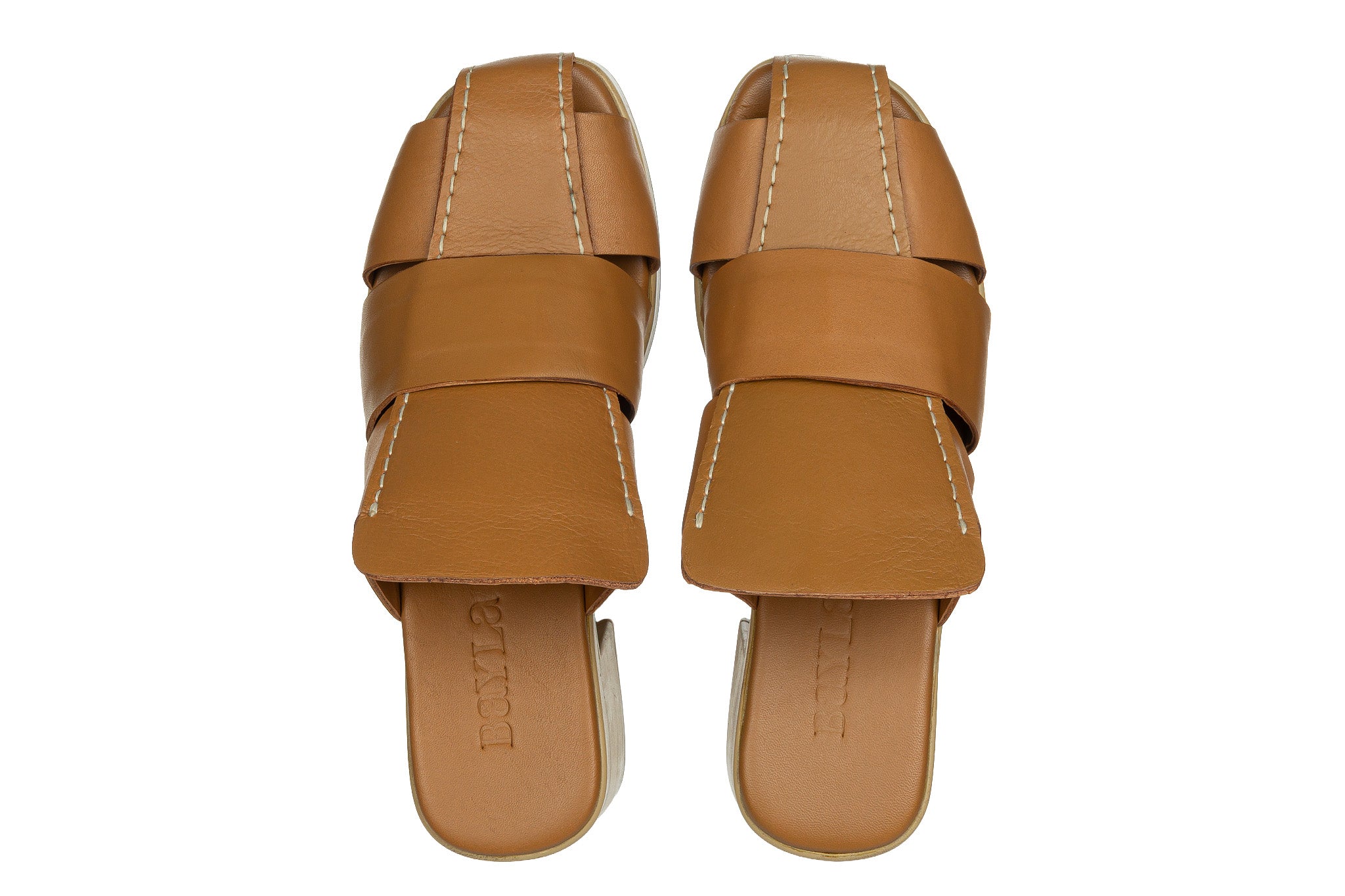 Klapki wykonane z miękkiej skóry naturalnej z szerokimi paskami o prostym, geometrycznym układzie.