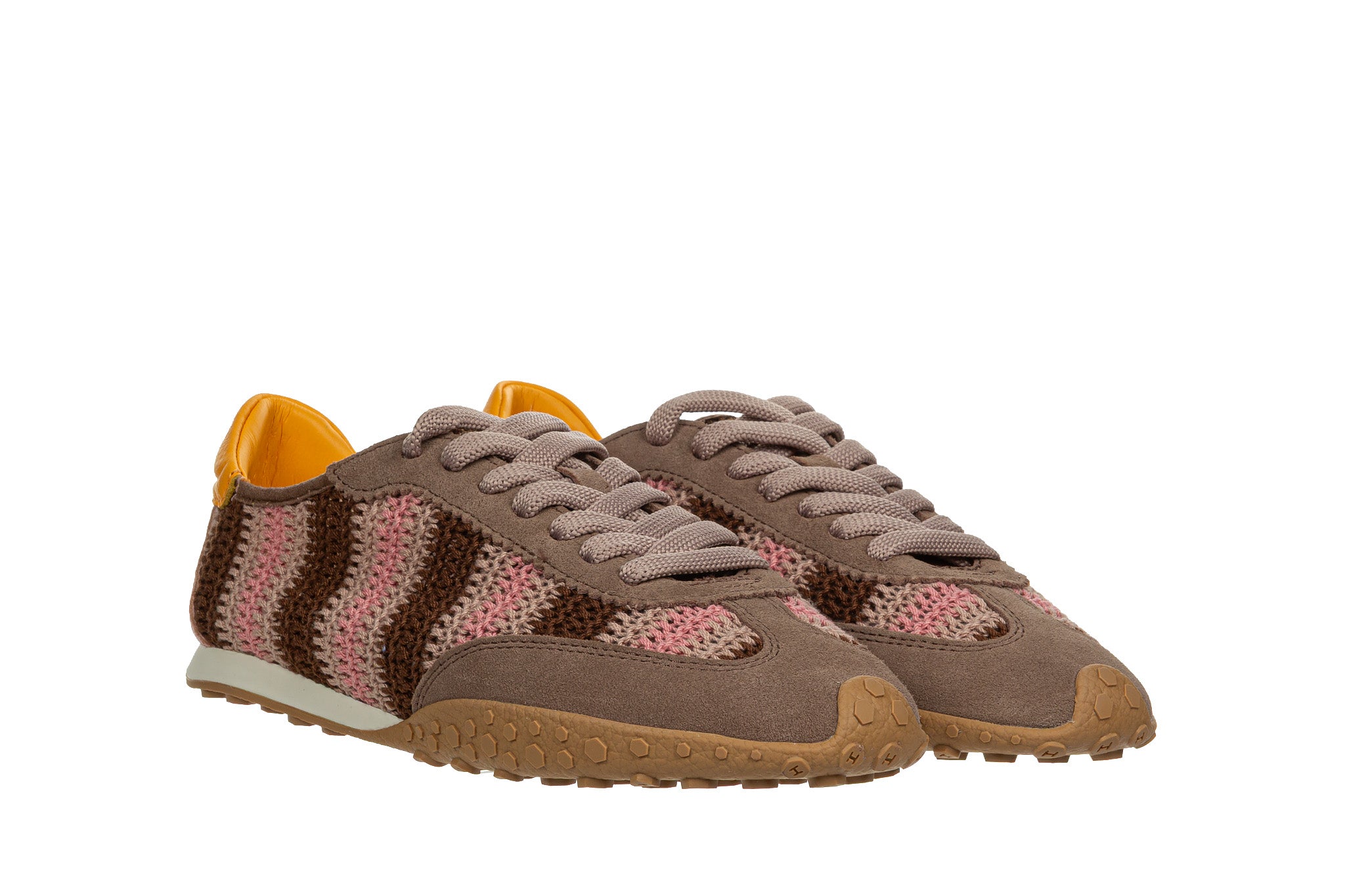 Charakterystyczna, pleciona cholewka w odcieniach zieleni i błękitu przyciąga wzrok i nadaje całości nieoczywisty, oryginalny charakter.