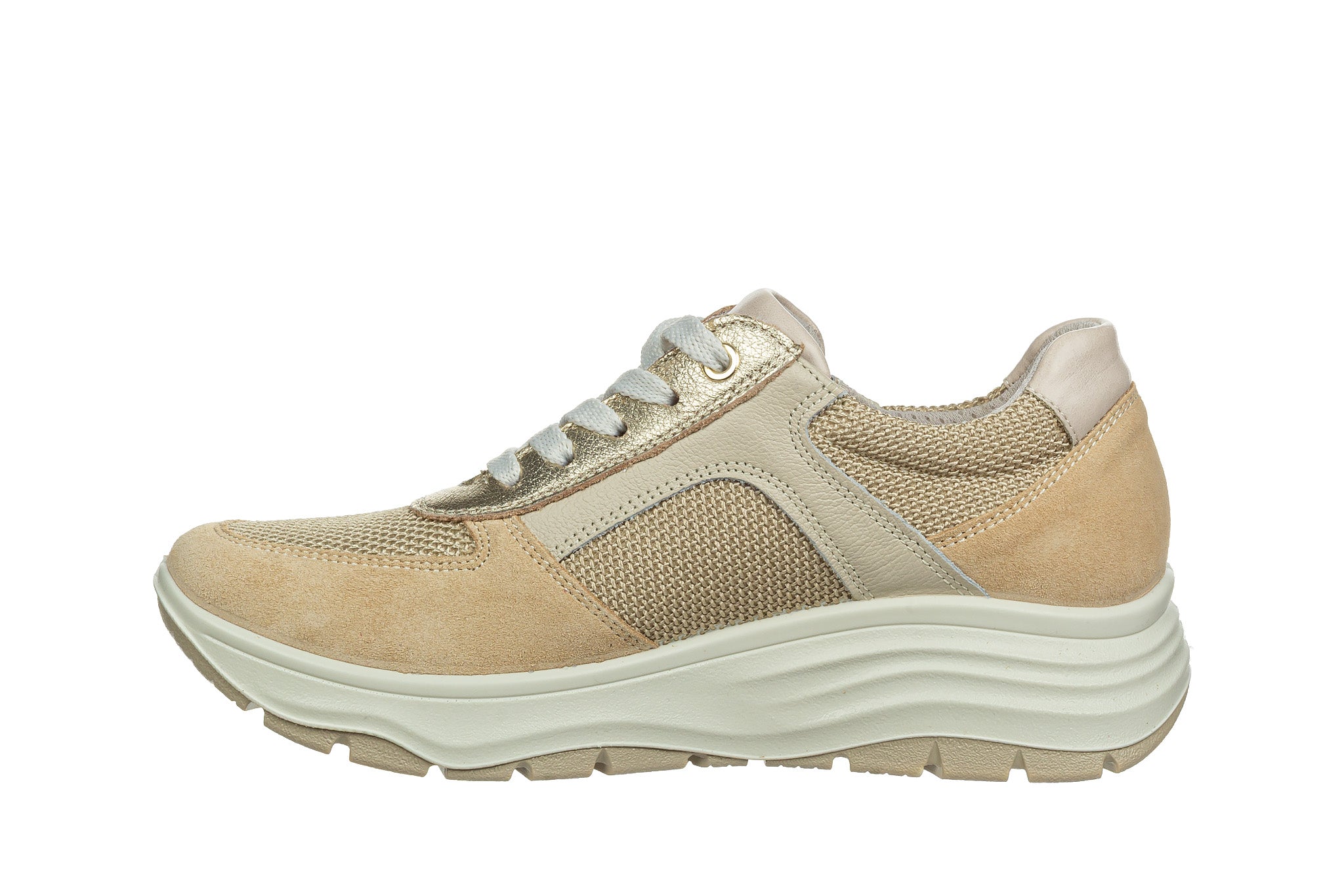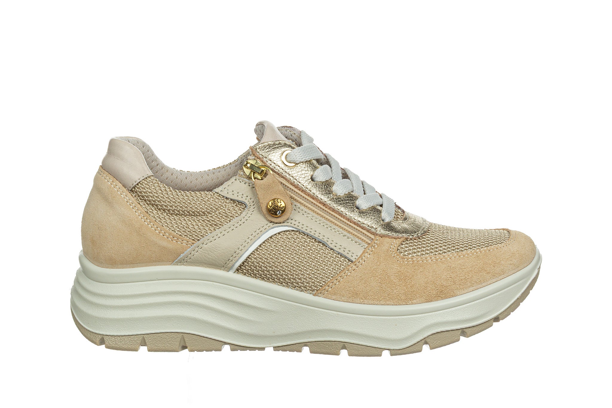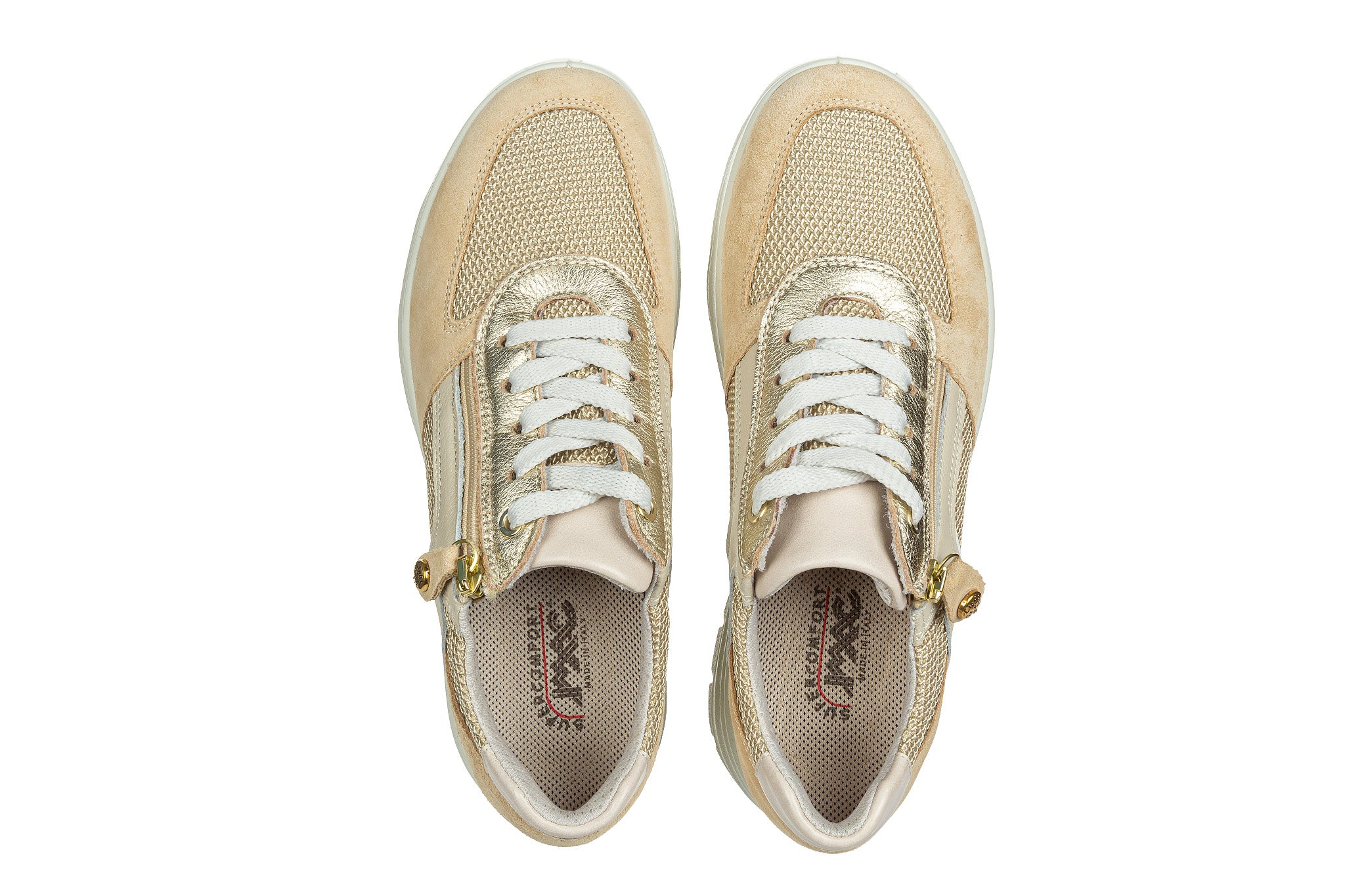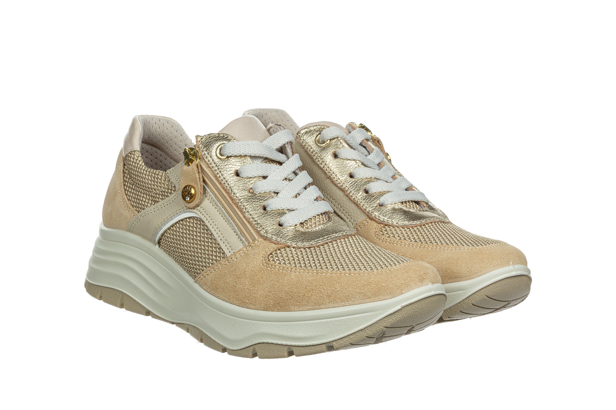 Sneakersy włoskiej marki Imac w kolorze beżowym ze złotymi akcentami.