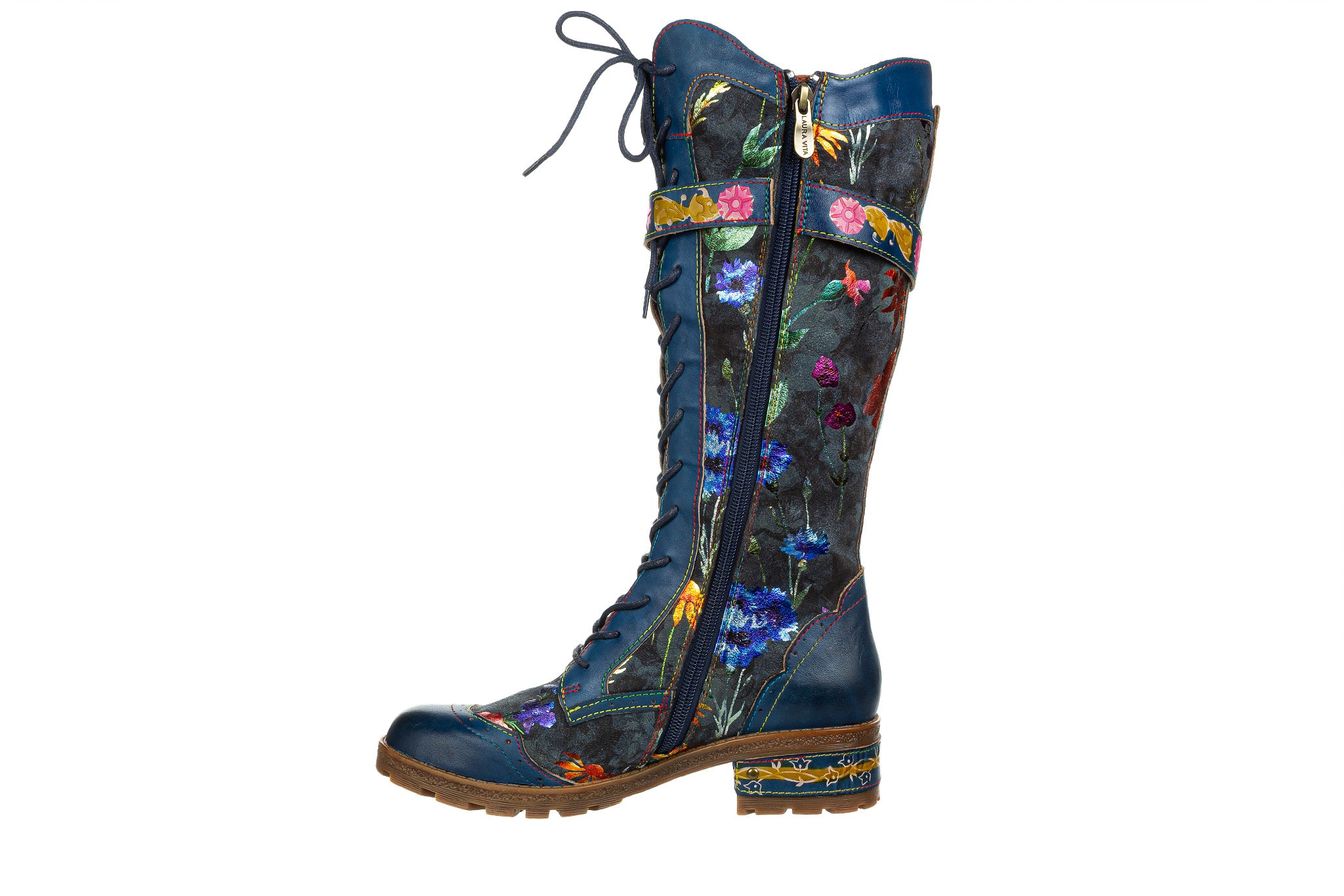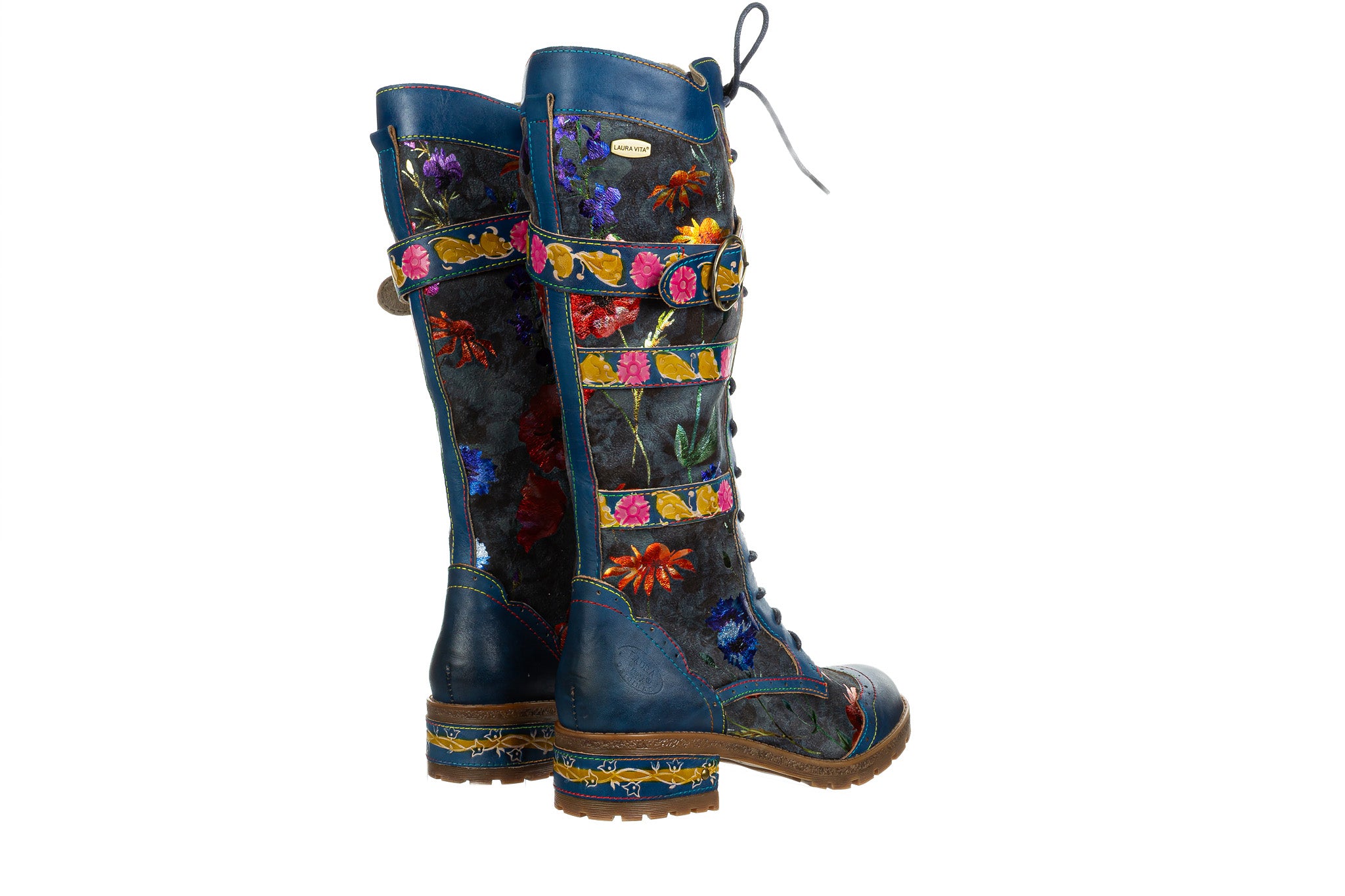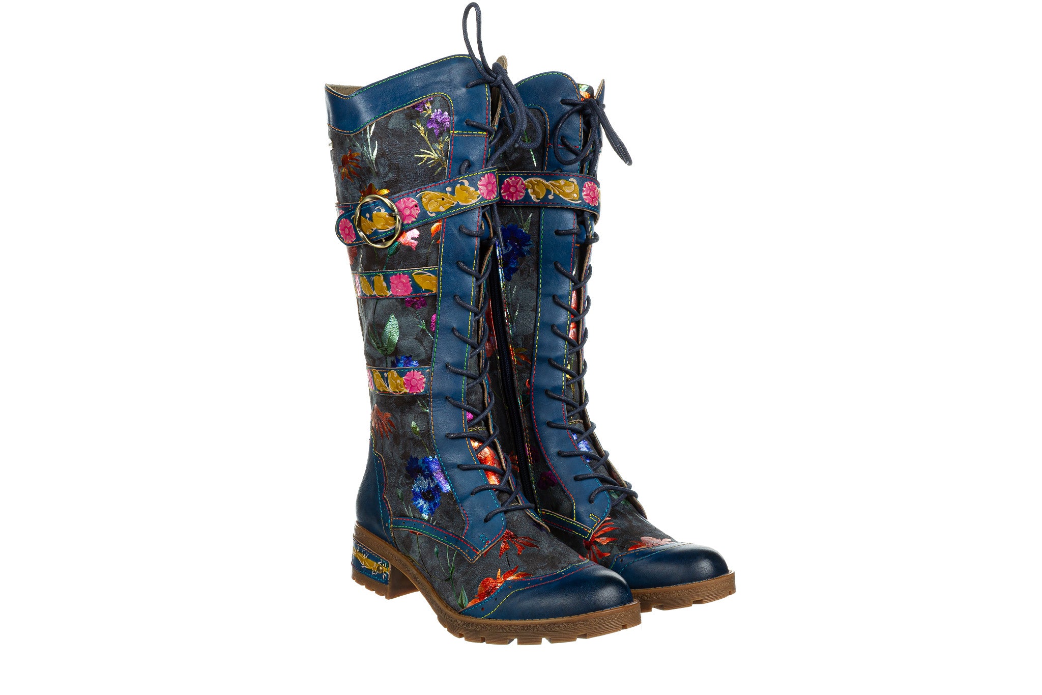 Kozaki francuskiej marki Laura Vita niebieskie w kwiatowy wzór.