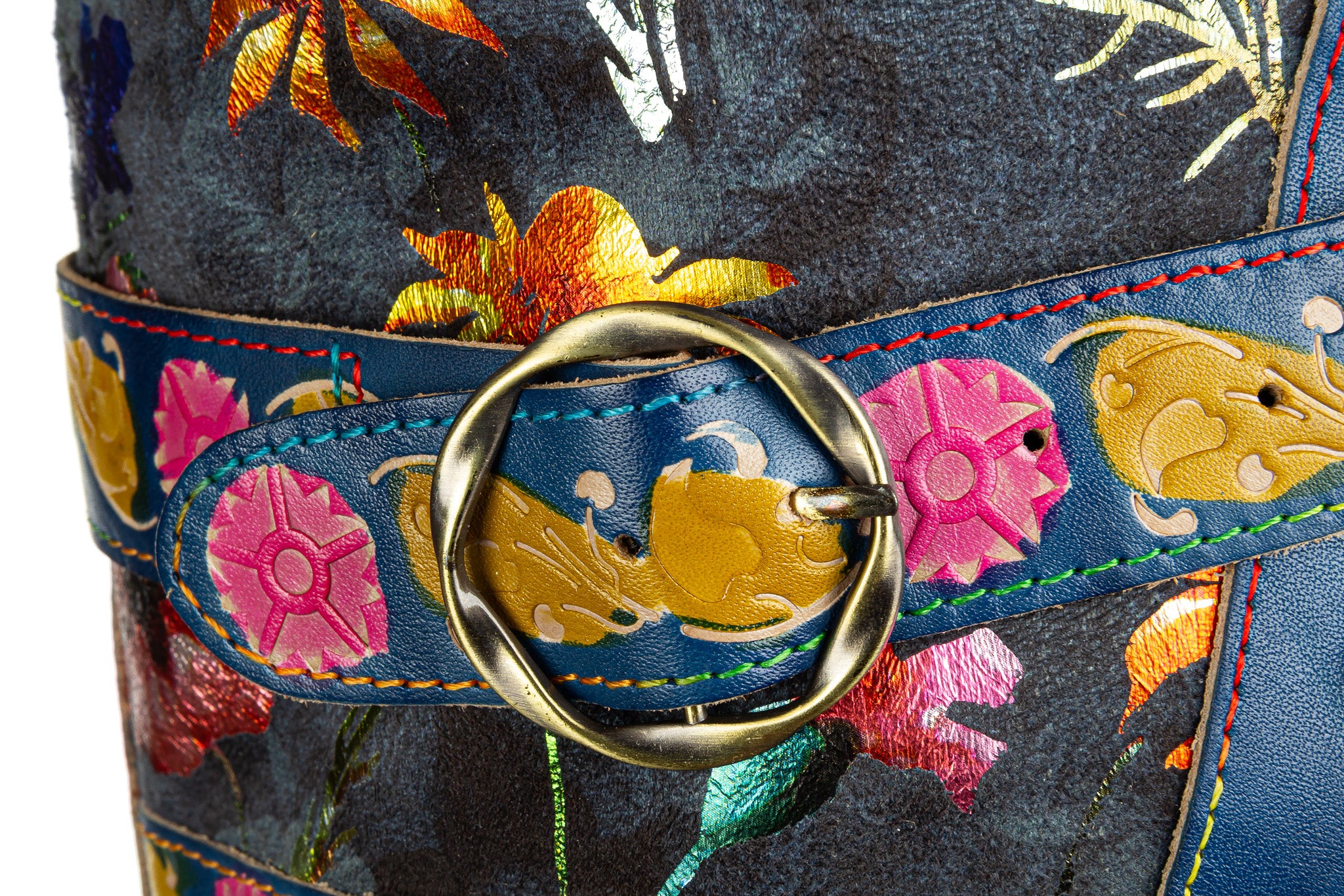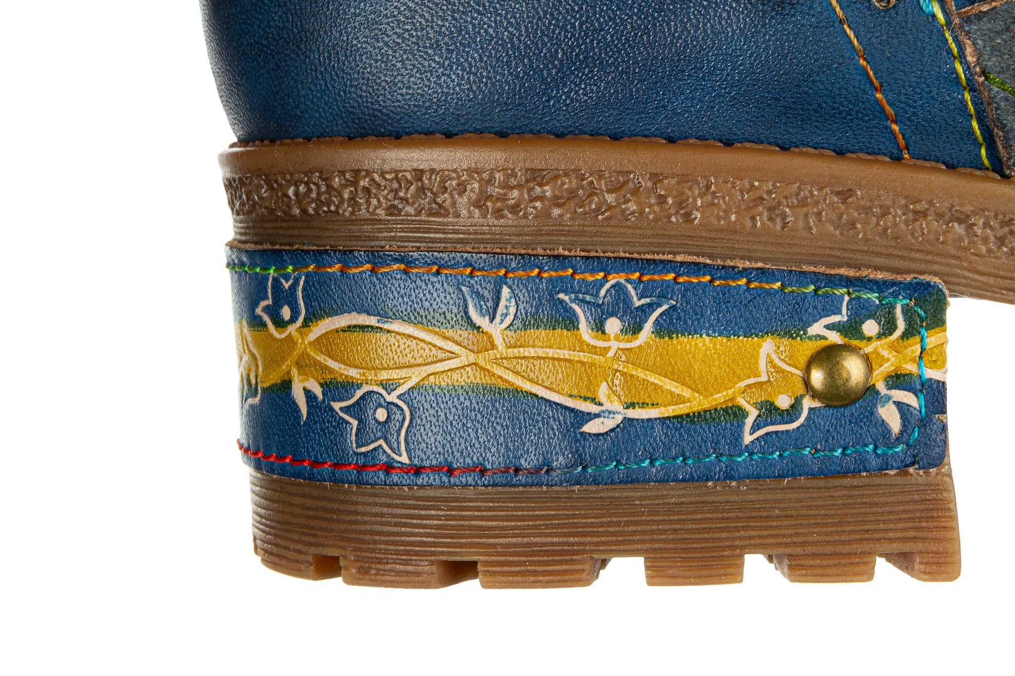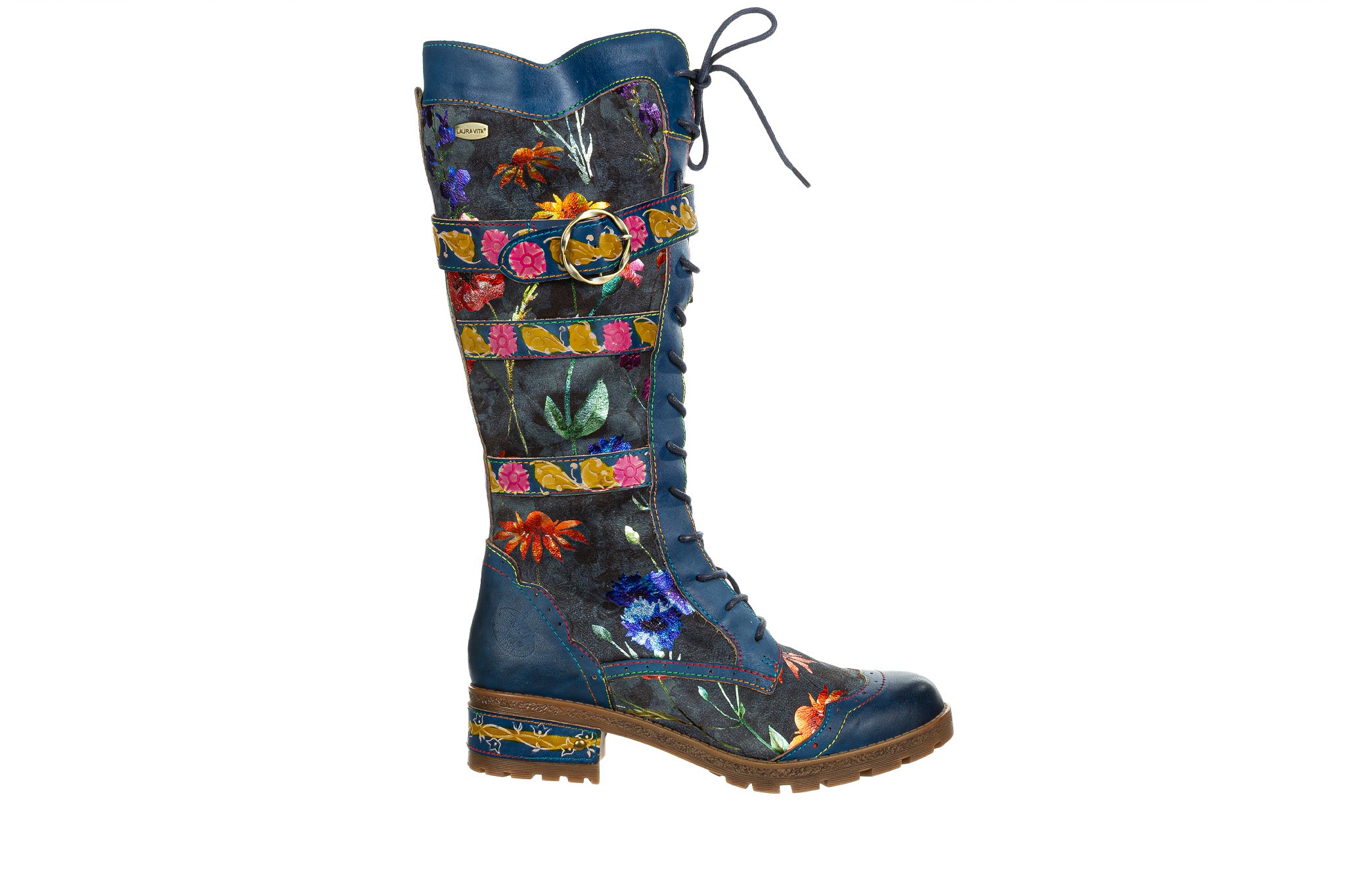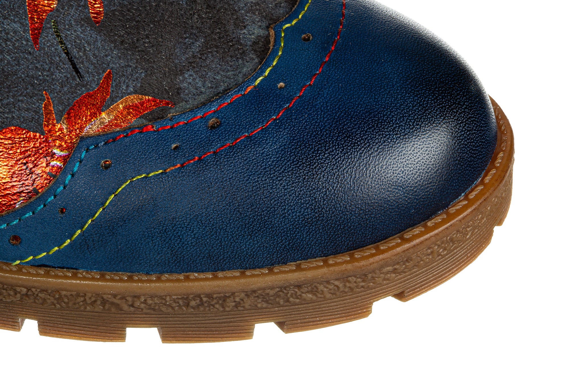 Kozaki francuskiej marki Laura Vita niebieskie w kwiatowy wzór.