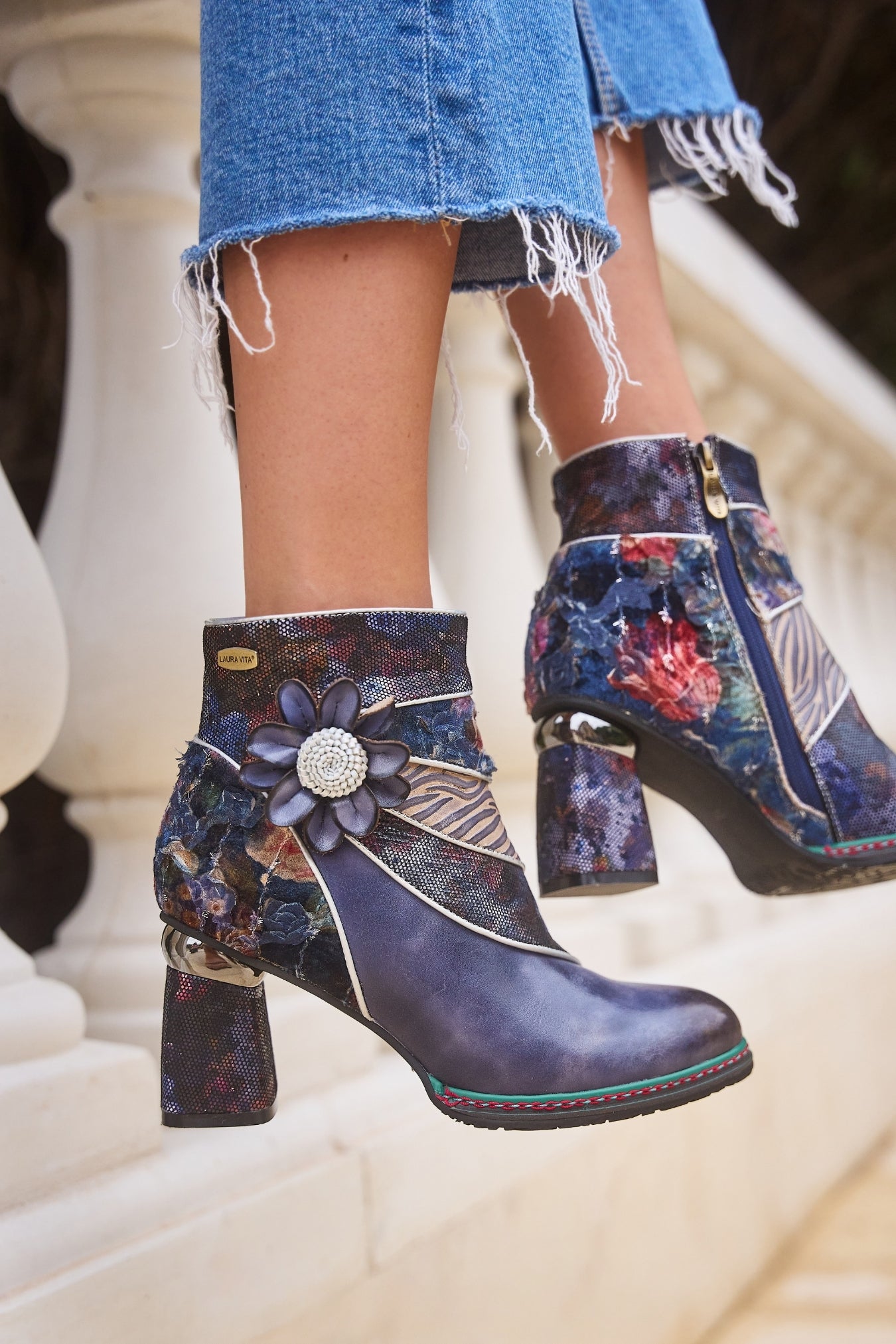 Botki francuskiej marki Laura Vita granatowe z kontrastowymi wstawkami.