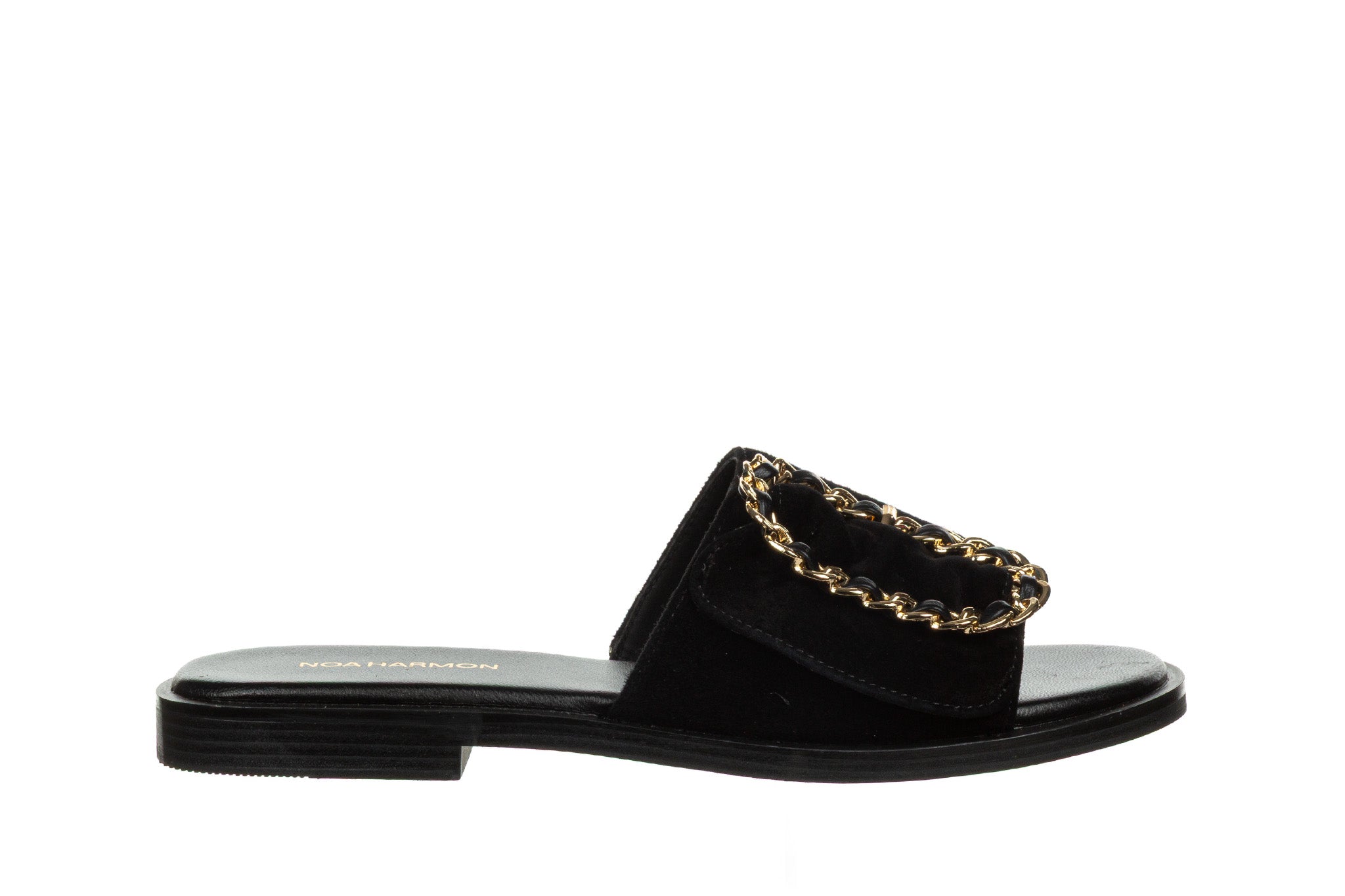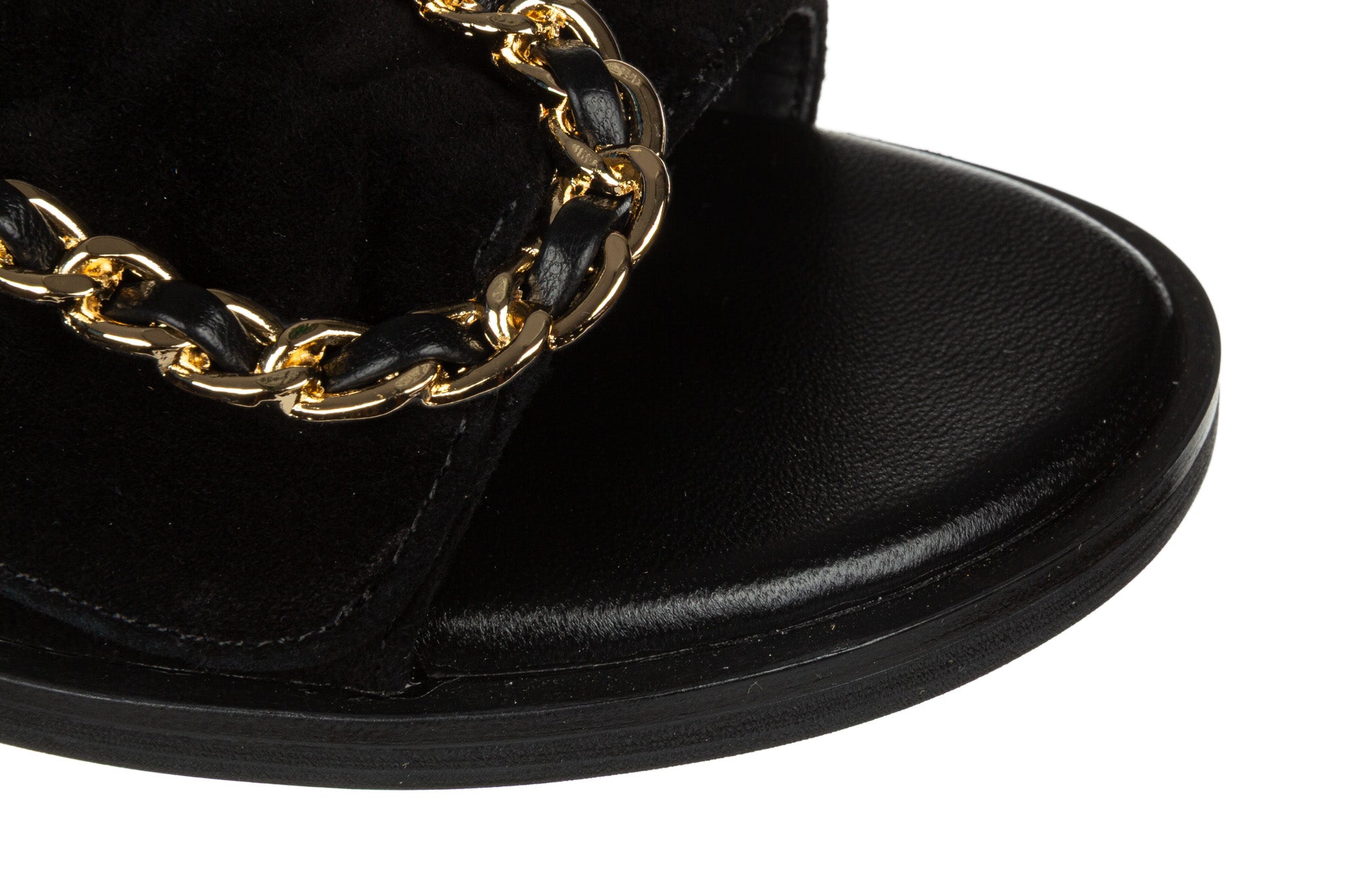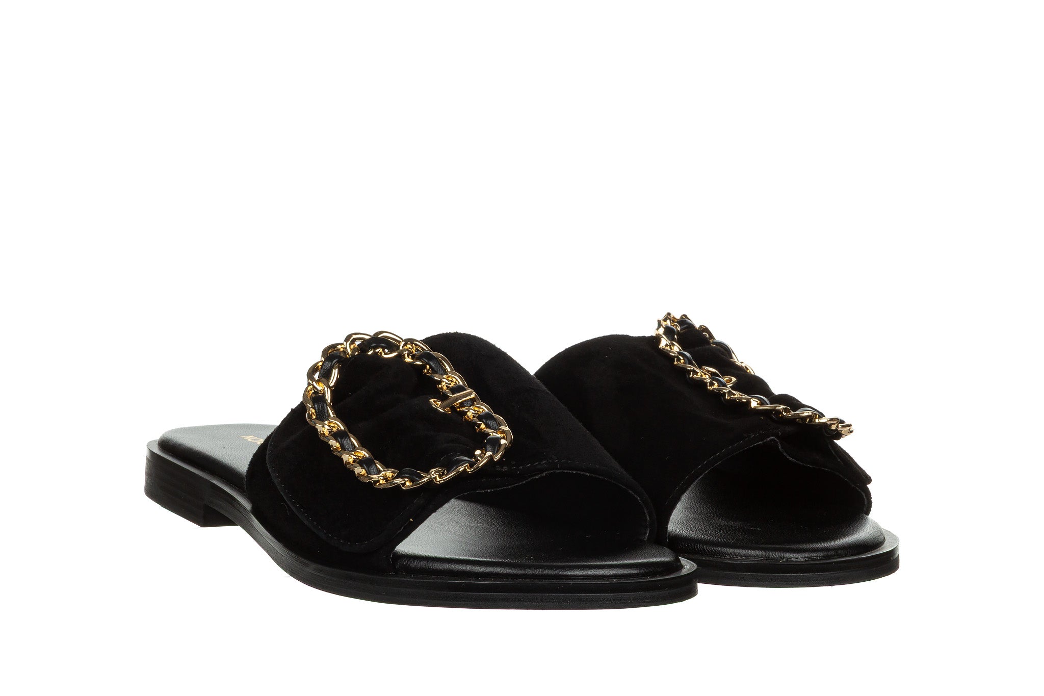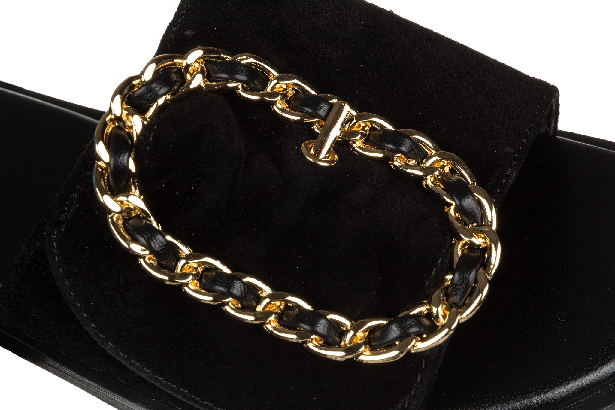Stylowe klapki wyróżniają się minimalistyczną formą. Szeroki pasek z miękkiej skóry został ozdobiony dużą, dekoracyjną klamrą ze złotym łańcuchem, która nadaje całości charakteru.