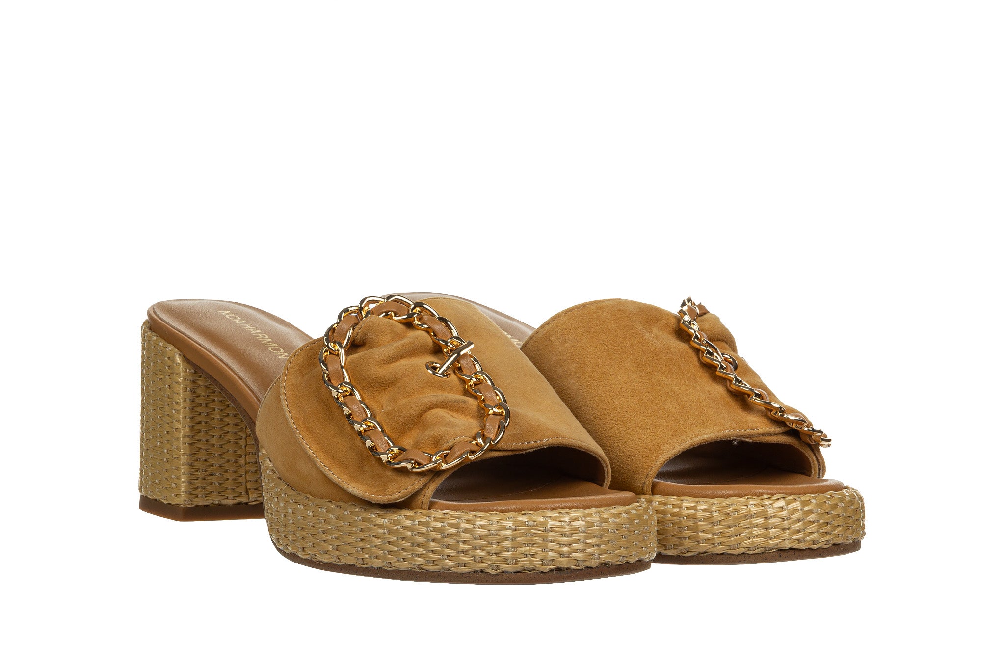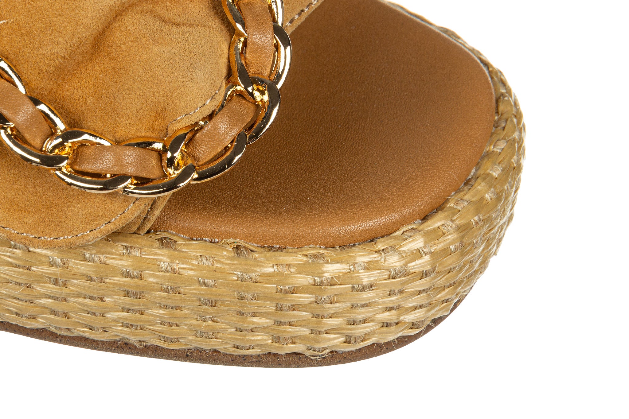 Stylowe klapki wyróżniają się naturalną kolorystyką oraz efektowną ozdobą w postaci klamry ze złotym łańcuchem. Szeroki pasek z miękkiej skóry nadaje całości elegancki, a jednocześnie swobodny charakter.