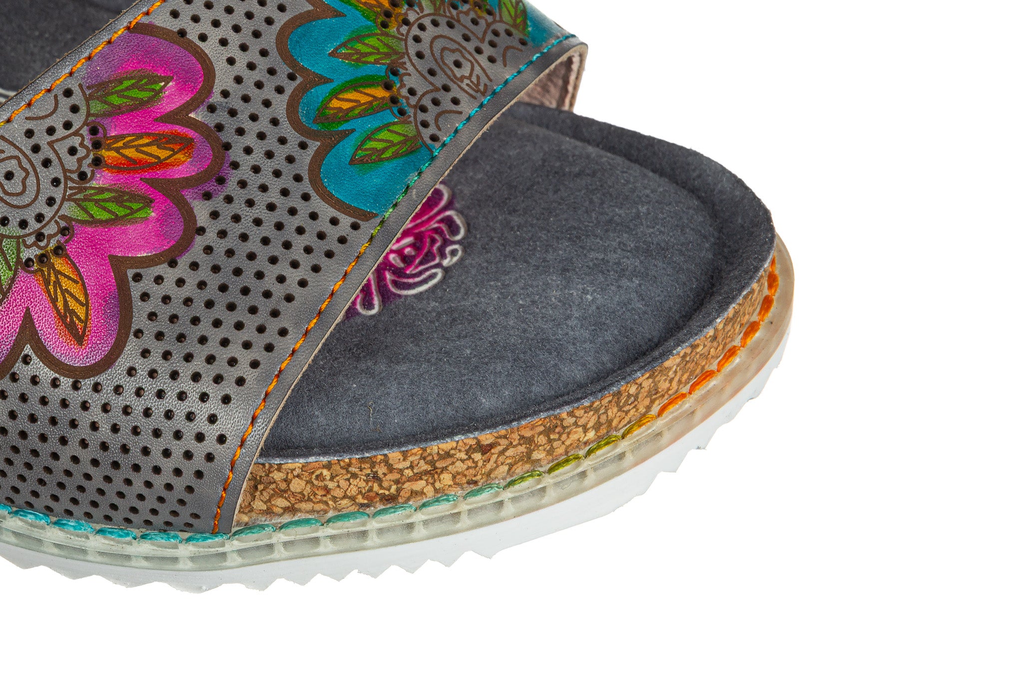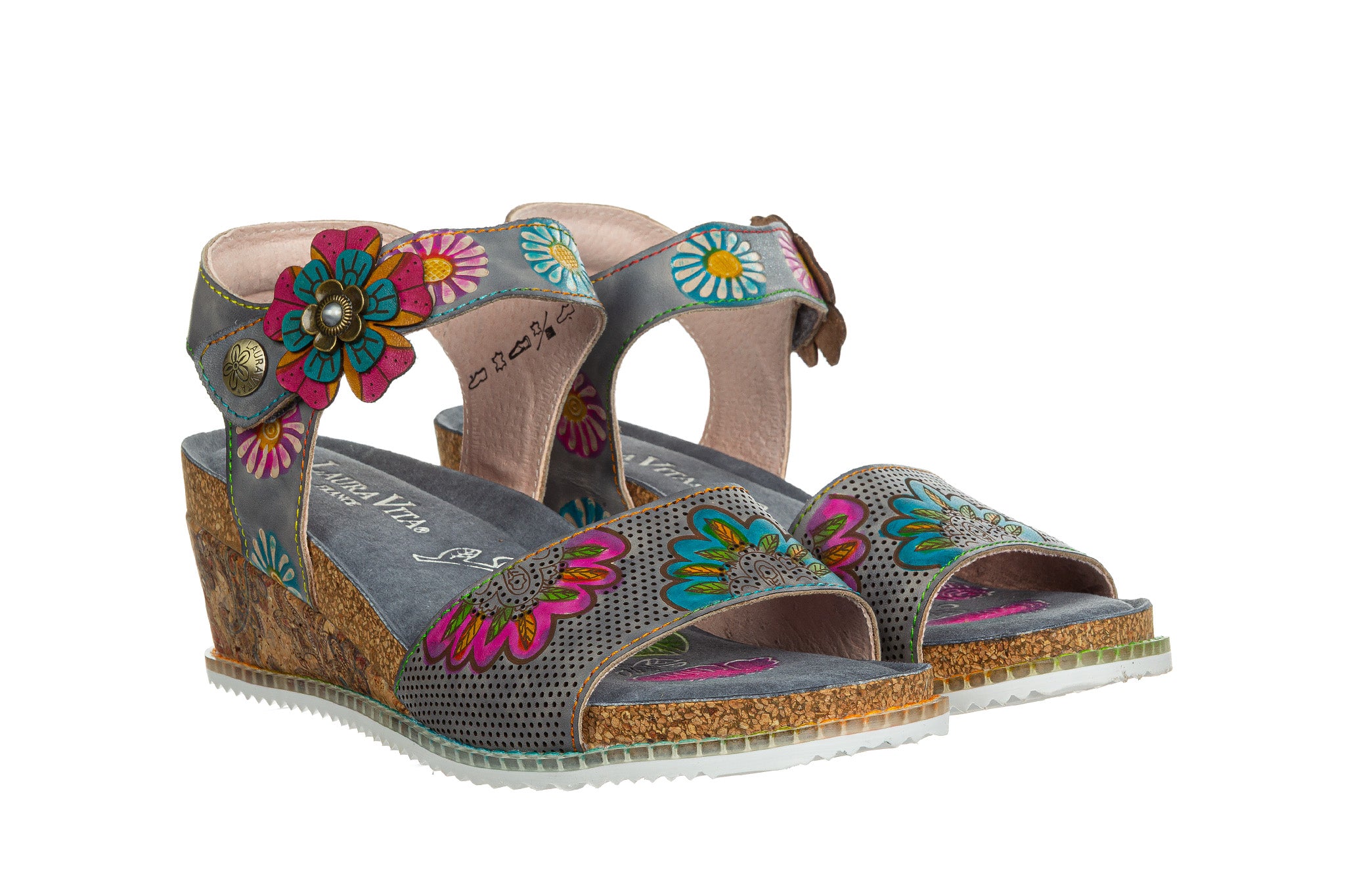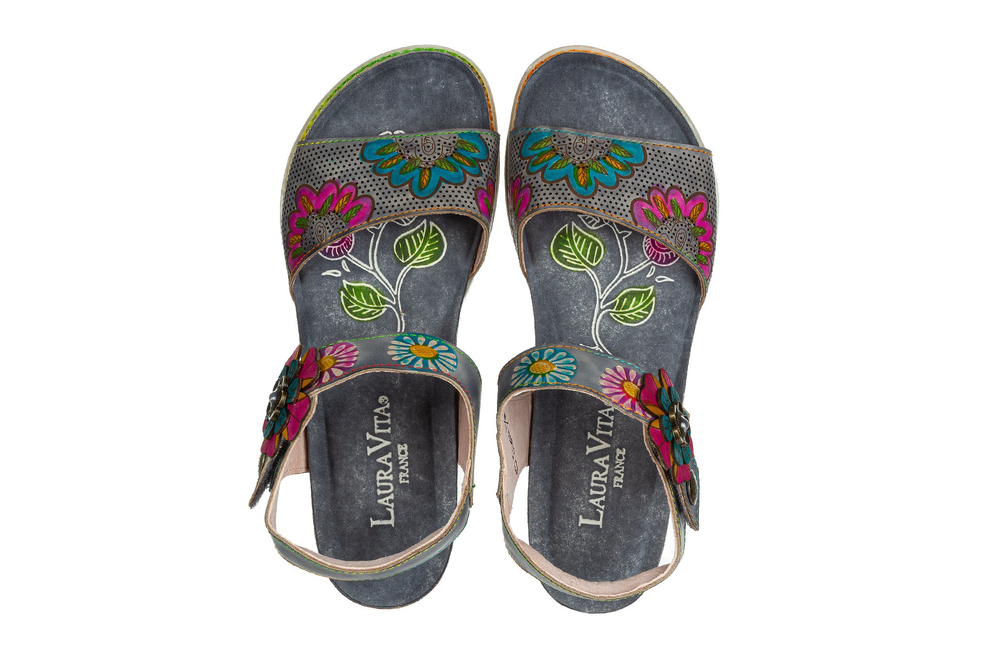 Sandały francuskiej marki Laura Vita w kolorze popielatym z wielokolorowymi akcentami.
