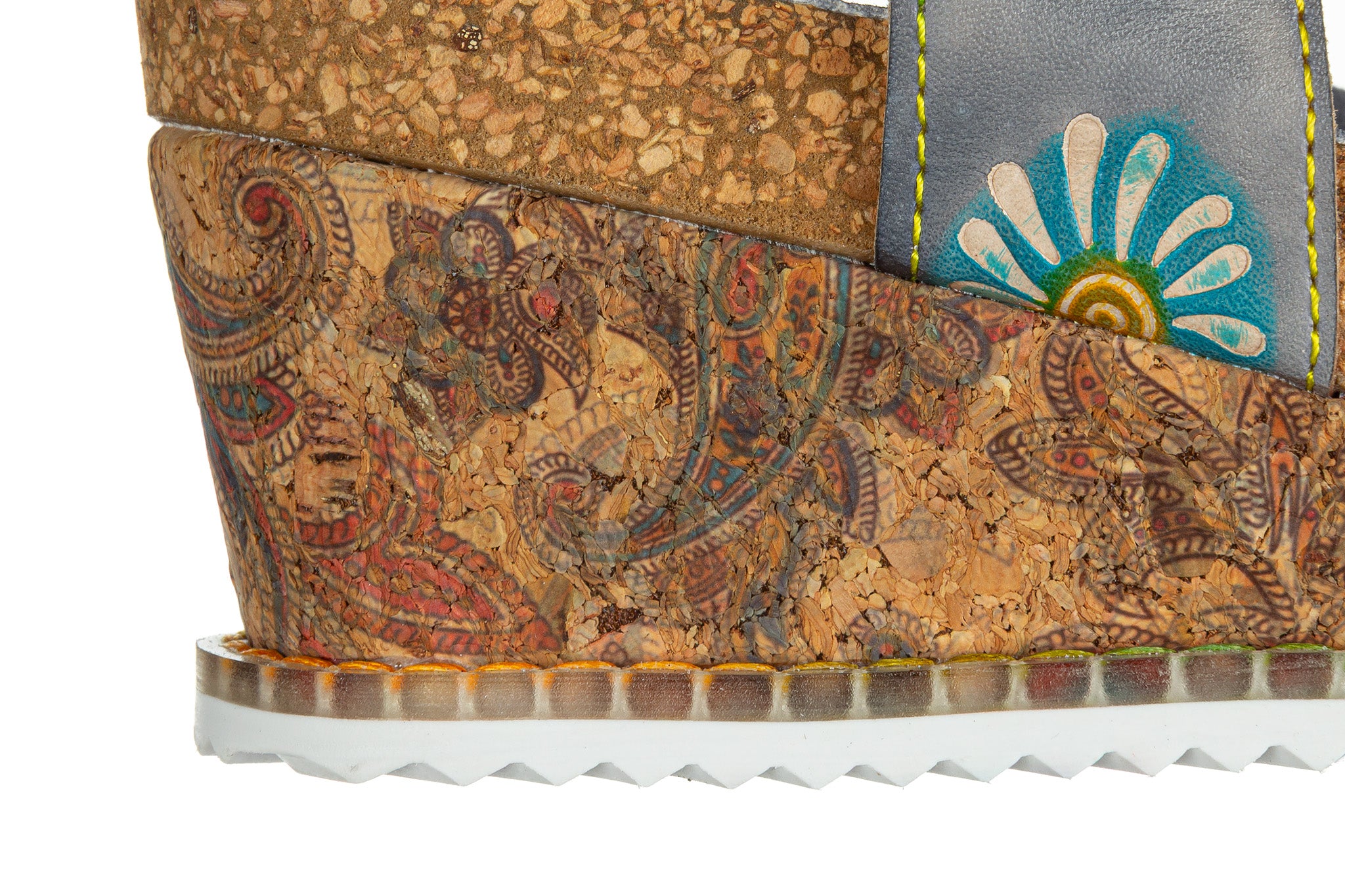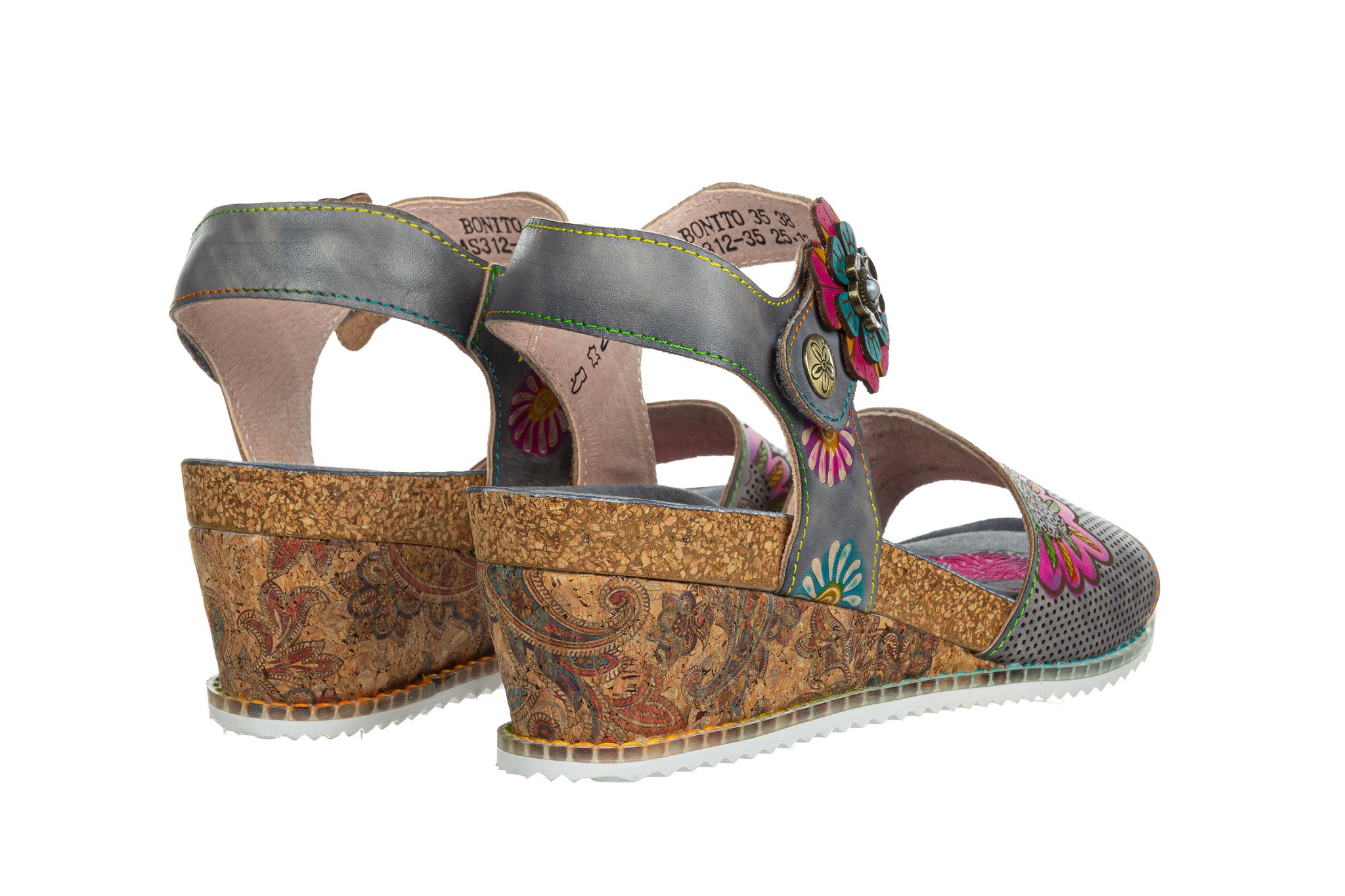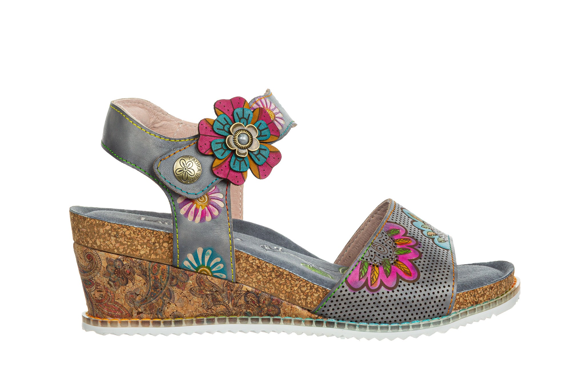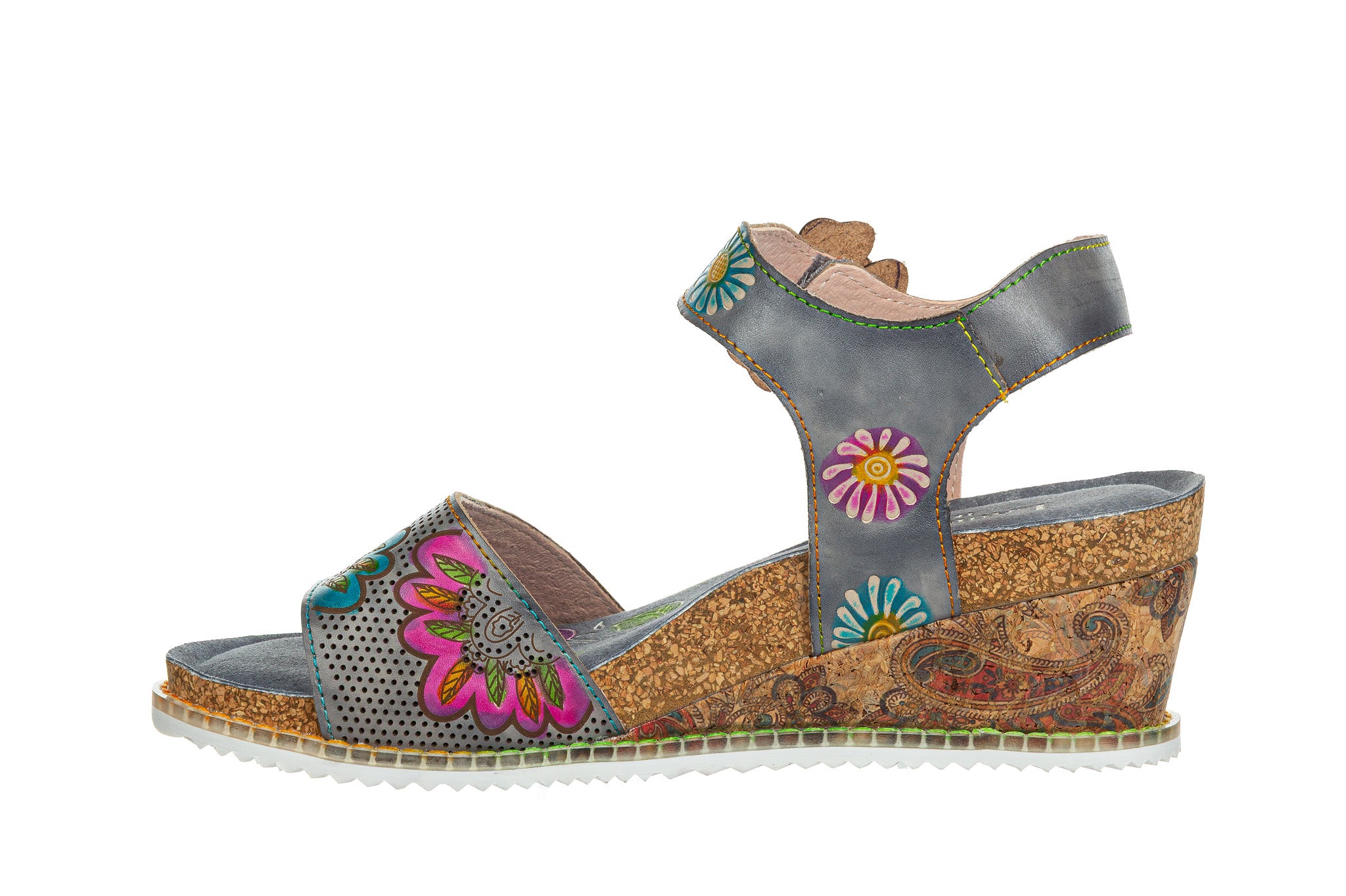 Sandały damskie charakteryzujące się unikalnym designem i wysoką jakością wykonania. Cholewka z naturalnej skóry, ozdobiona kolorowymi, ręcznie wykonanymi aplikacjami kwiatowymi oraz motywami, nadającymi obuwiu artystyczny charakter. Sandały posiadają stabilny koturn. Zapięcie na rzep wokół kostki umożliwia dopasowanie obuwia do stopy. Miękka wkładka gwarantuję wygodę podczas codziennego użytkowania.