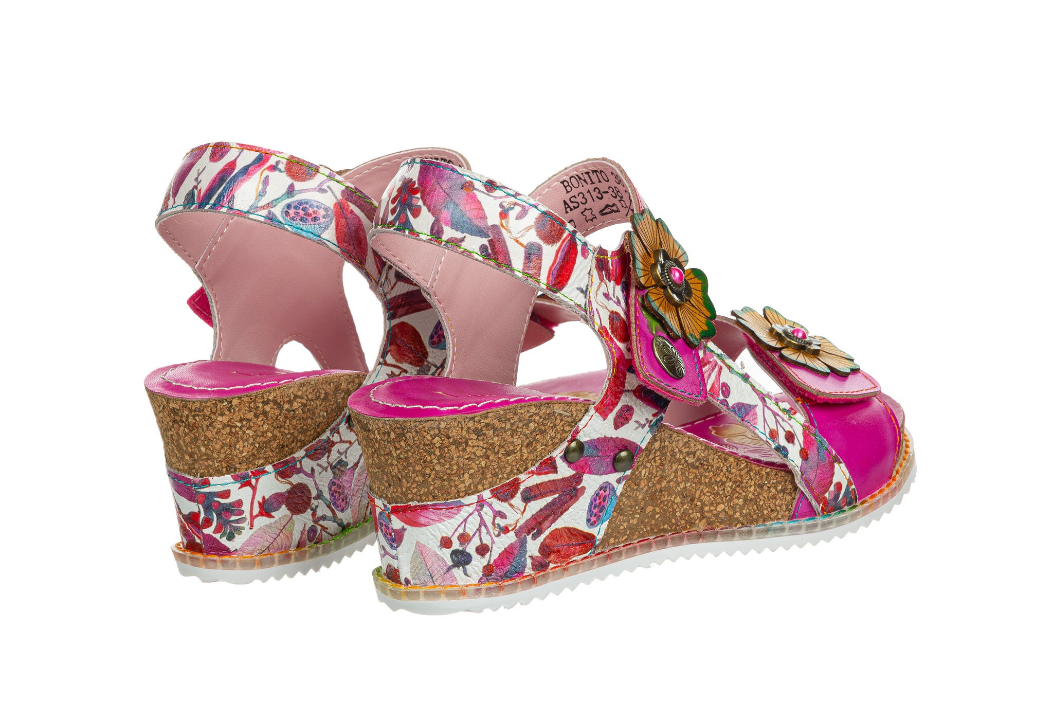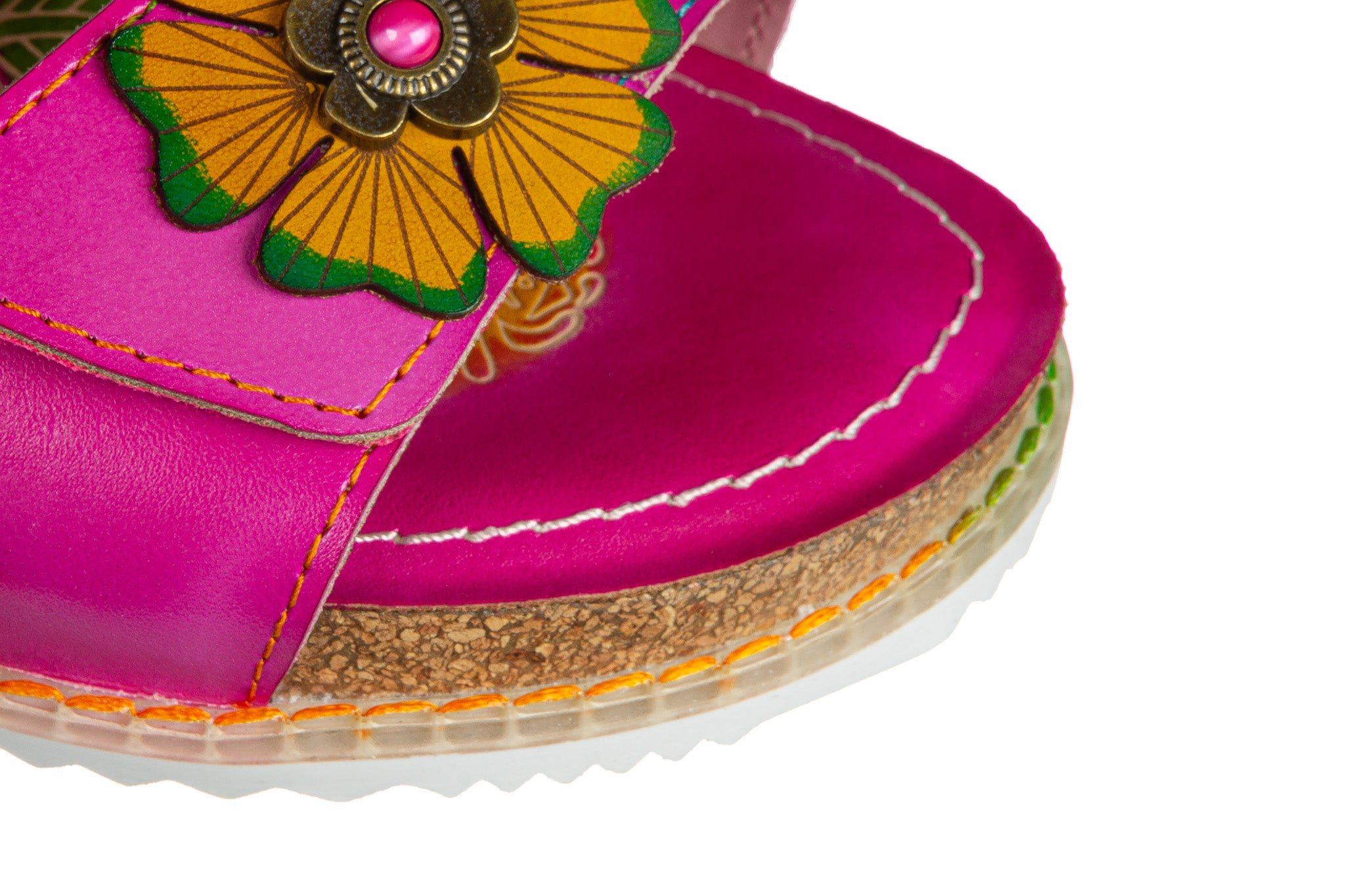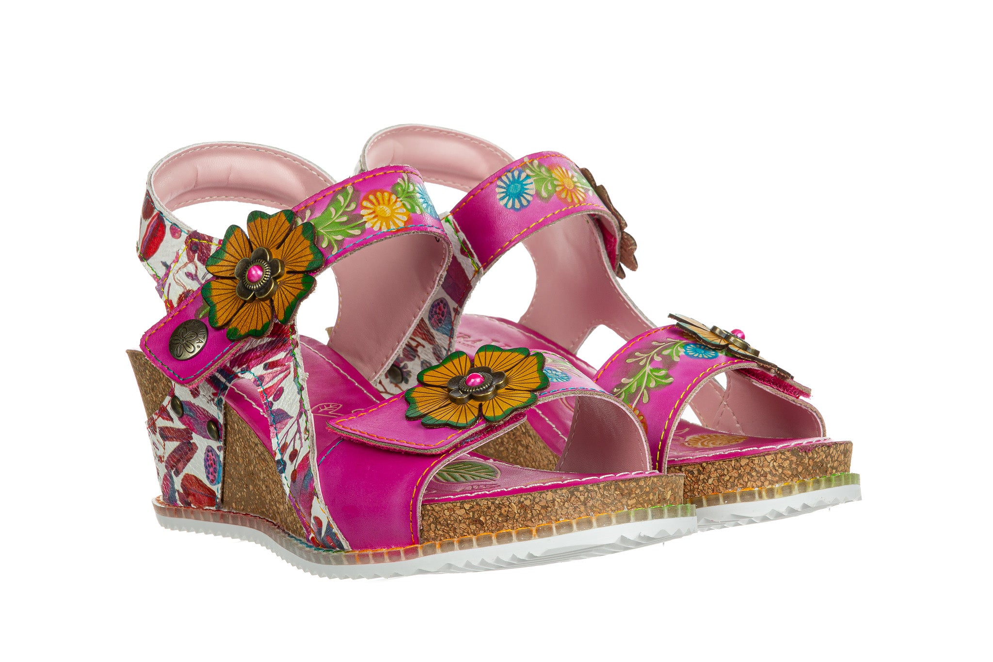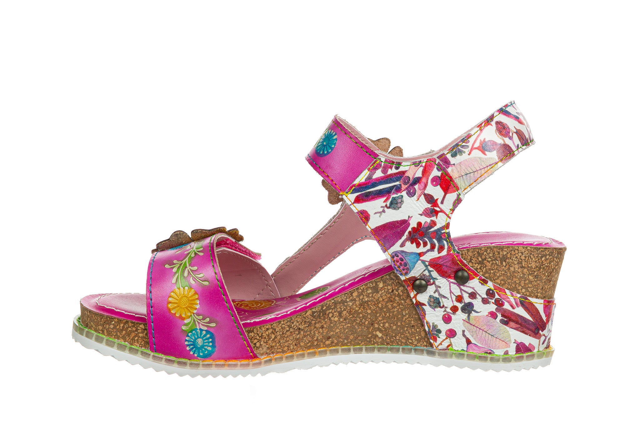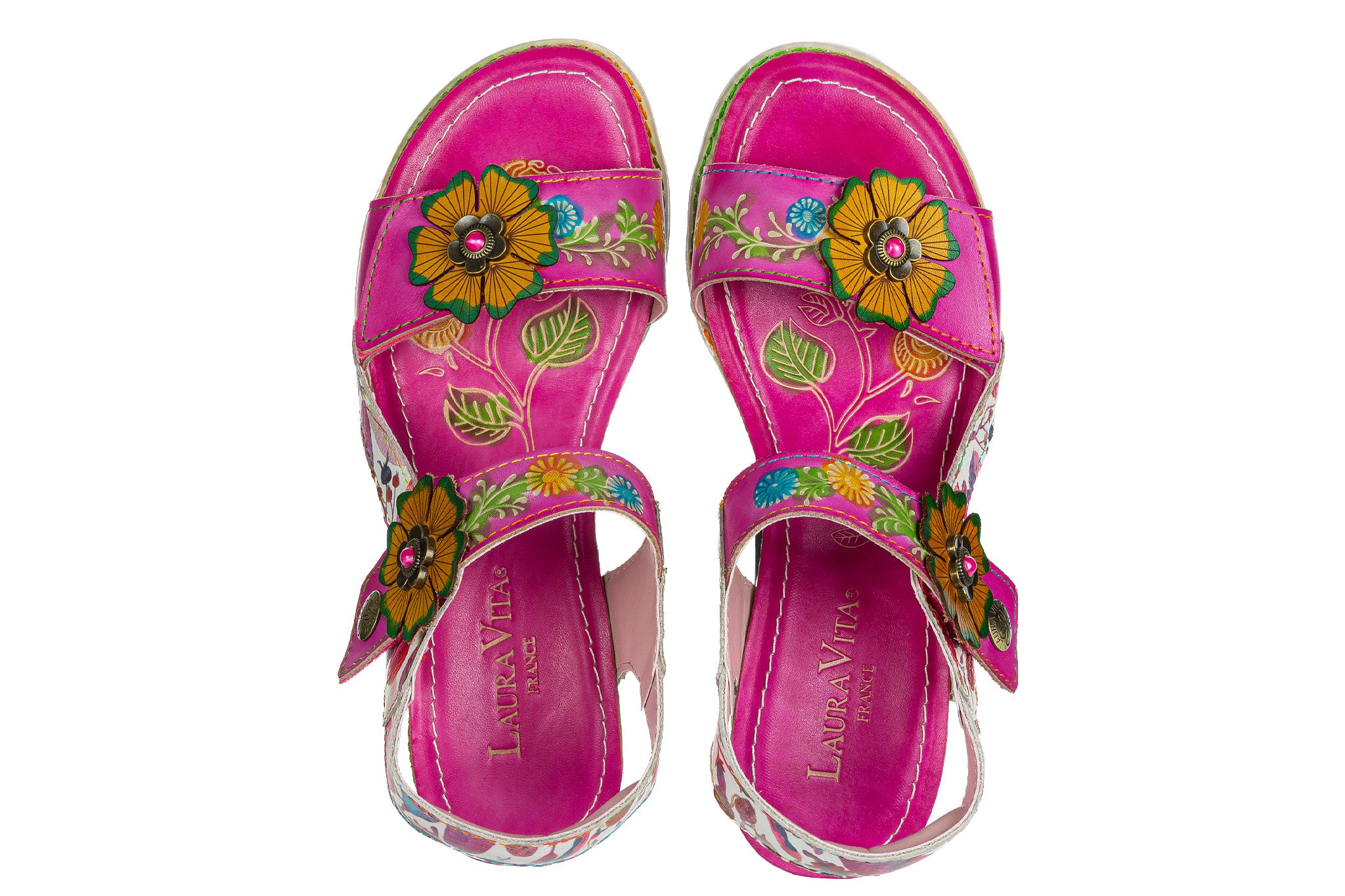 Sandały francuskiej marki Laura Vita w kolorze fuksjowym z wielokolorowymi akcentami.