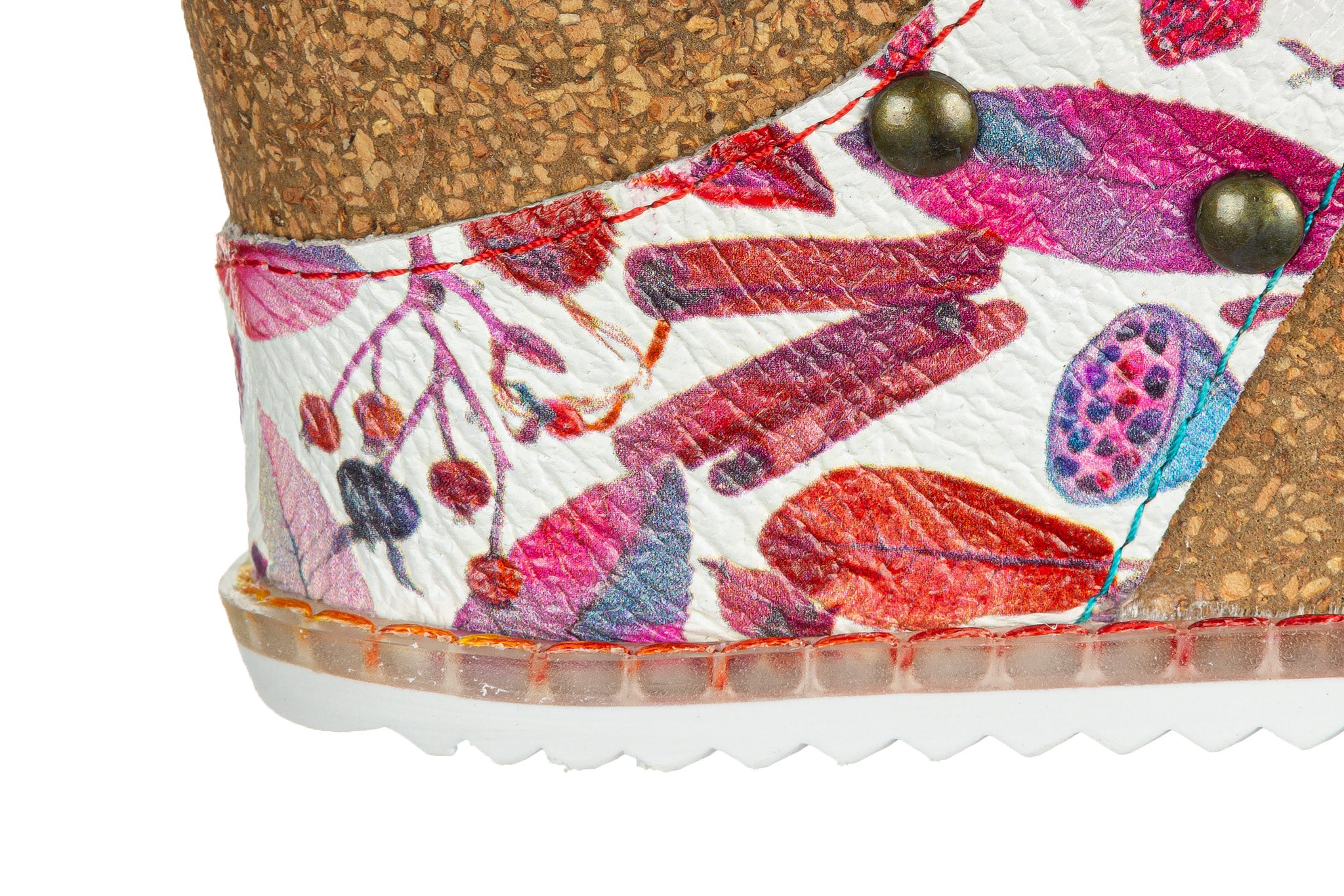 Cholewka z naturalnej skóry, ozdobiona kolorowymi, ręcznie wykonanymi aplikacjami kwiatowymi oraz motywami, nadającymi obuwiu artystyczny charakter.
