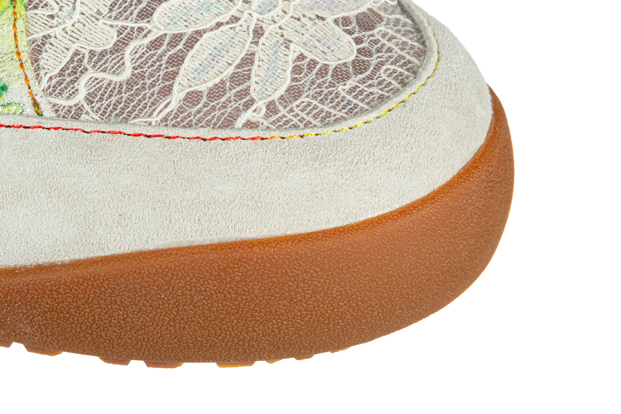 Cholewka wykonana ze skóry naturalnej oraz częściowo z koronkowych elementów z prześwitującą siateczką.