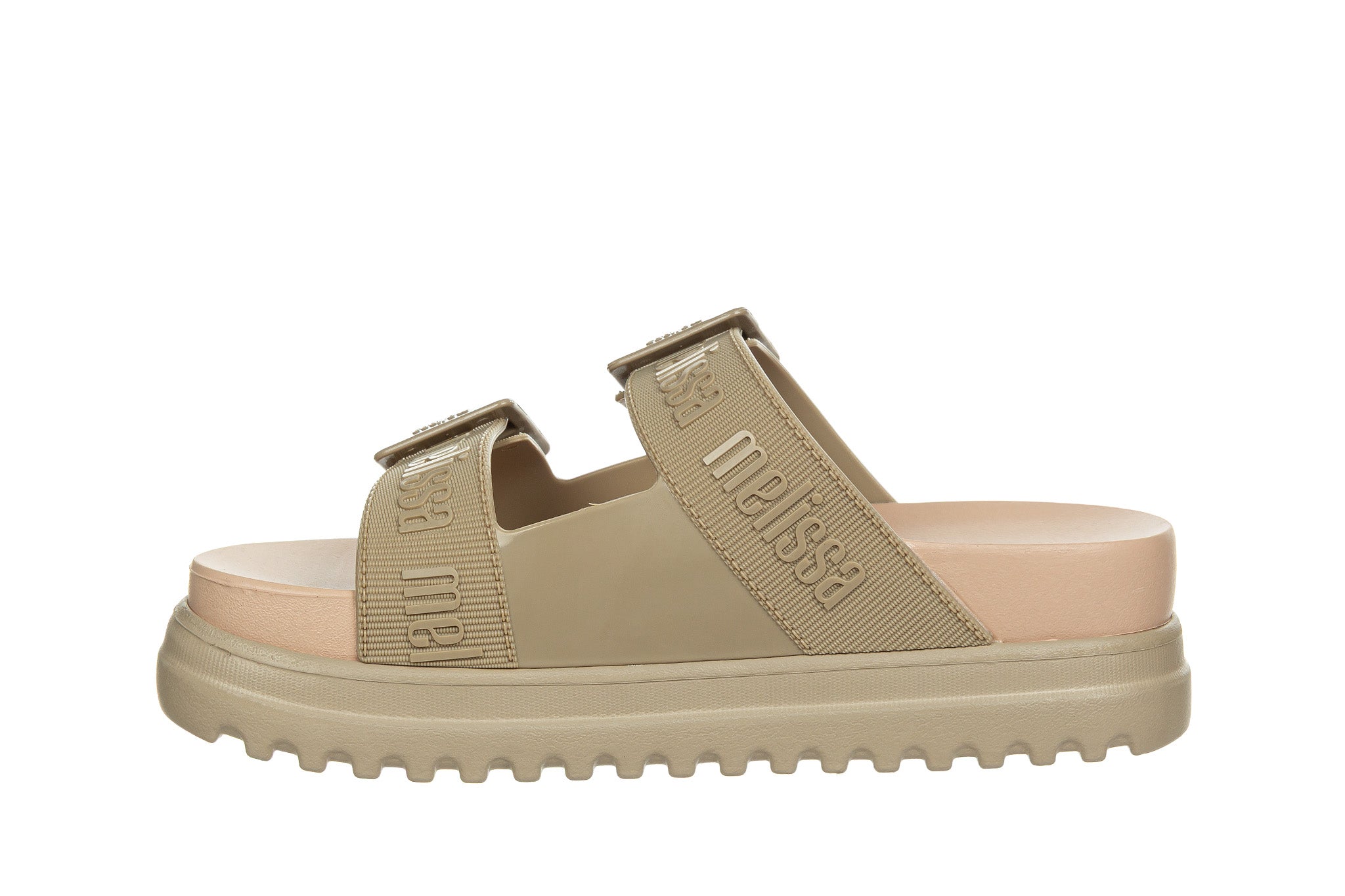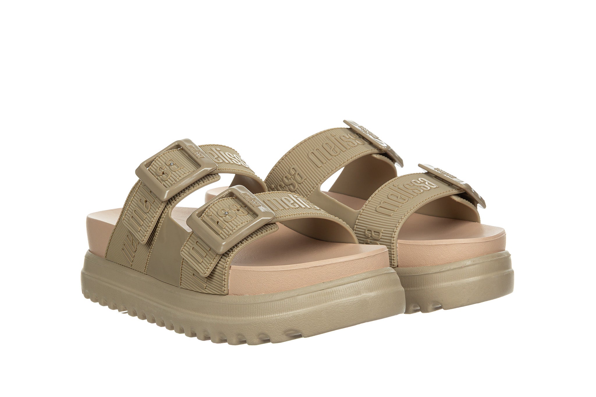 Klapki brazylijskiej marki Melissa w kolorze beżowym.