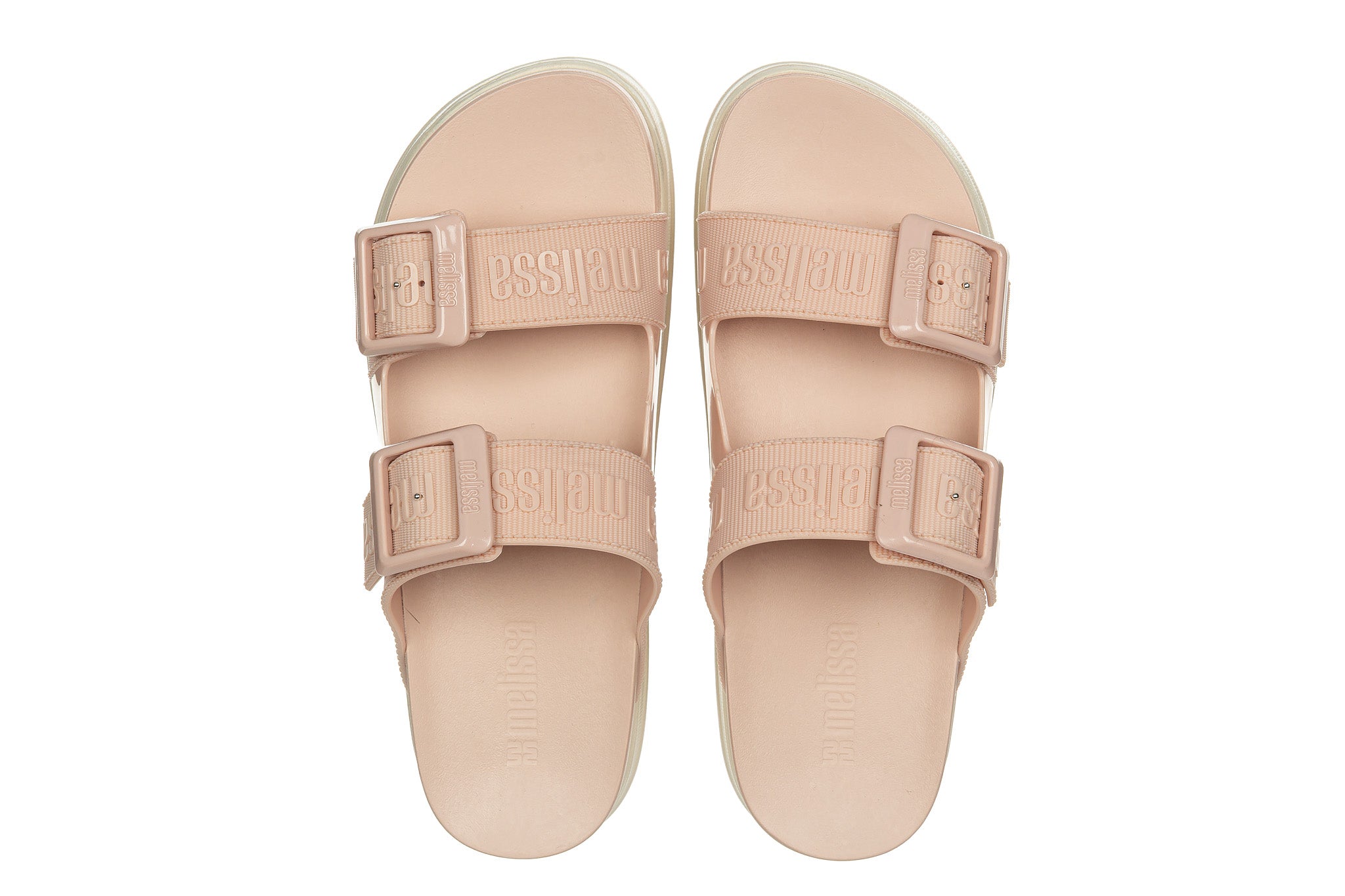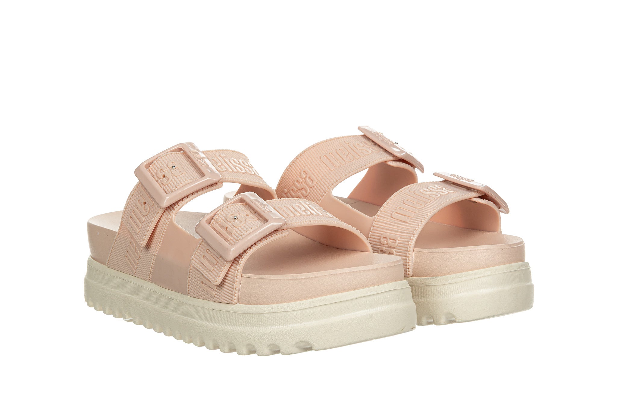 Lekkie klapki na platformie z regulowanymi paskami wykonane z pachnącego gumą balonową tworzywa Mel-Flex przyjaznego dla skóry (to połączenie wysokogatunkowej, naturalnej gumy i kauczuku).