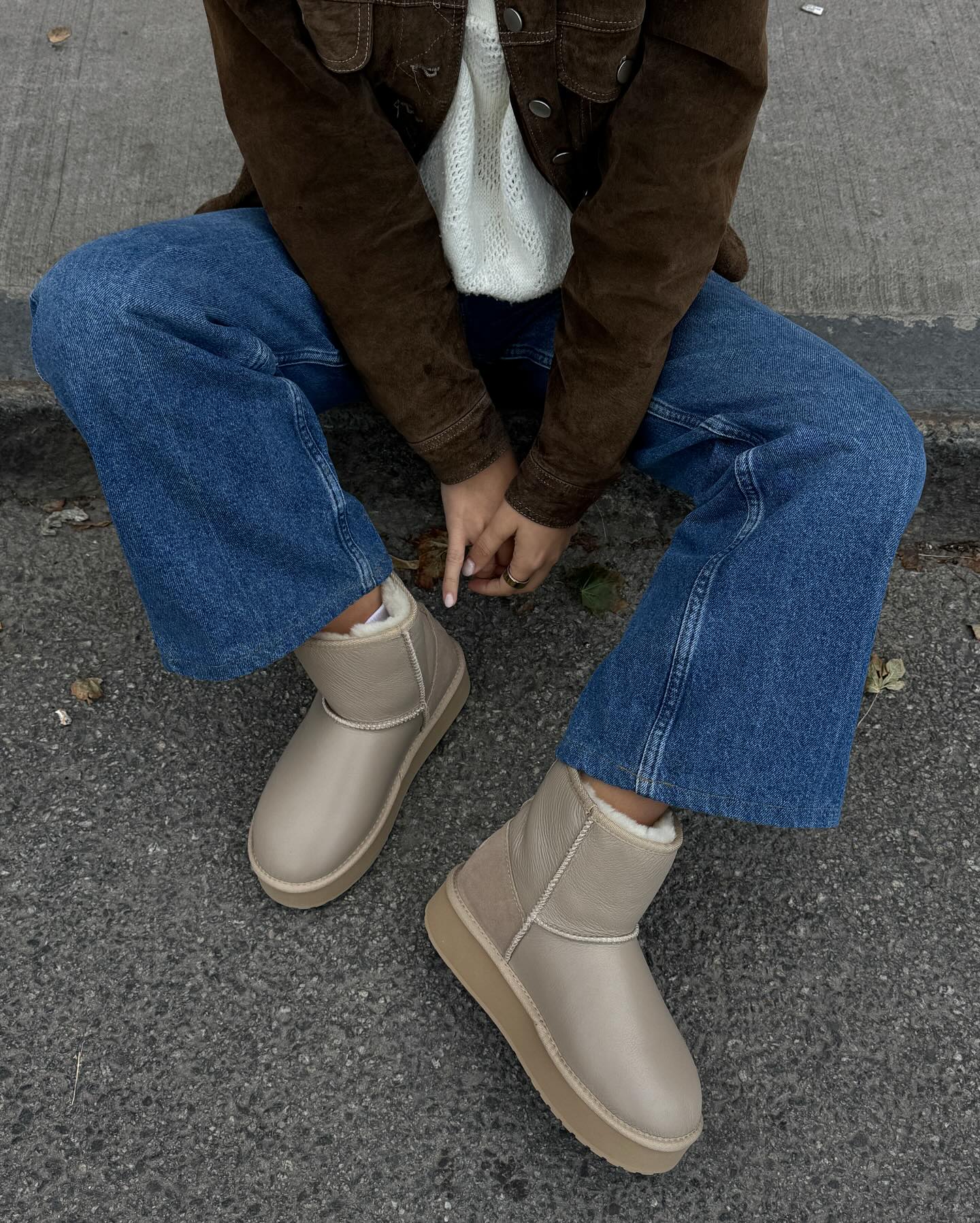 Botki wykonane z najwyższej jakości skóry owczej i gładkiej skóry licowej w kolorze piaskowym.