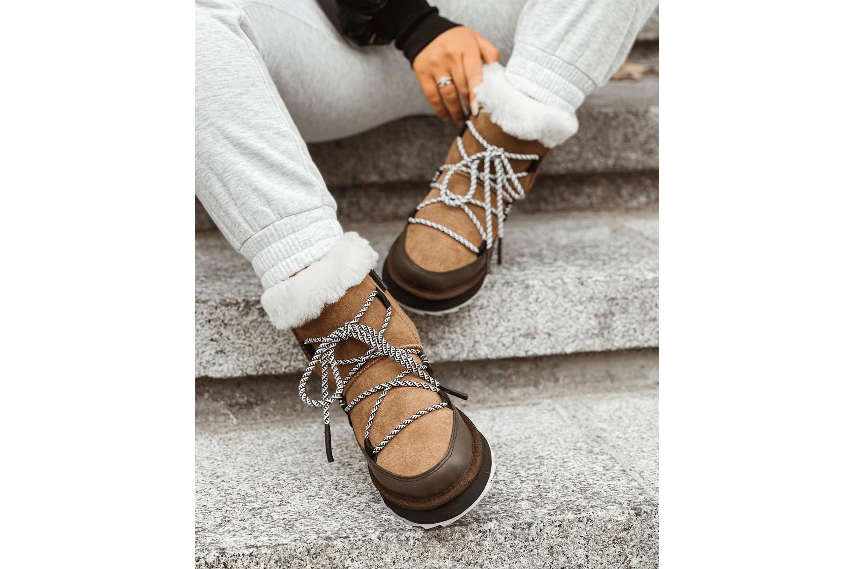 Cholewka wykonana z nieprzemakalnej, dwustronnej, naturalnej skóry owczej. Przy podeszwie dodatkowo została wykończona gumową lamówką, która chroni przed kałużami oraz śniegiem. Obuwie zasuwane, możliwość dociśnięcia cholewki sznurówkami. Śniegowce mają usztywniony zapiętek oraz podwójne szwy co wpływa na ich wytrzymałość.