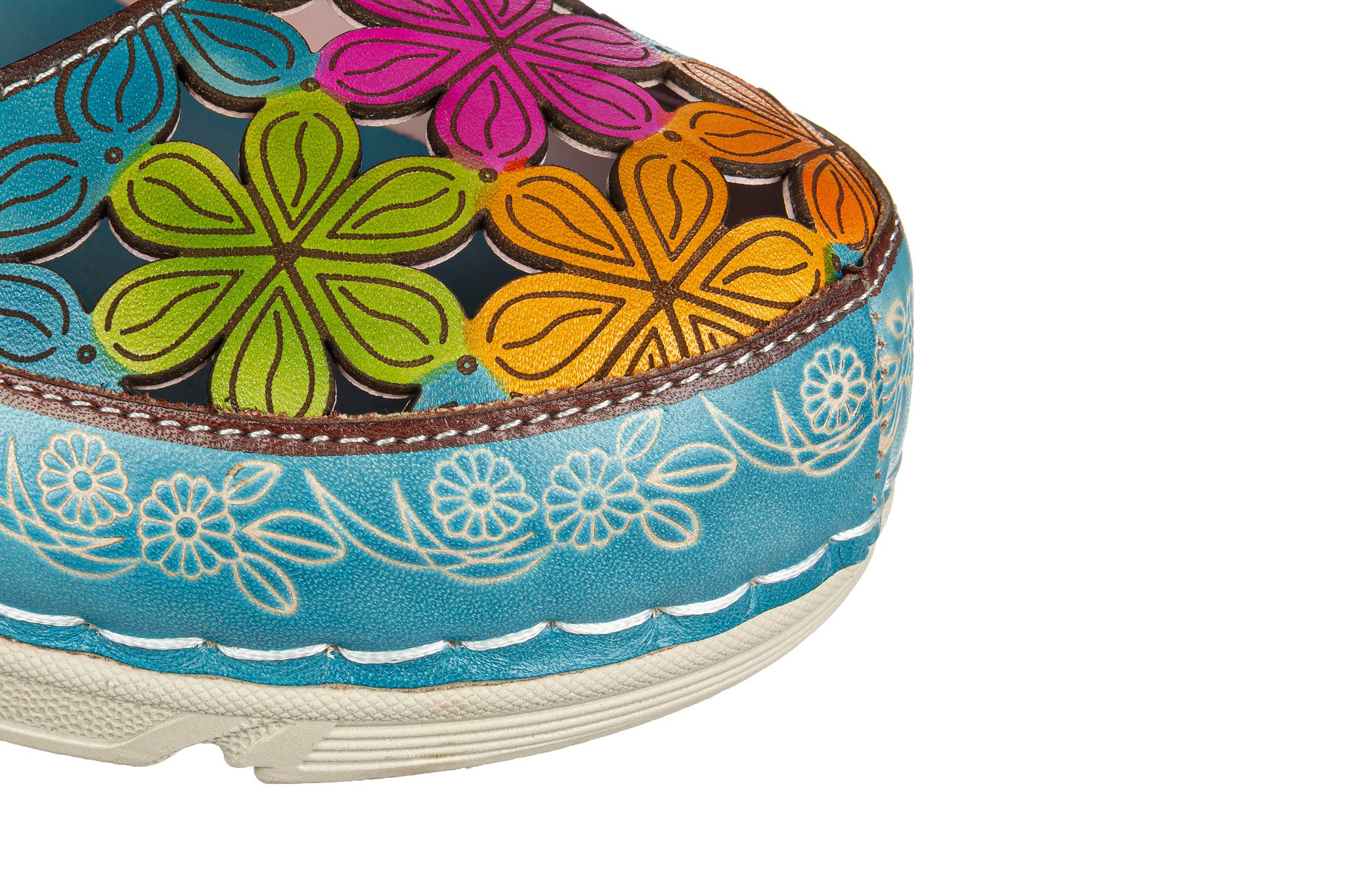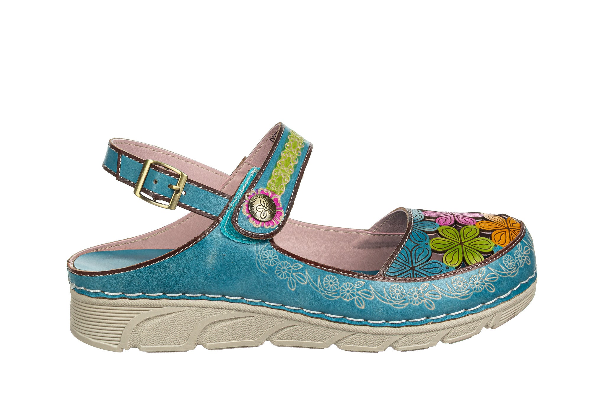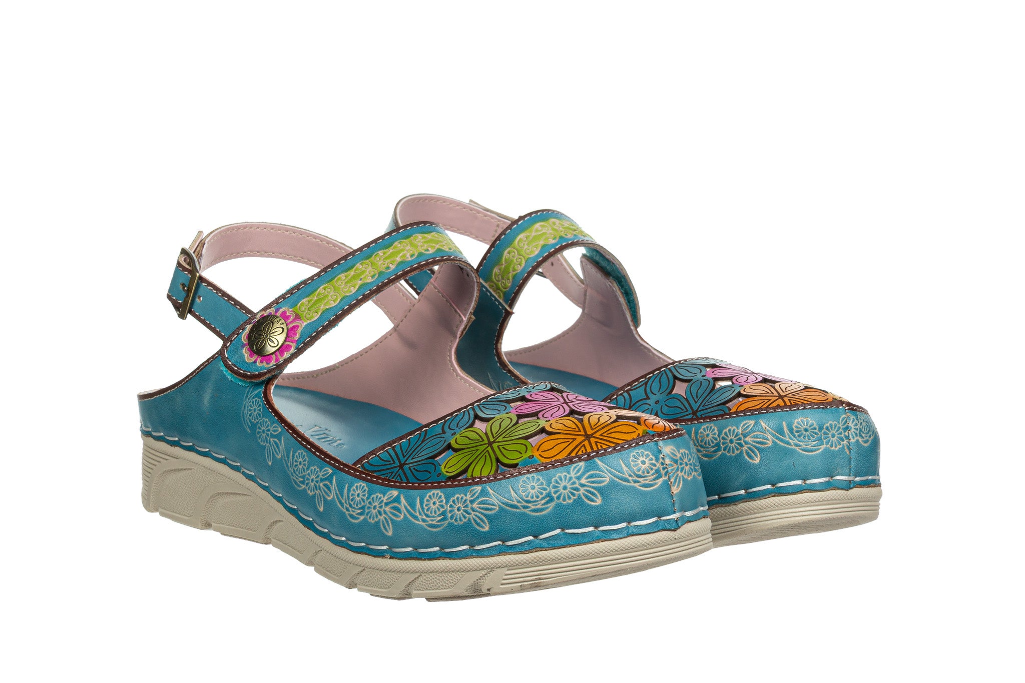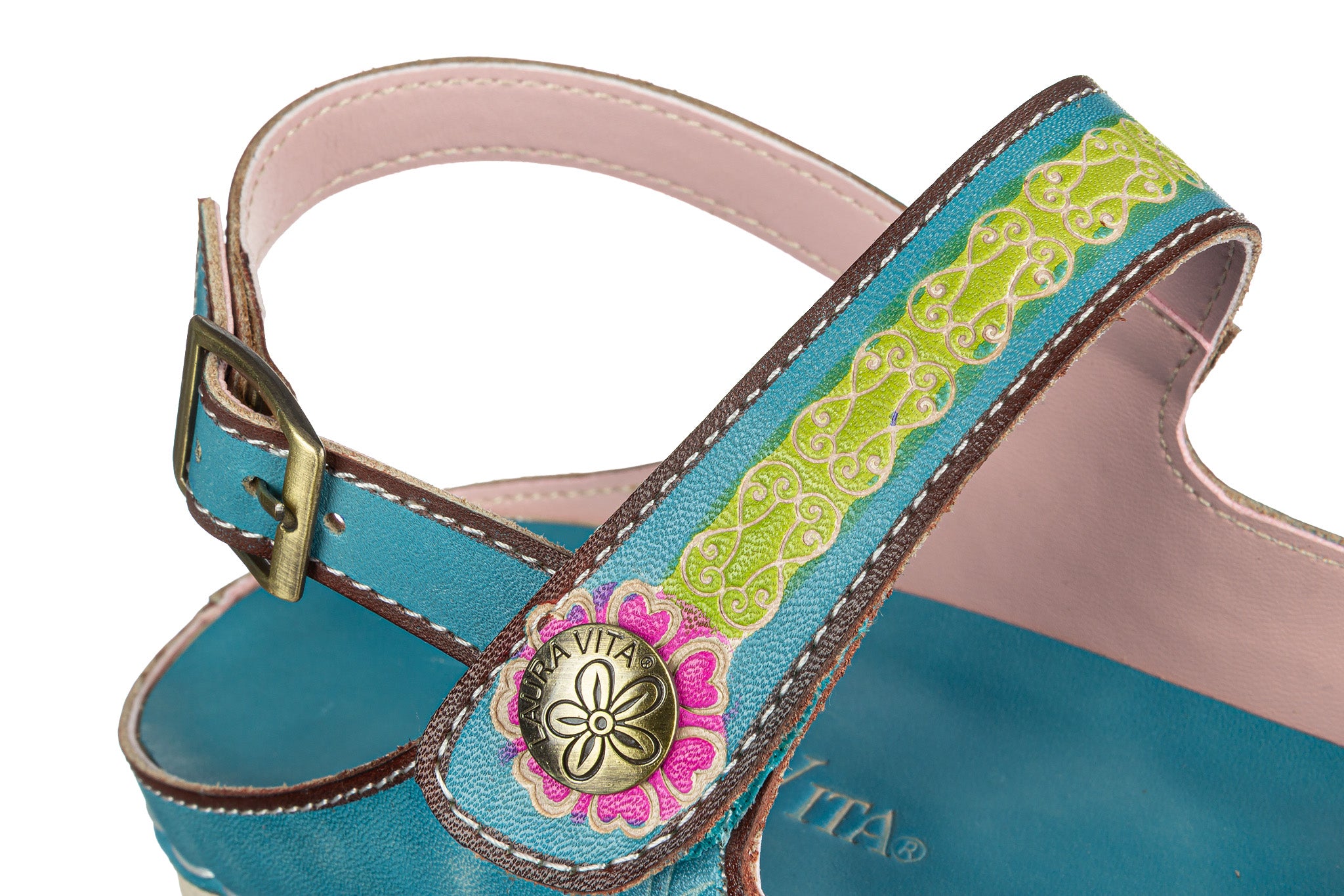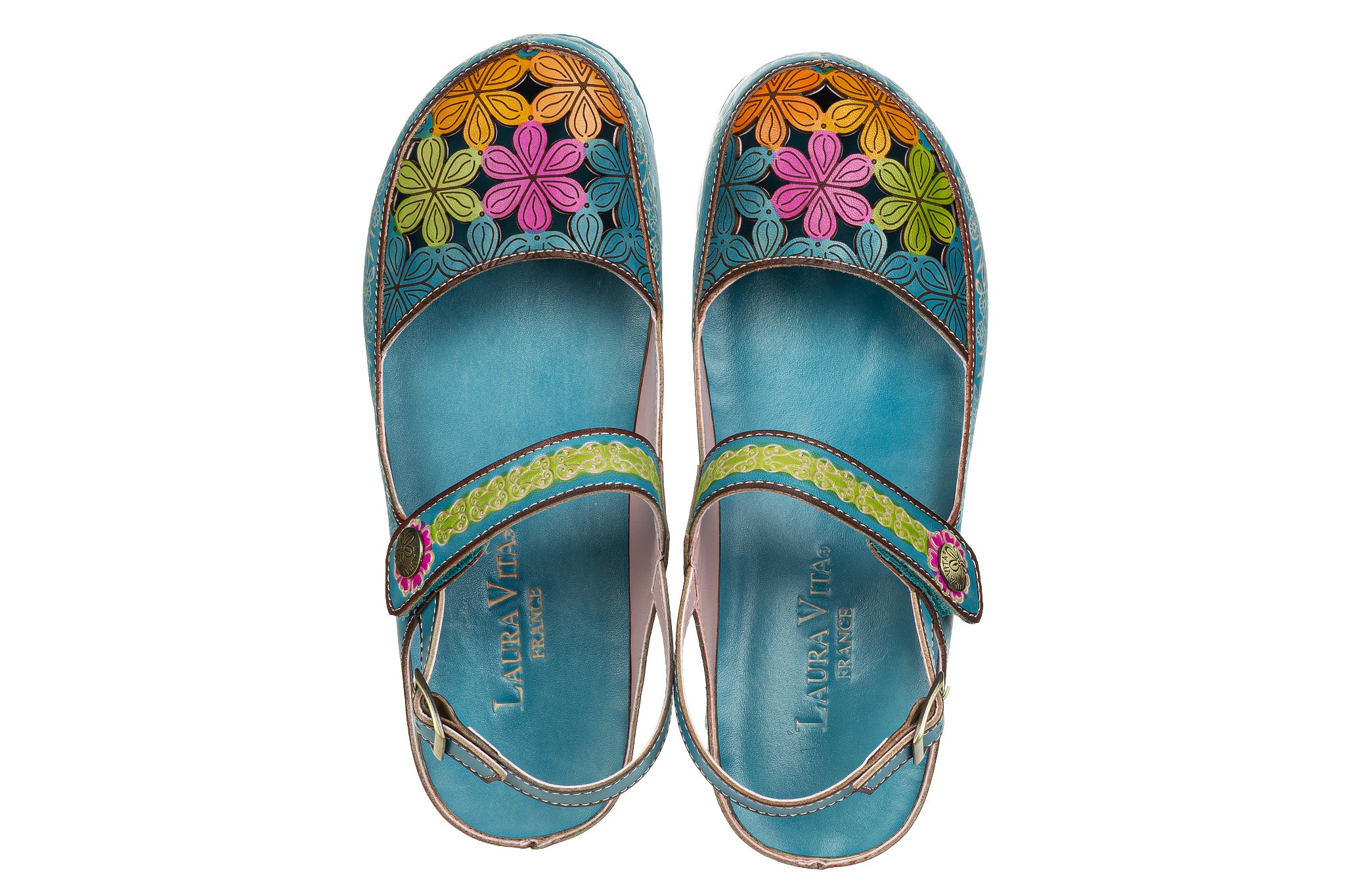 Sandały francuskiej marki Laura Vita wielokolorowe z dominującym turkusem, ozdobione barwnym kwiatowym wzorem.