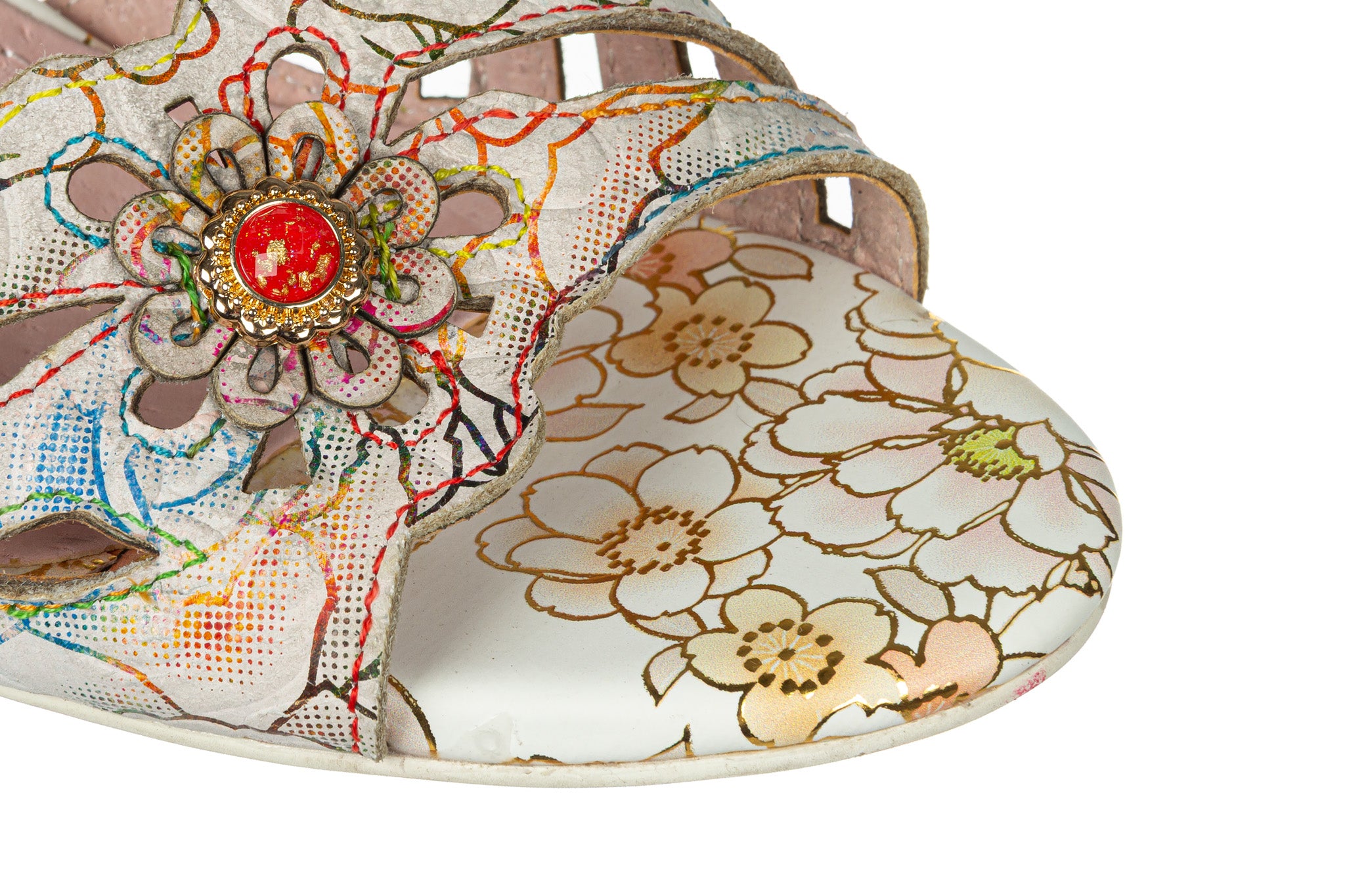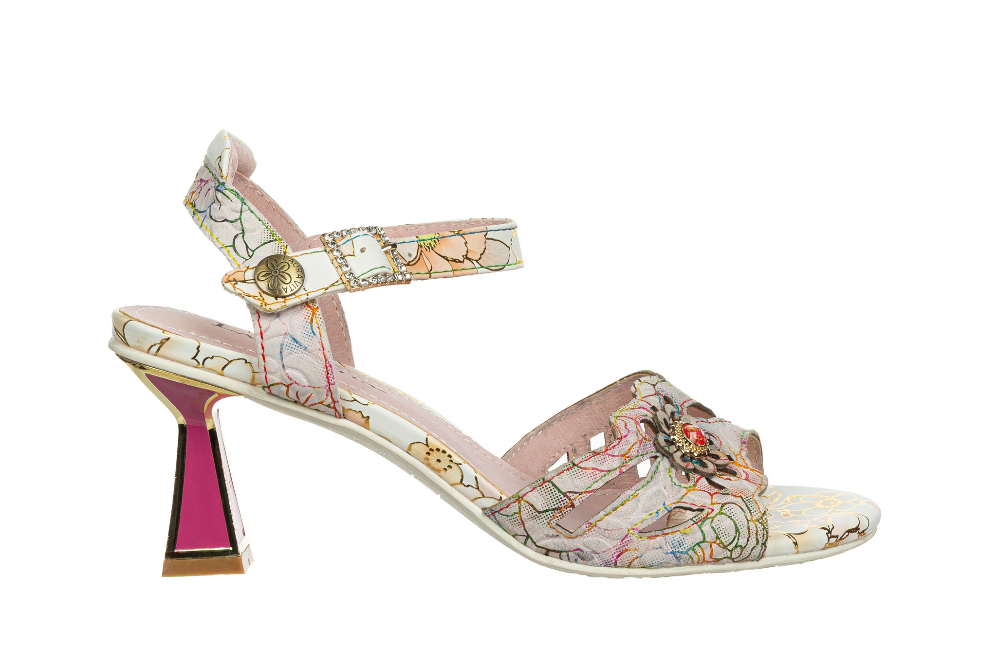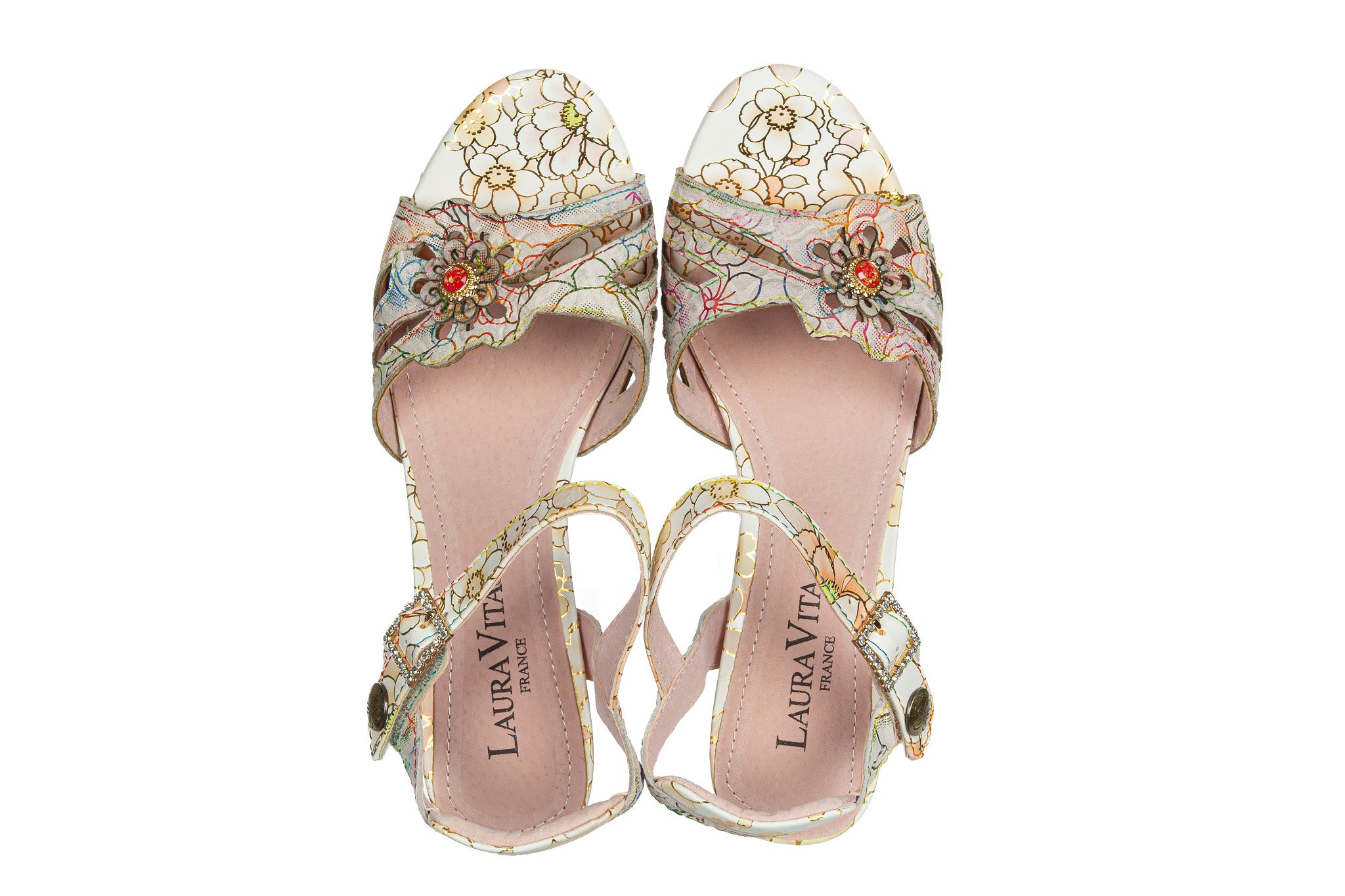 Sandały francuskiej marki Laura Vita w jasnej, kremowej bazie z wielokolorowym kwiatowym wzorem oraz złotymi akcentami.
