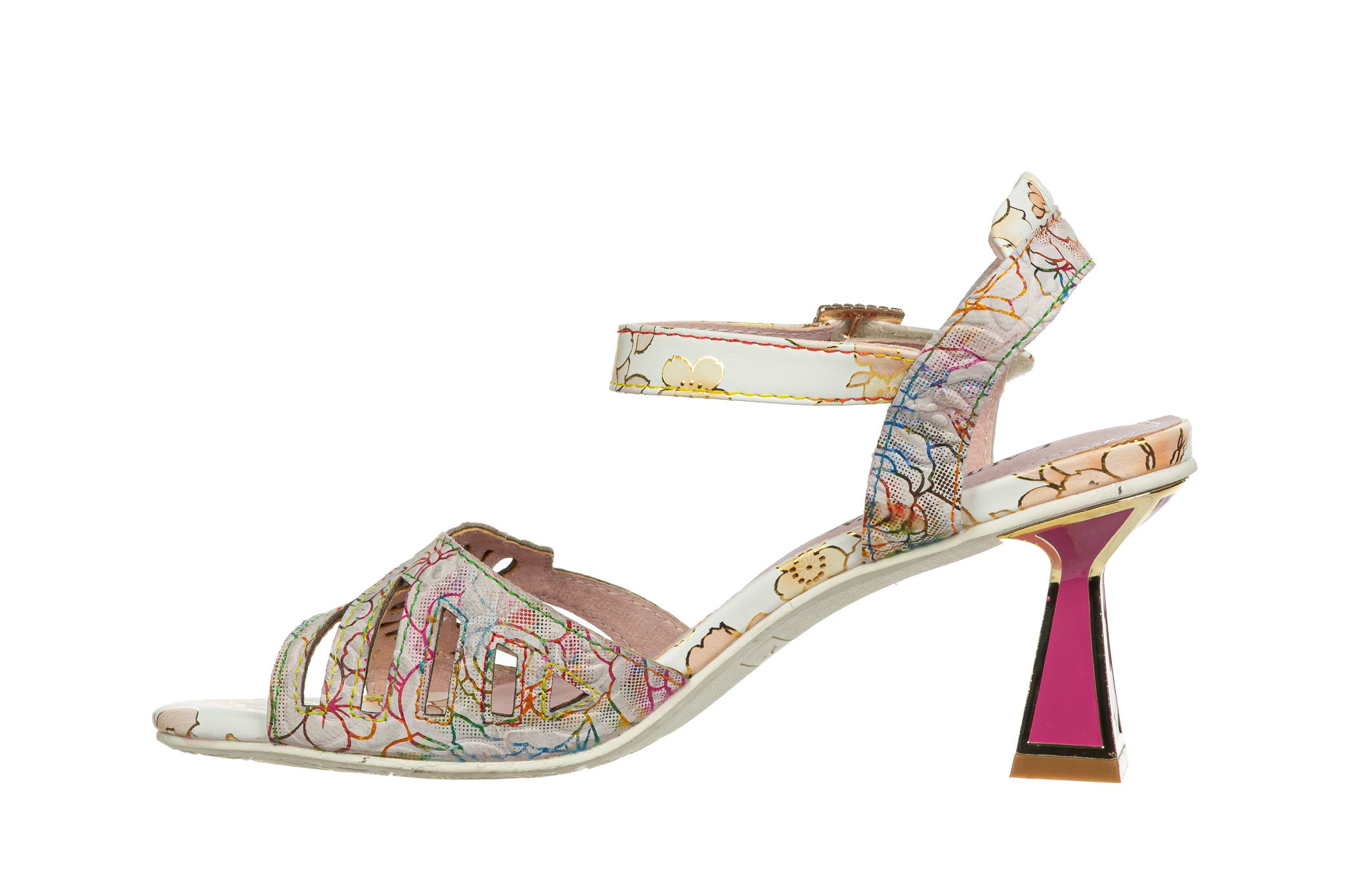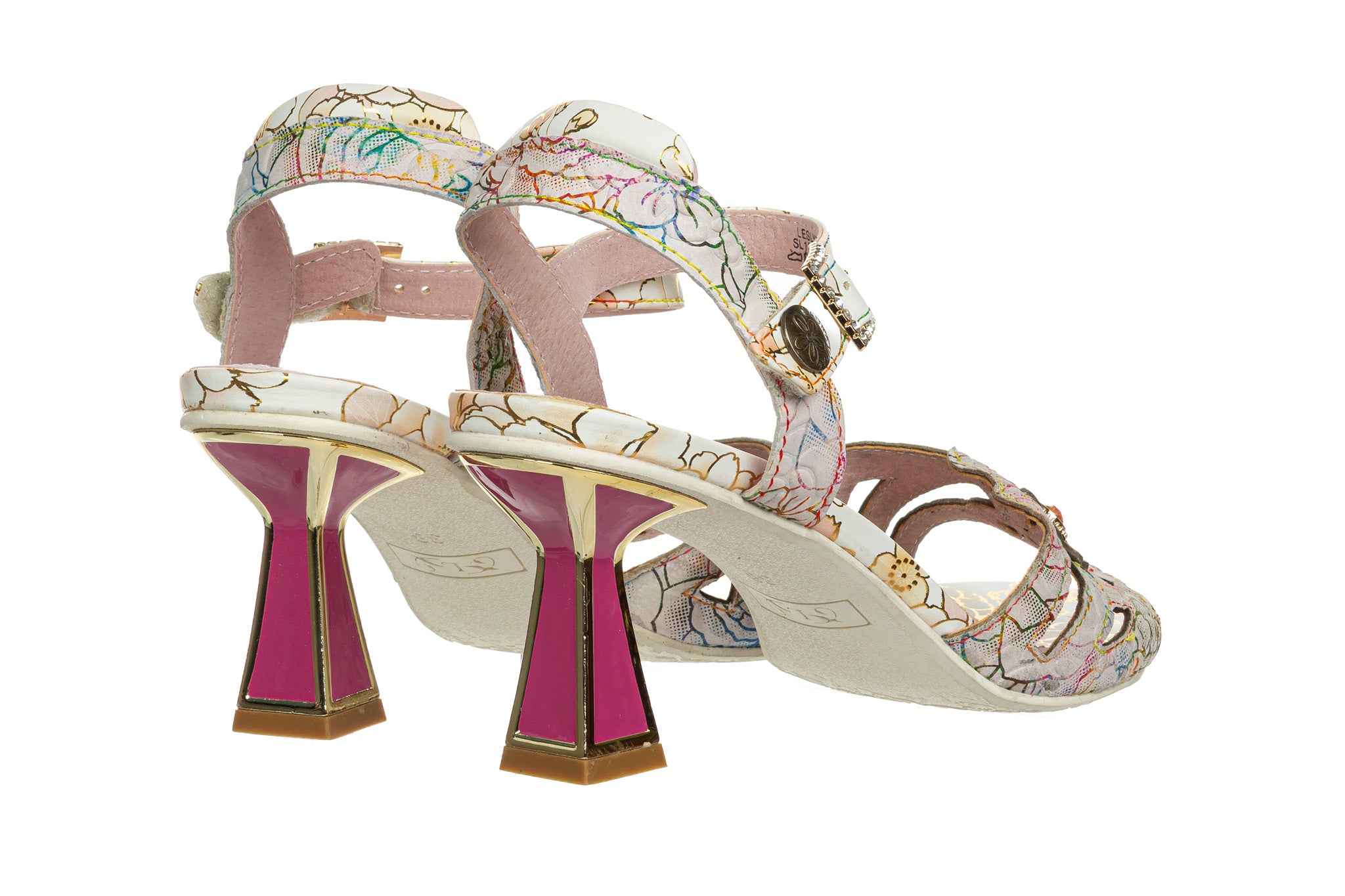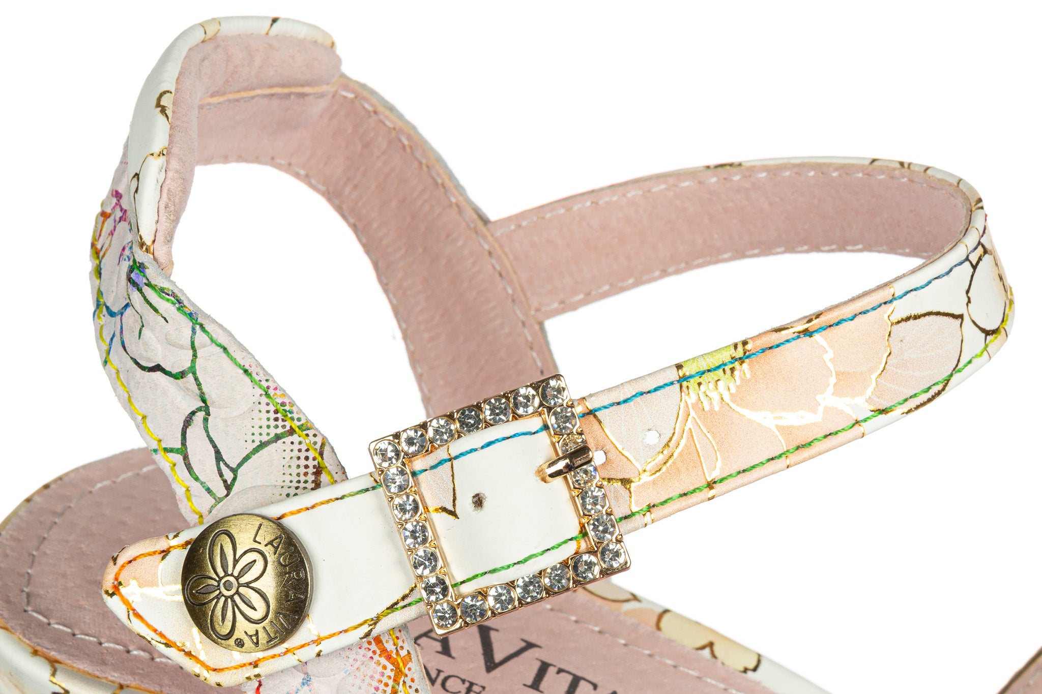 Sandały francuskiej marki Laura Vita w jasnej, kremowej bazie z wielokolorowym kwiatowym wzorem oraz złotymi akcentami.
