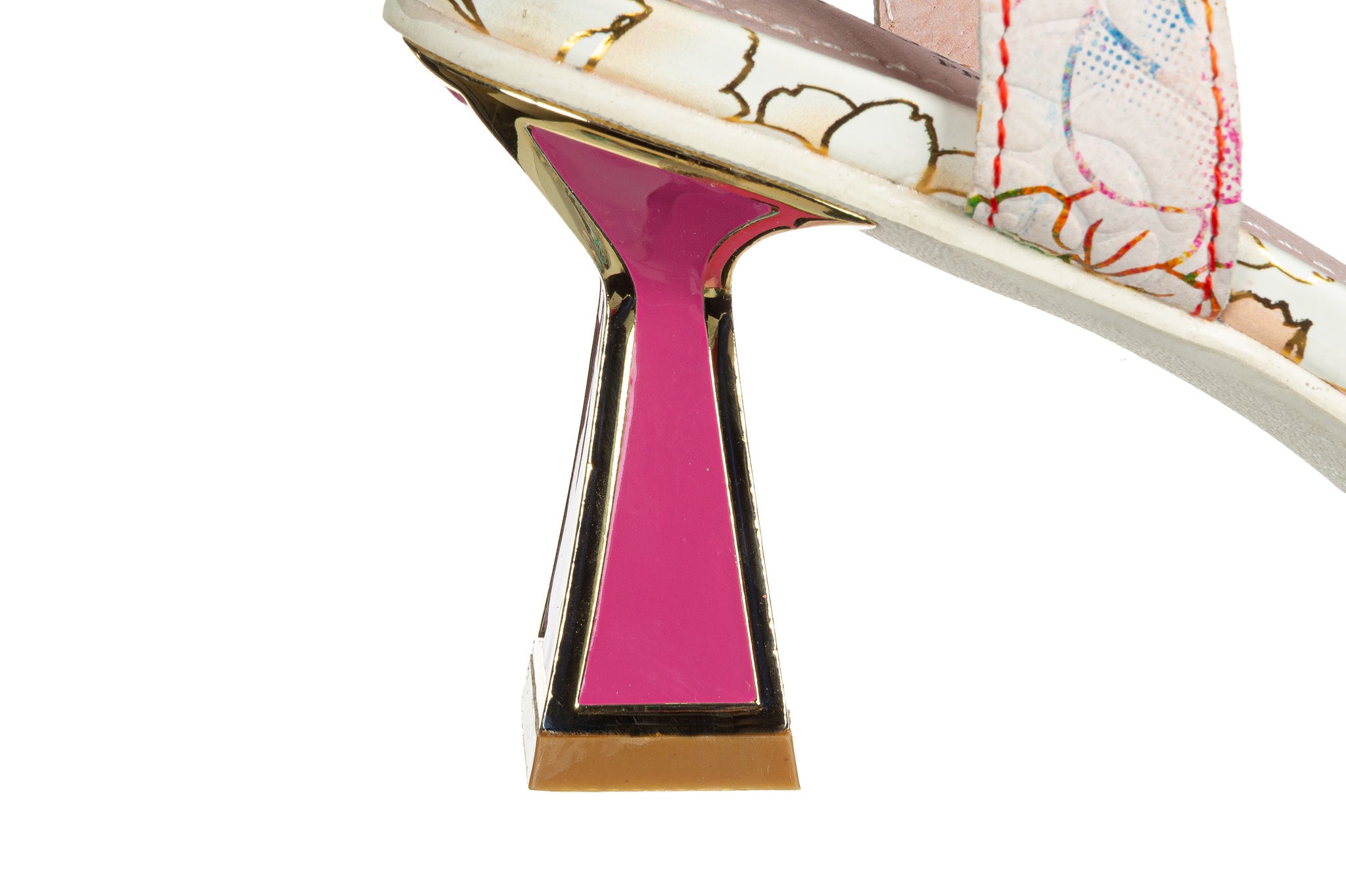 Obcas geometryczny, lekko rozszerzany ku dołowi, w różowym kolorze ze złotym wykończeniem.