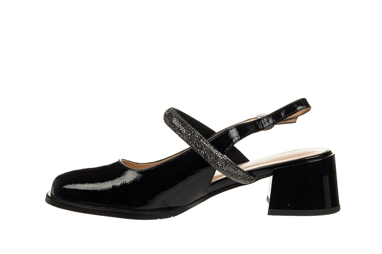Sandały damskie na obcasie wykonane z wysokojakościowej miękkiej skóry naturalnej lakierowanej. Zapinanie na sprzączkę. Wnętrze z naturalnej skóry. Niezwykle miękka, skórzana wkładka. Podeszwa z gumy o właściwościach antypoślizgowych. Pasek z mieniących cyrkonii.