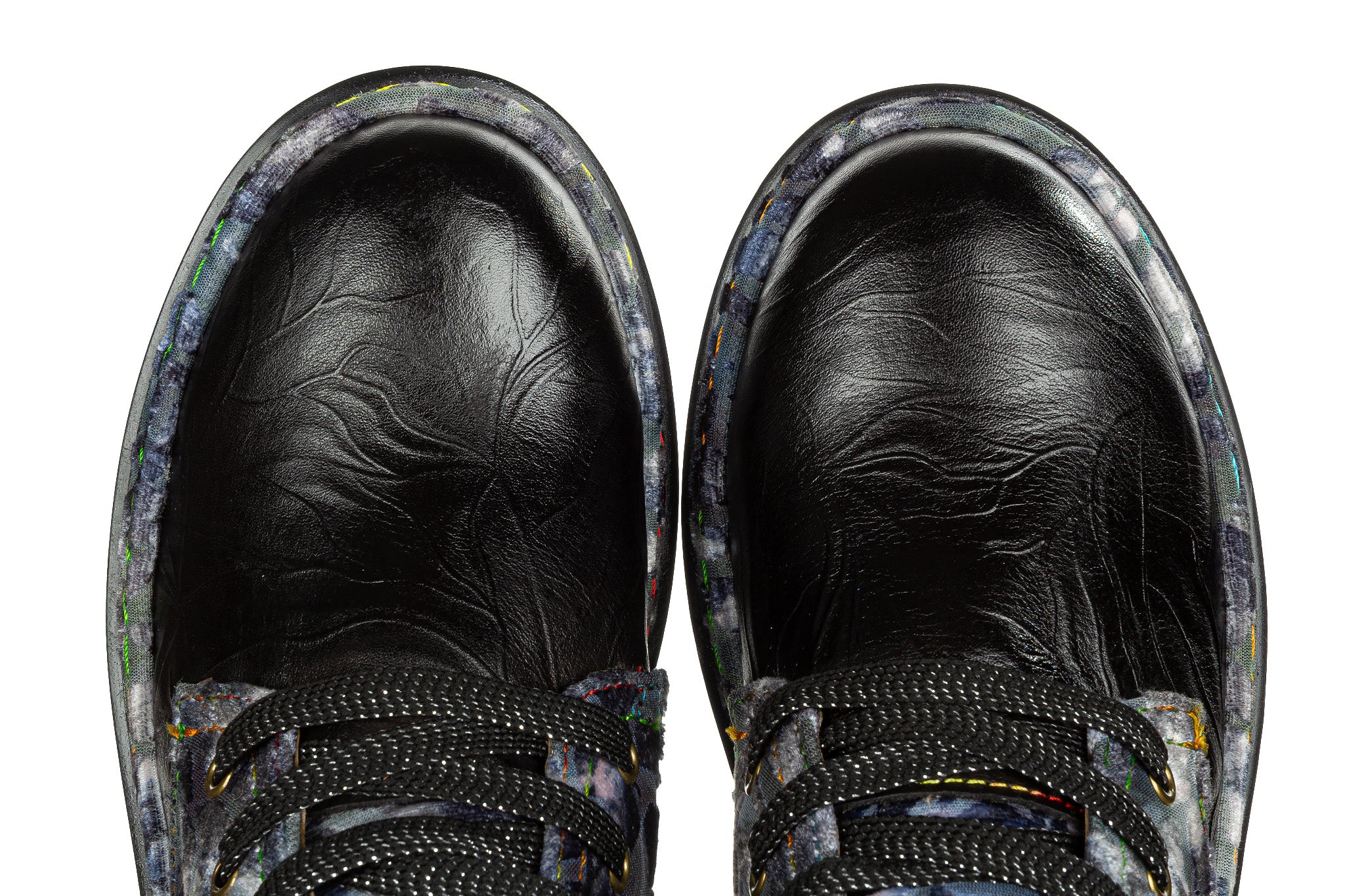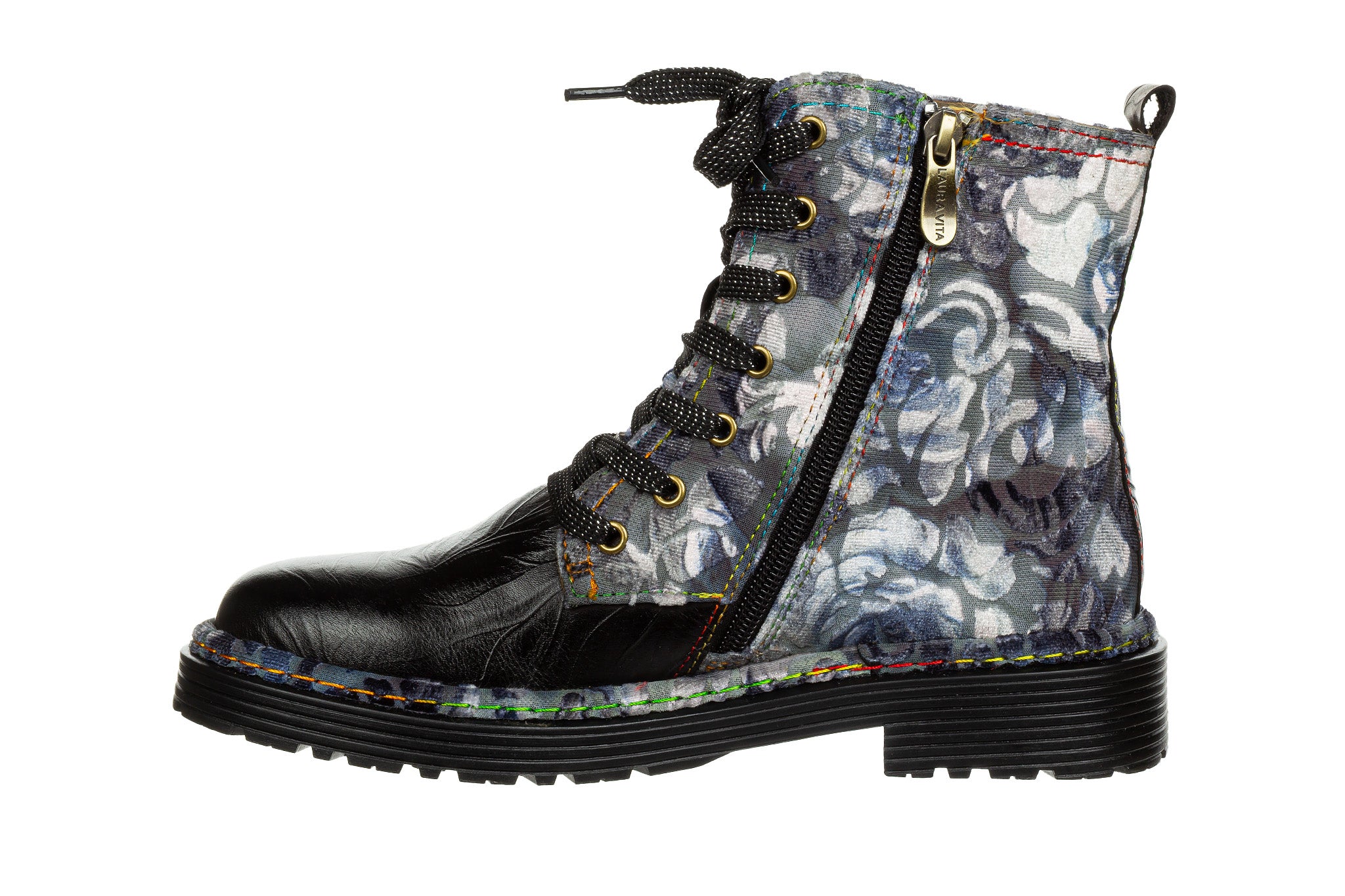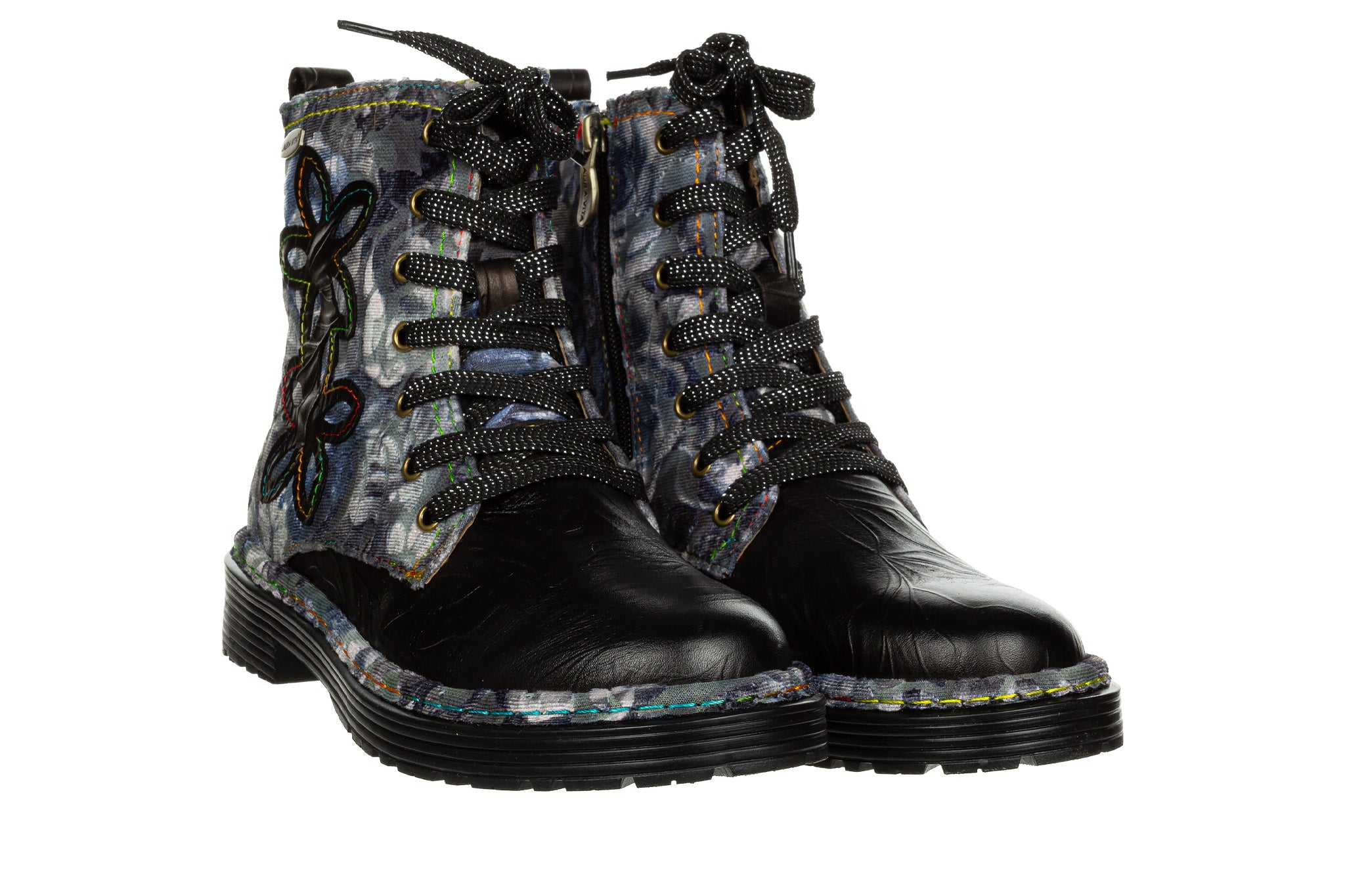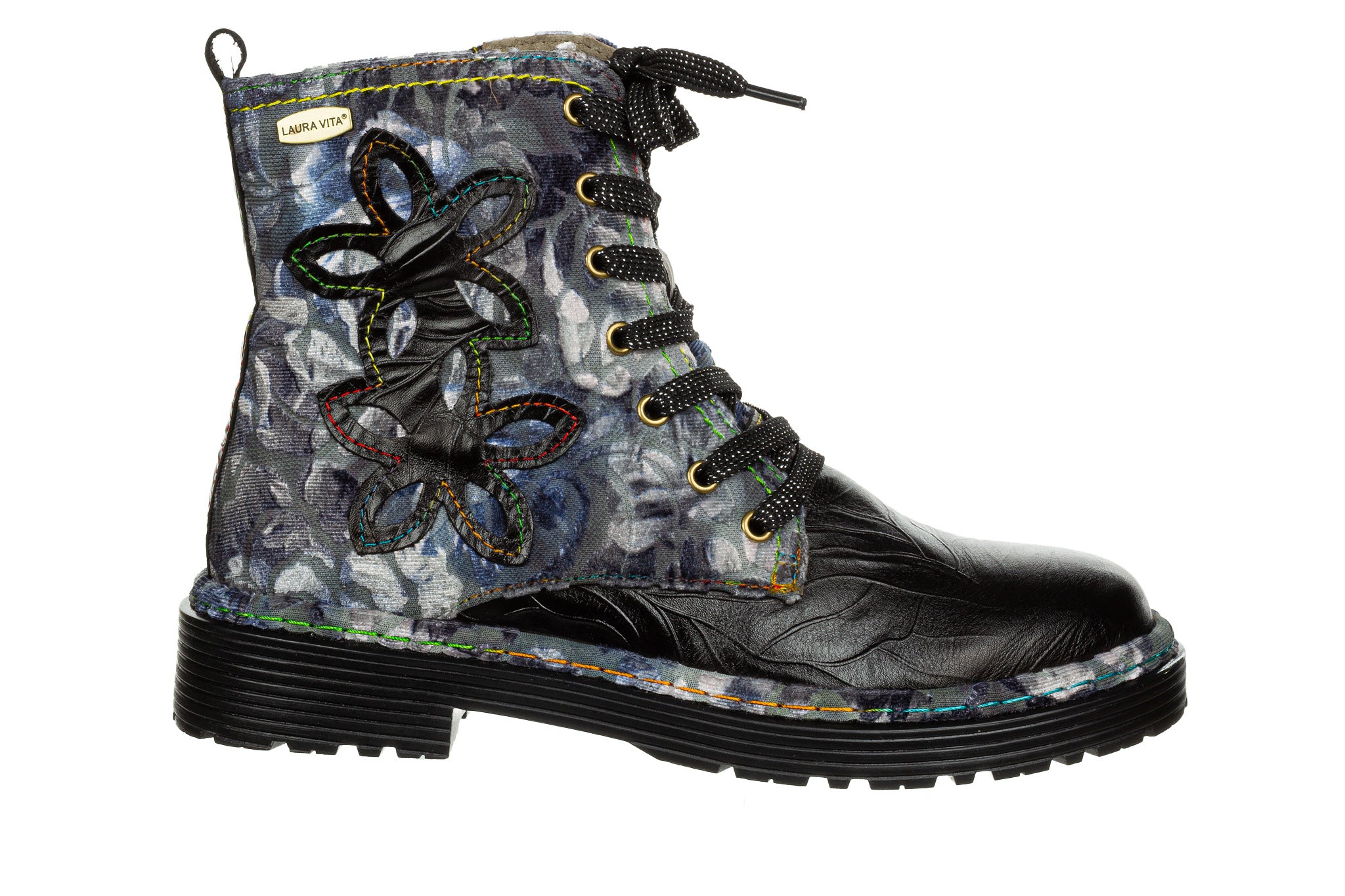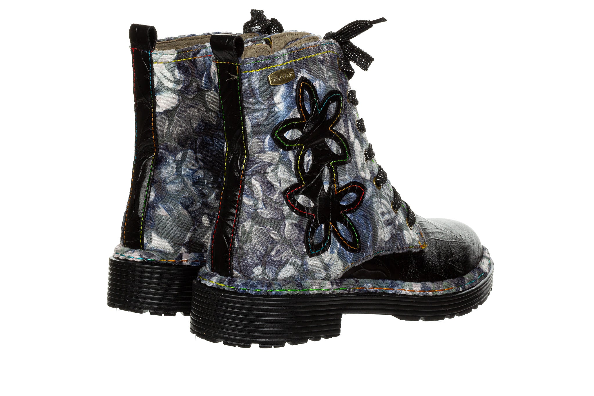 Trzewiki francuskiej marki Laura Vita w kolorach grafitu, czerni i szarości - przełamane subtelnymi akcentami fioletu i zieleni w kwiatowym motywie.