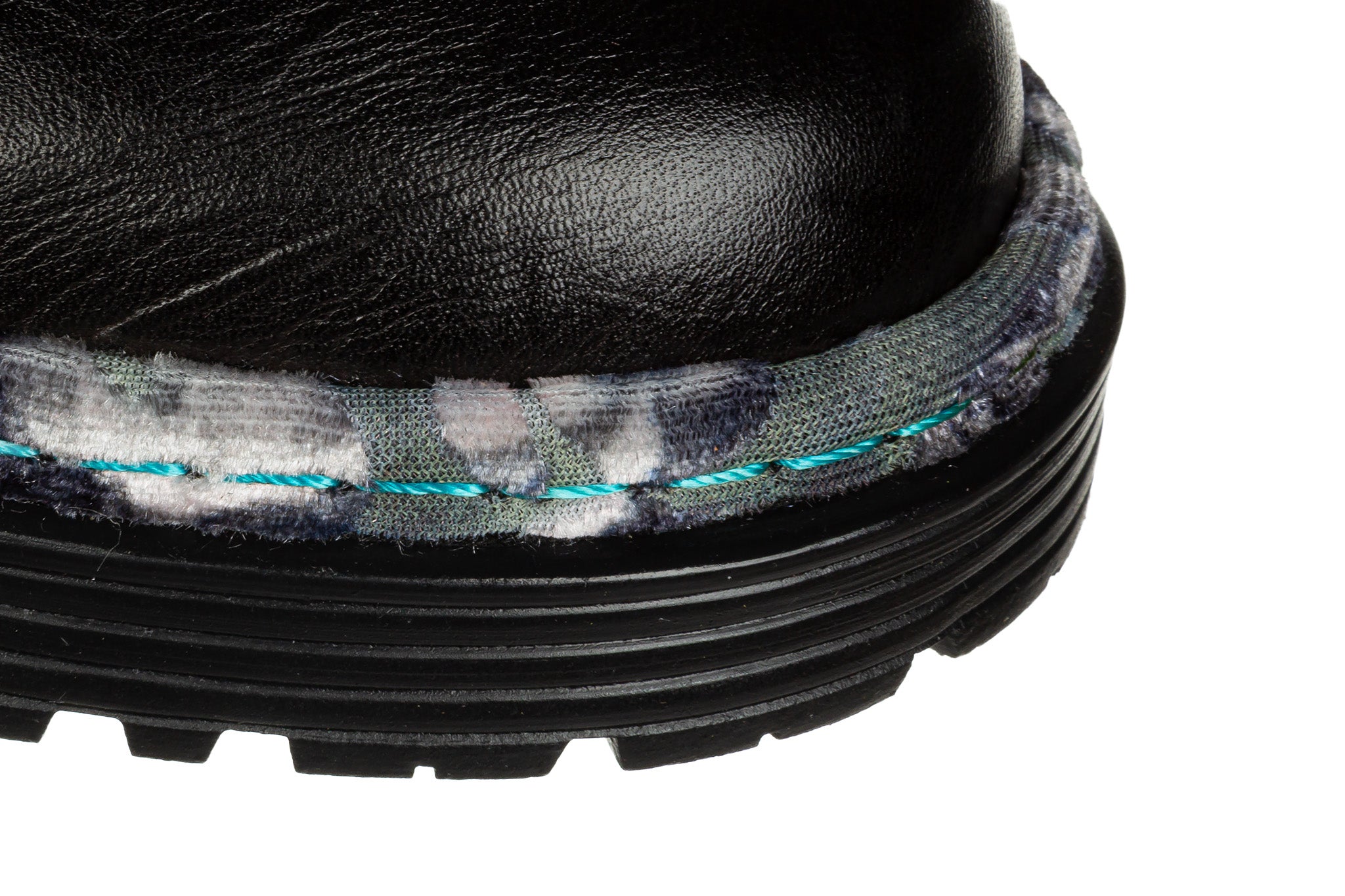 Połączenie gładkiej, miękkiej skóry z "roślinnym" tłoczeniem (na nosku i przy pięcie) z materiałem o wzorzystej fakturze na cholewce.