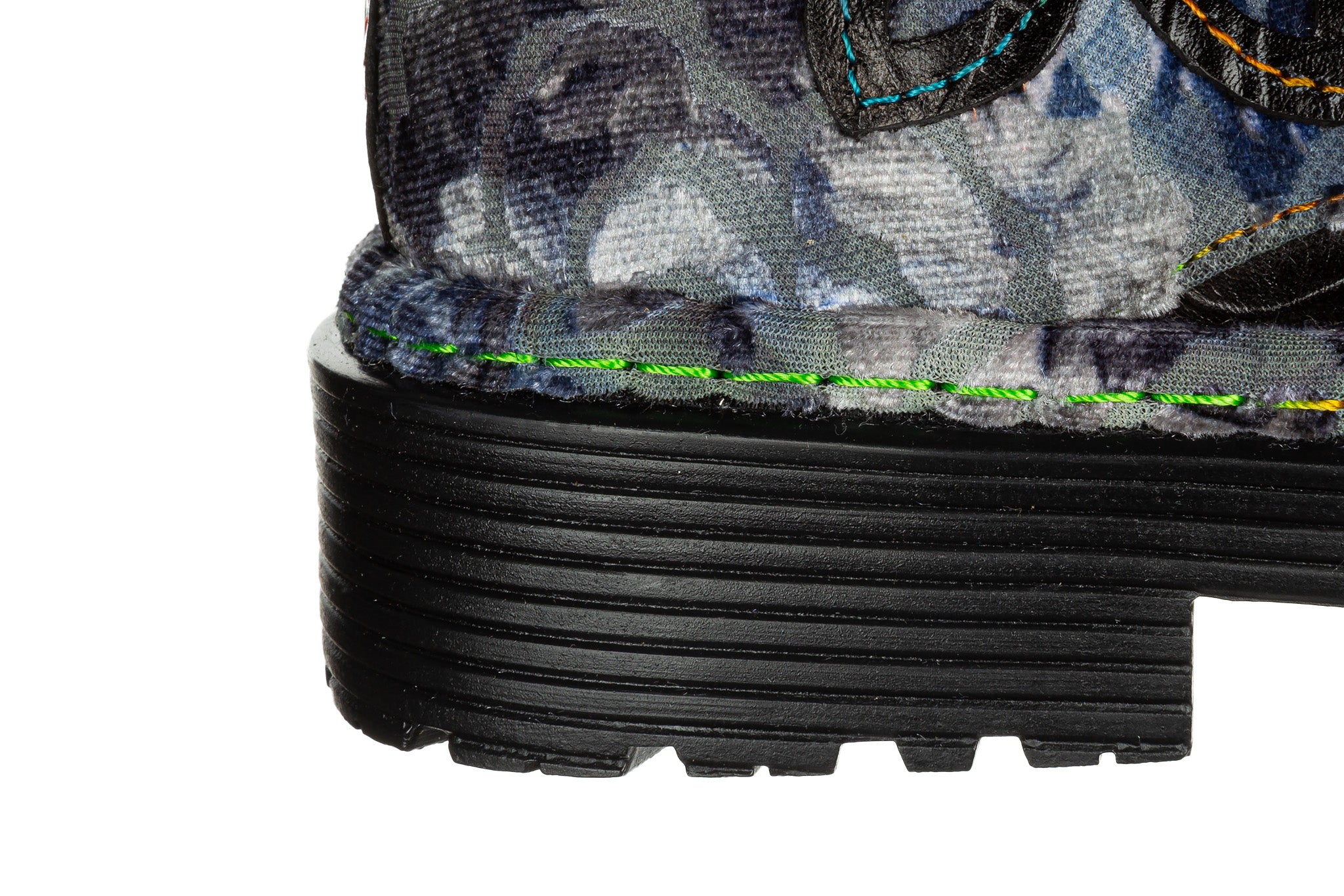 Podeszwa z wyraźnym bieżnikiem i dekoracyjnym przeszyciem wzdłuż krawędzi.
