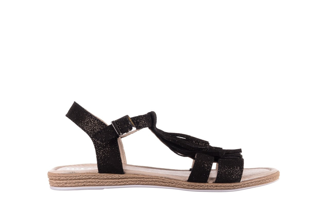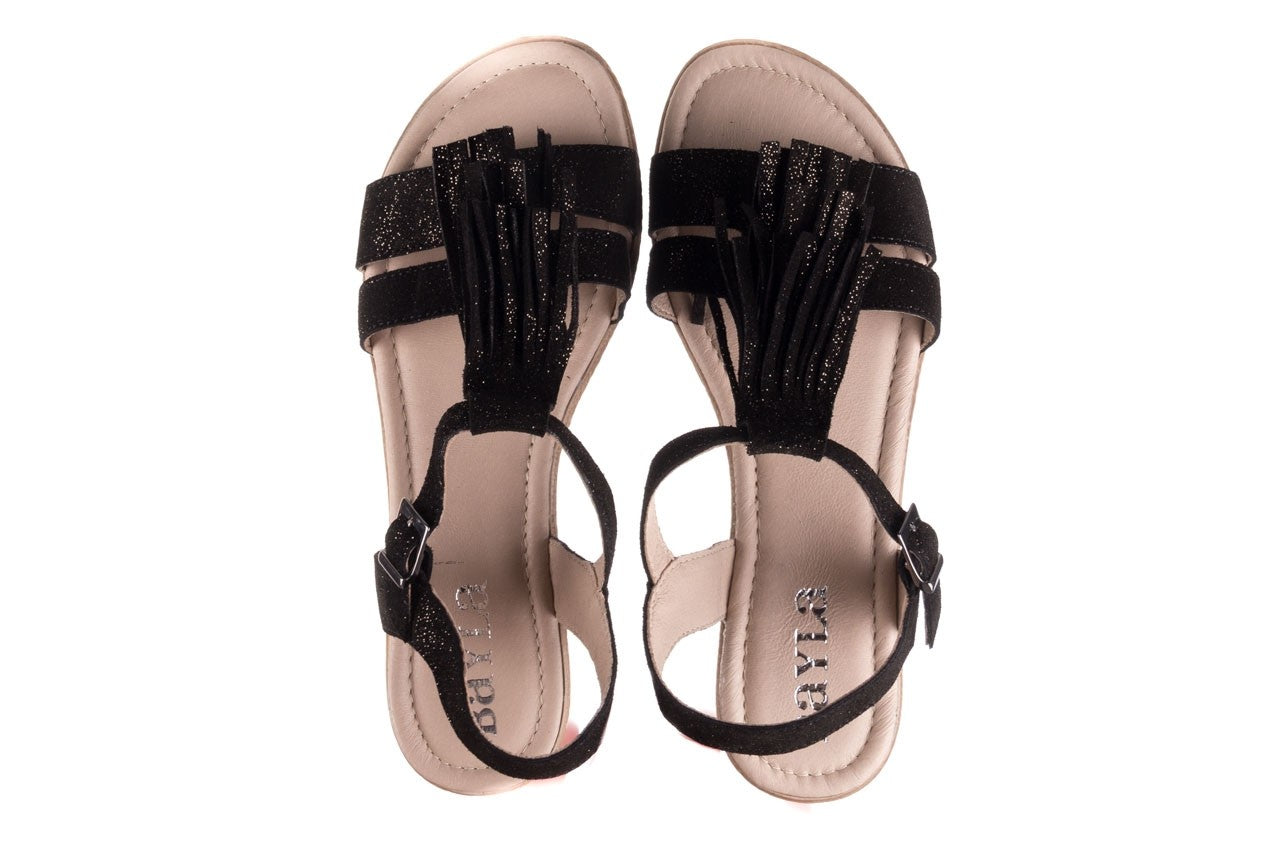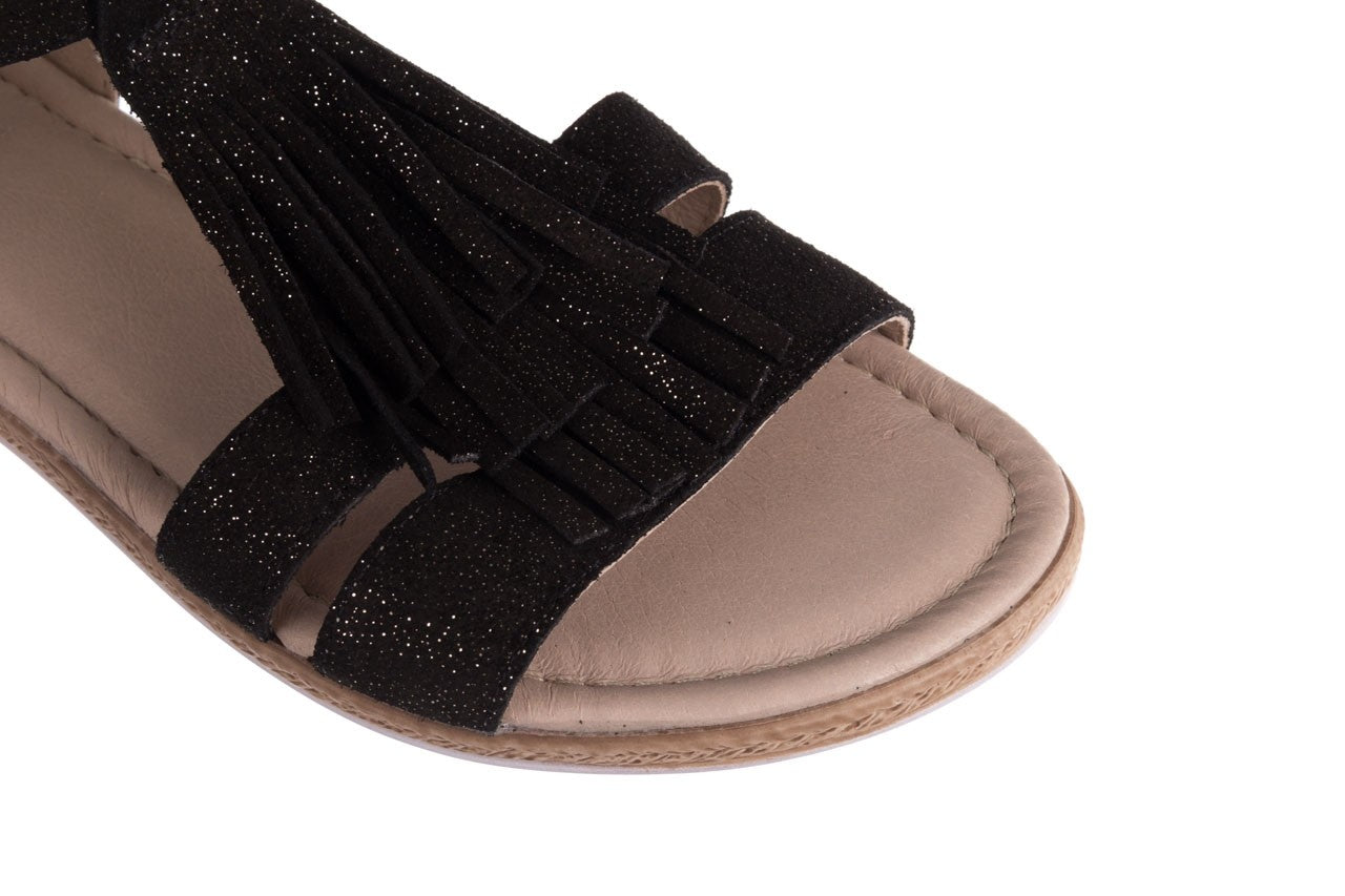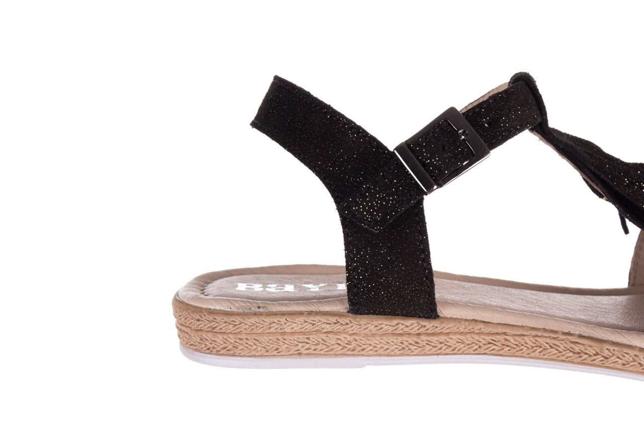 Sandały marki BAYLA wykonane są w całości z naturalnej skóry nubukowej w kolorze czarnym ozdobione złotym brokatem.