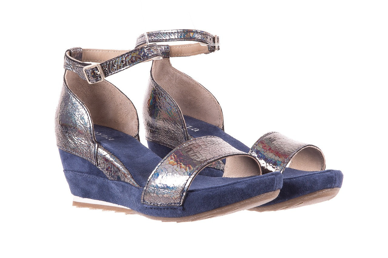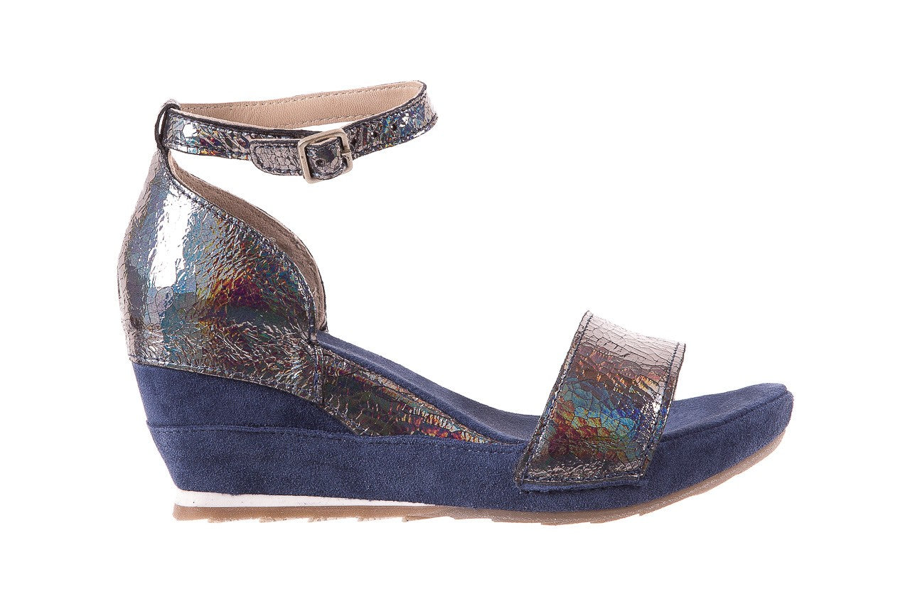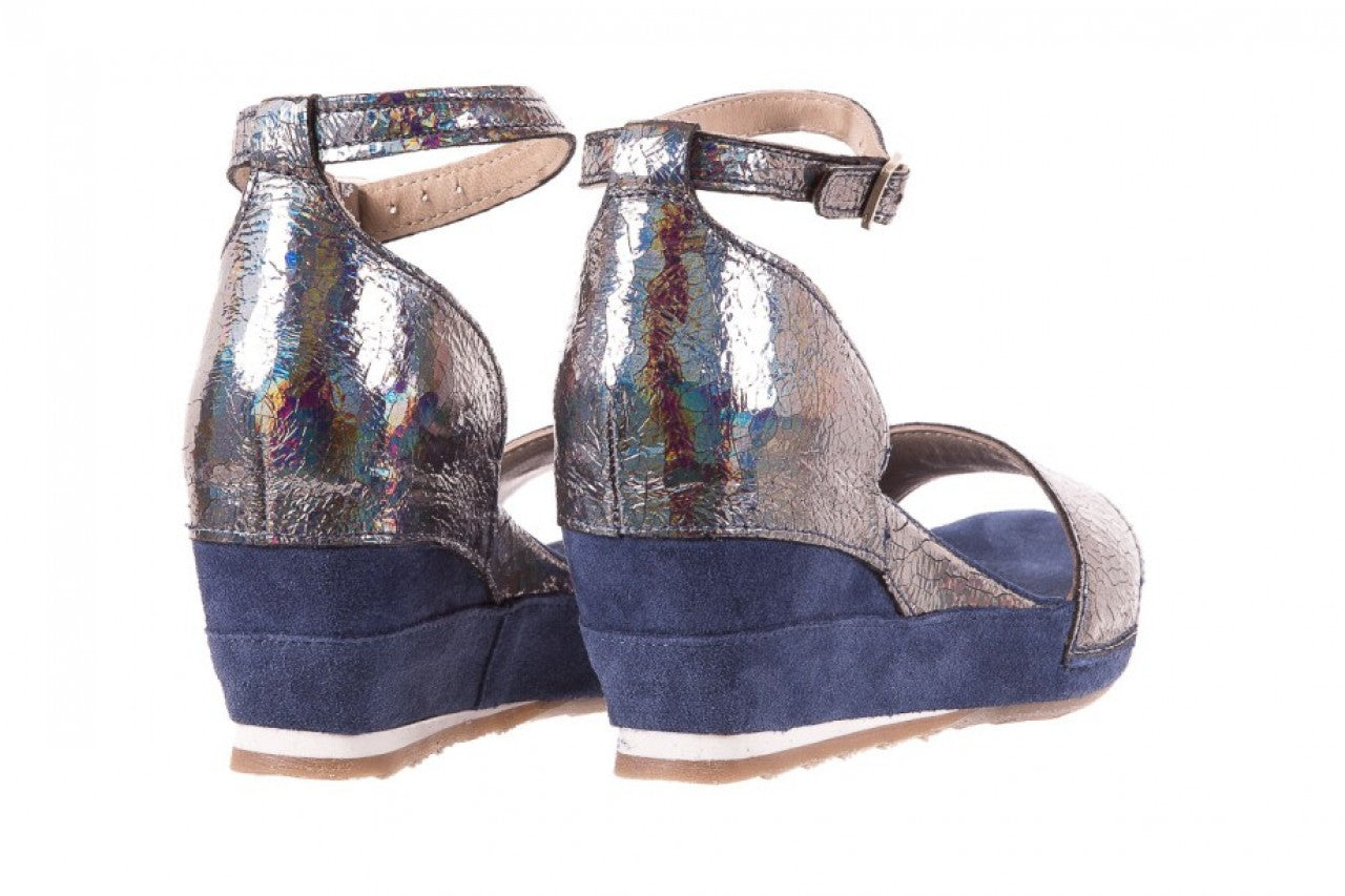 Buty wykonane z naturalnego zamszu w kolorze granatowym. Paski butów wykonane są ze skóry metalicznej w kolorze niklu (z efektem popękanej skóry).