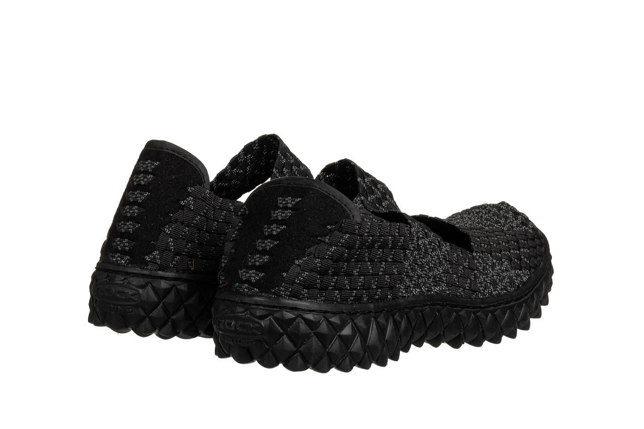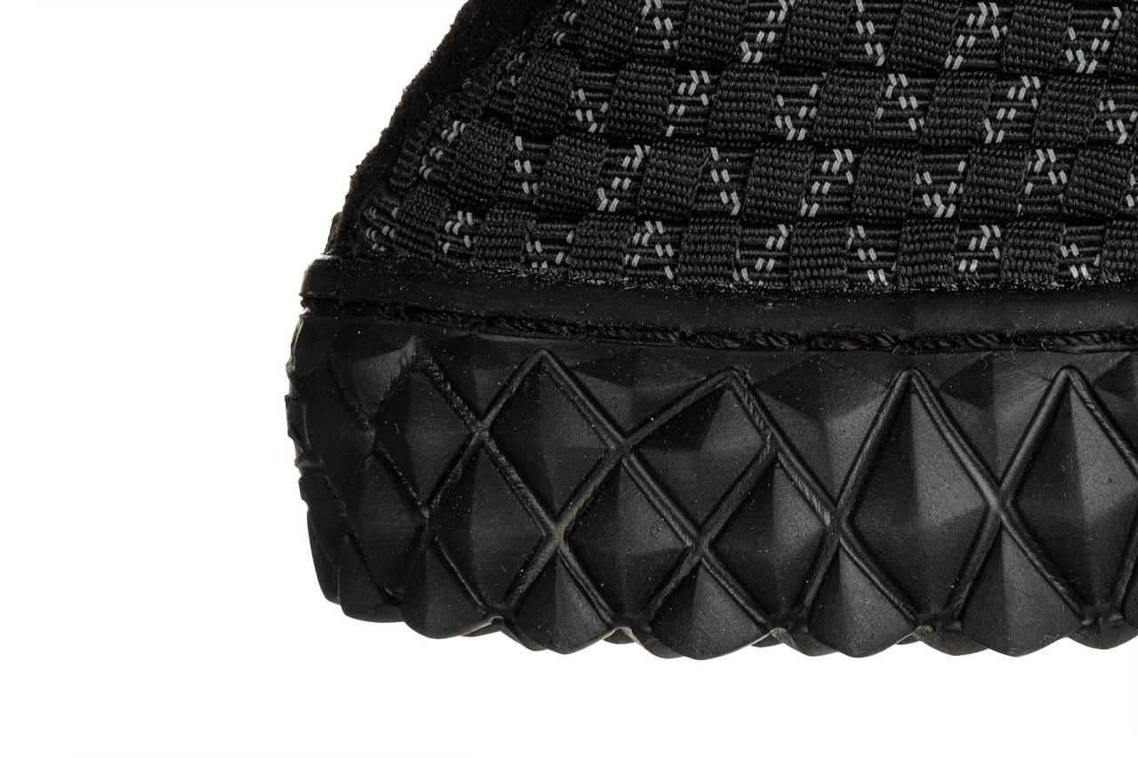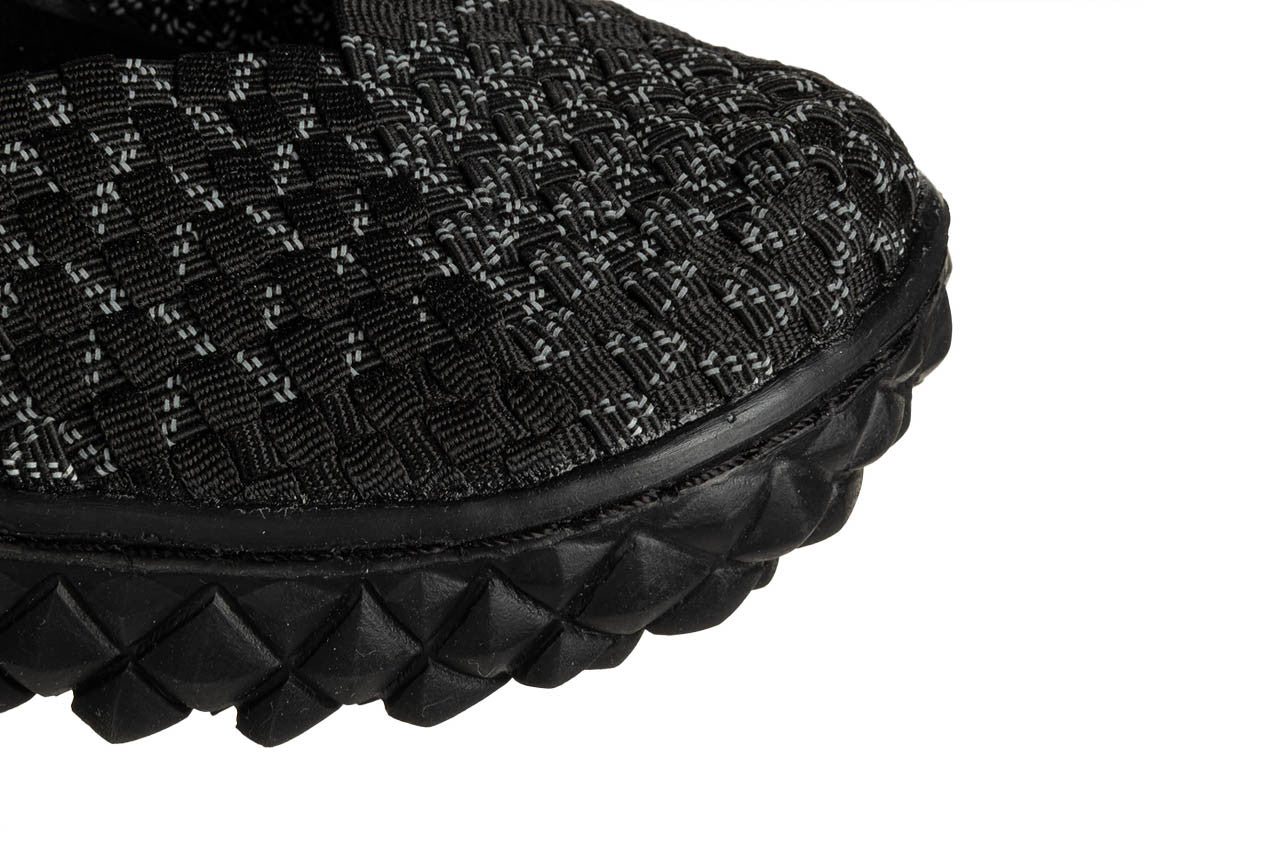 Plecione cholewki z wyjątkowo elastycznych gumek w kolorze czarnym idealnie dopasowują się do indywidualnego kształtu (tęgości) każdej stopy. Miękka, piankowa wkładka z profilowaniem przy podbiciu i pod piętą oraz lekkie, antypoślizgowe podeszwy sprawiają, że buty są bardzo wygodne. Ponadto zapiętek z miłego w dotyku zamszu niweluje możliwość otarć pięty. Przez środek biegnie gruby pleciony pasek utrzymujący stopę w miejscu. Dodatkowym atutem buta jest możliwość prania w temperaturze 40 stopni.
