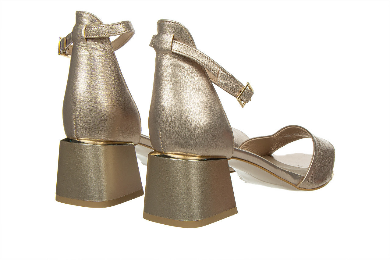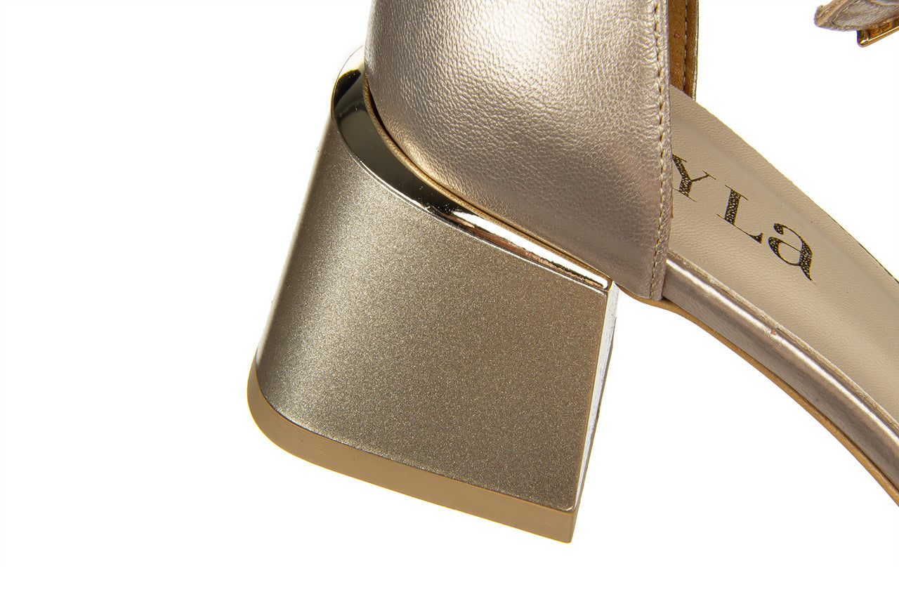 Sandały eleganckie z zakrytą piętą na stabilnym słupku. Opływowy kształt paska sprawia, że buty dobrze trzymają stopę. Zapięcie na klamerkę na pasku okalającym kostkę. Ozdoba na przodzie, wykończenie obcasa, czubka buta oraz sprzączka w złotym kolorze.