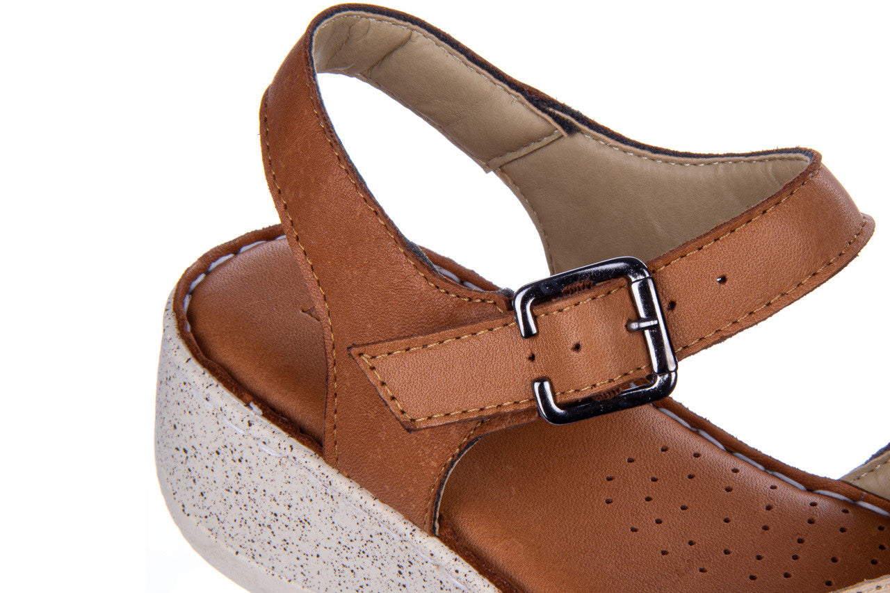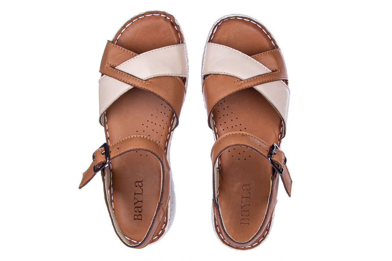 Sandały marki BAYLA wykonane są w całości z naturalnej skóry licowej w kolorze brązowo-beżowym.