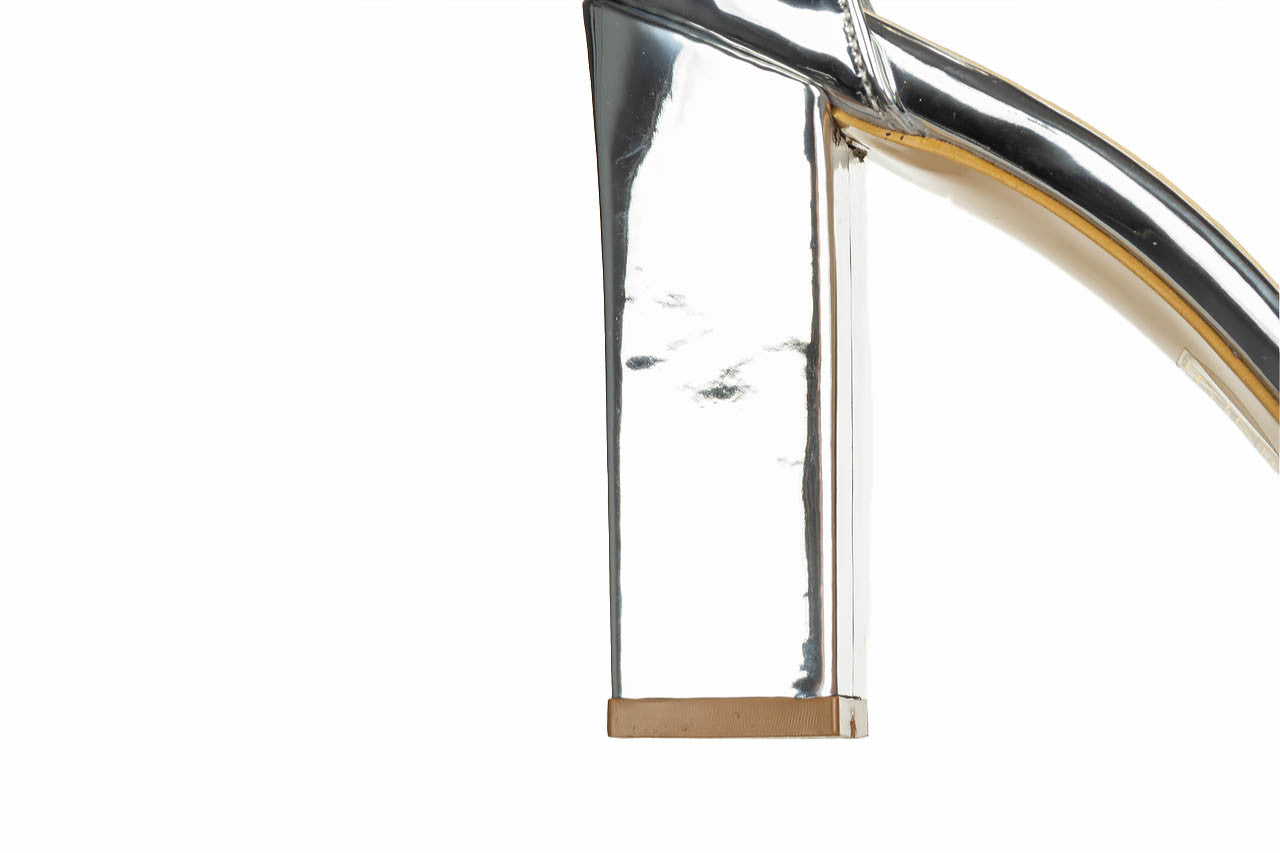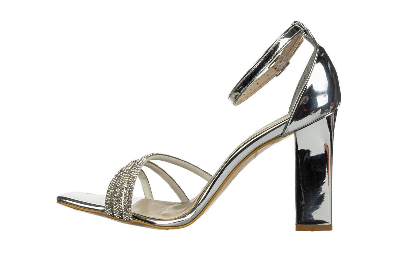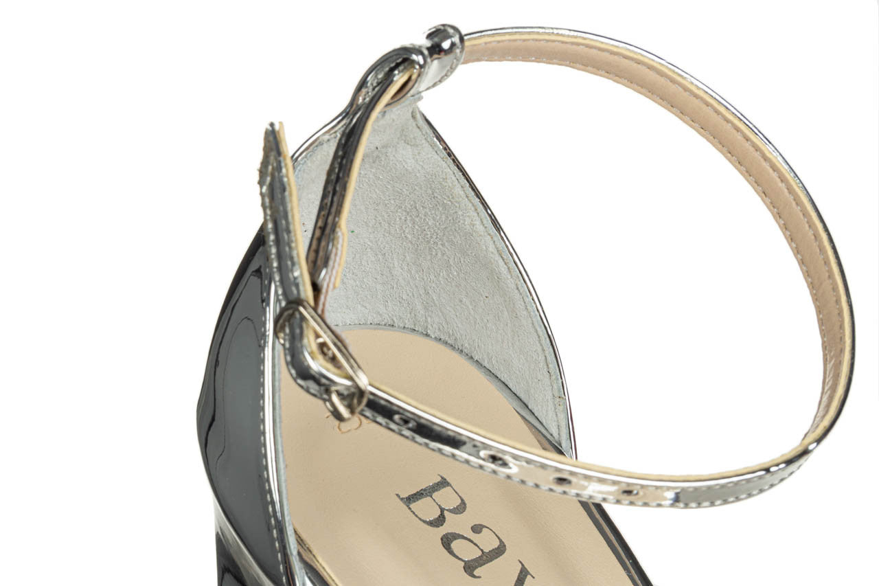 Sandały marki Bayla wykonane ze skóry ekologicznej w kolorze srebrnym, lakierowane.
