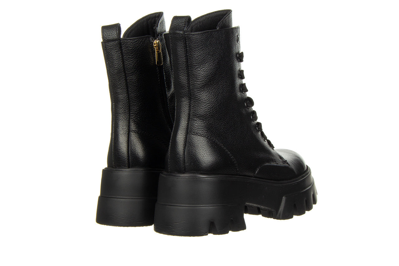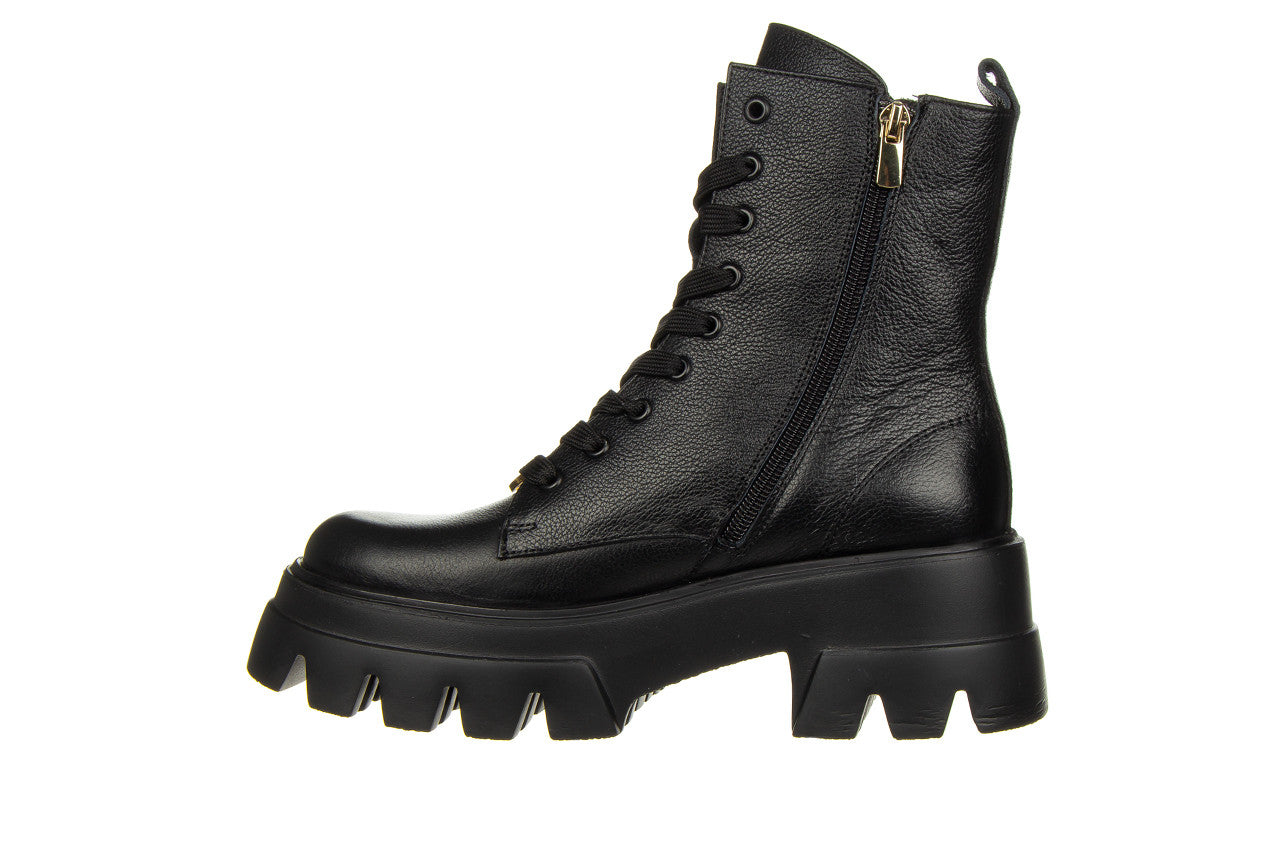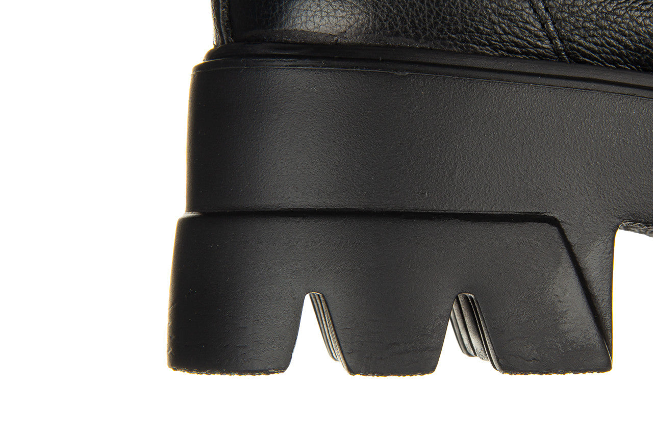 Wyższa cholewka wykonana jest z bardzo miękkiej skóry naturalnej wysokiej jakości. Dzięki sznurowaniom można idealnie dopasować buty do tęgości stopy, natomiast wygodny zamek z wewnętrznej strony ułatwia szybkie zakładanie i zdejmowanie obuwia. Antypoślizgowa, gumowa podeszwa z głębszym bieżnikiem amortyzuje wstrząsy oraz izoluje stopę od zimnego podłoża. Platforma dodaje centymetrów i przy tym sprawia, że buty stają się bardzo wygodne. Wkładka oraz cholewka ocieplana, wyścielona od wewnątrz ciepłym polarem obuwniczym.