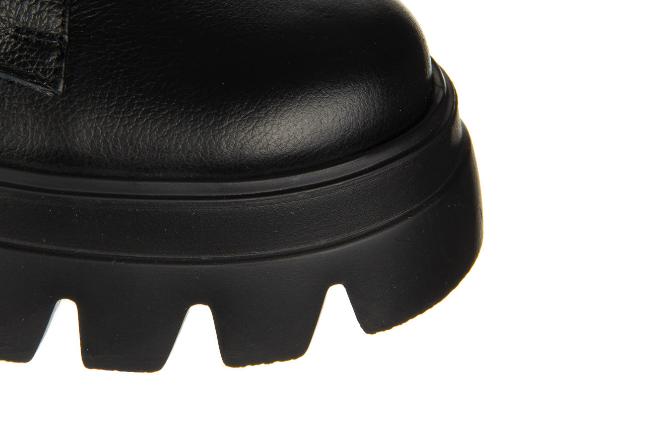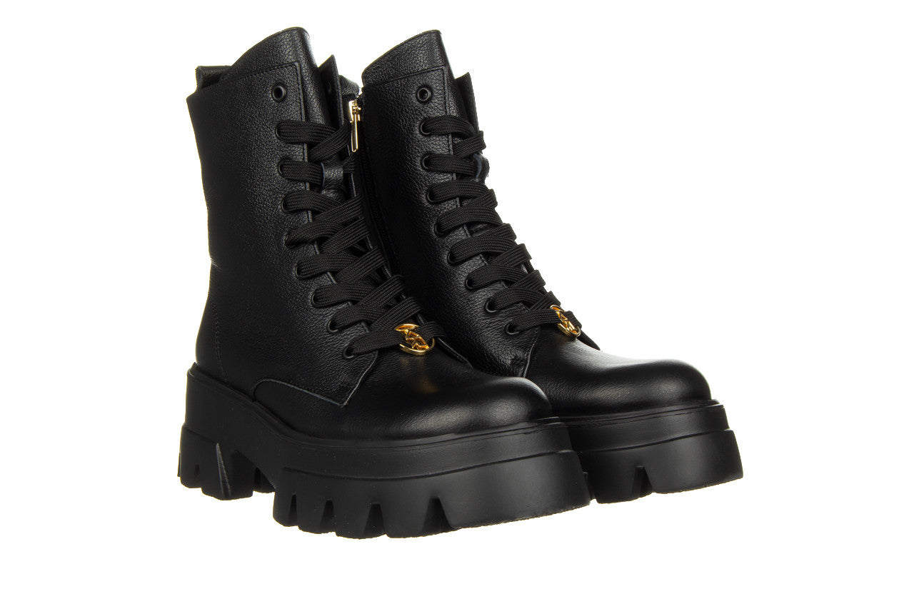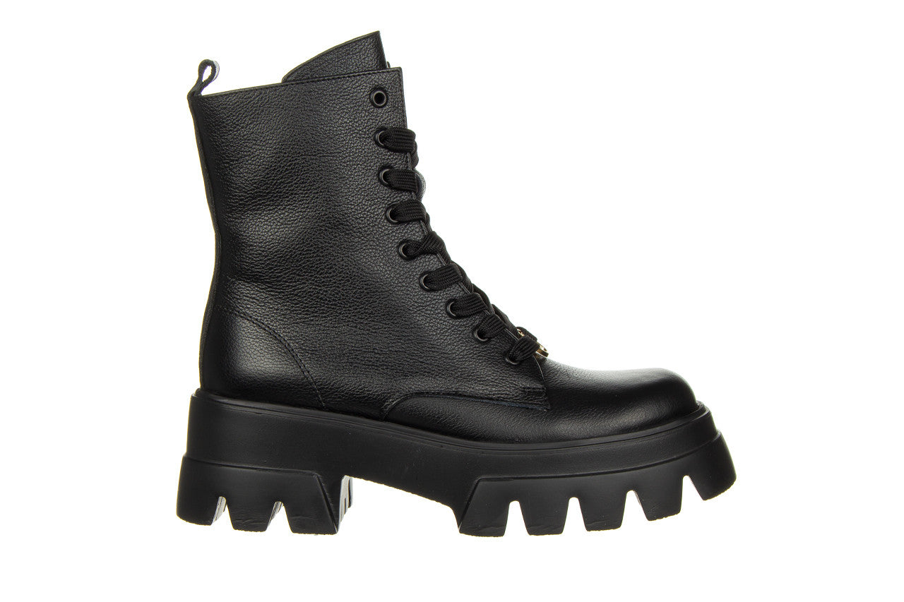 Wyższa cholewka wykonana jest z bardzo miękkiej skóry naturalnej wysokiej jakości. Dzięki sznurowaniom można idealnie dopasować buty do tęgości stopy, natomiast wygodny zamek z wewnętrznej strony ułatwia szybkie zakładanie i zdejmowanie obuwia. Antypoślizgowa, gumowa podeszwa z głębszym bieżnikiem amortyzuje wstrząsy oraz izoluje stopę od zimnego podłoża. Platforma dodaje centymetrów i przy tym sprawia, że buty stają się bardzo wygodne. Wkładka oraz cholewka ocieplana, wyścielona od wewnątrz ciepłym polarem obuwniczym.
